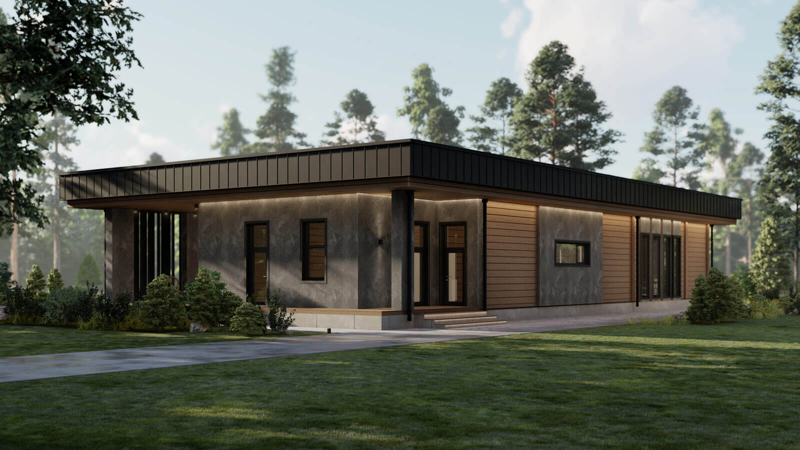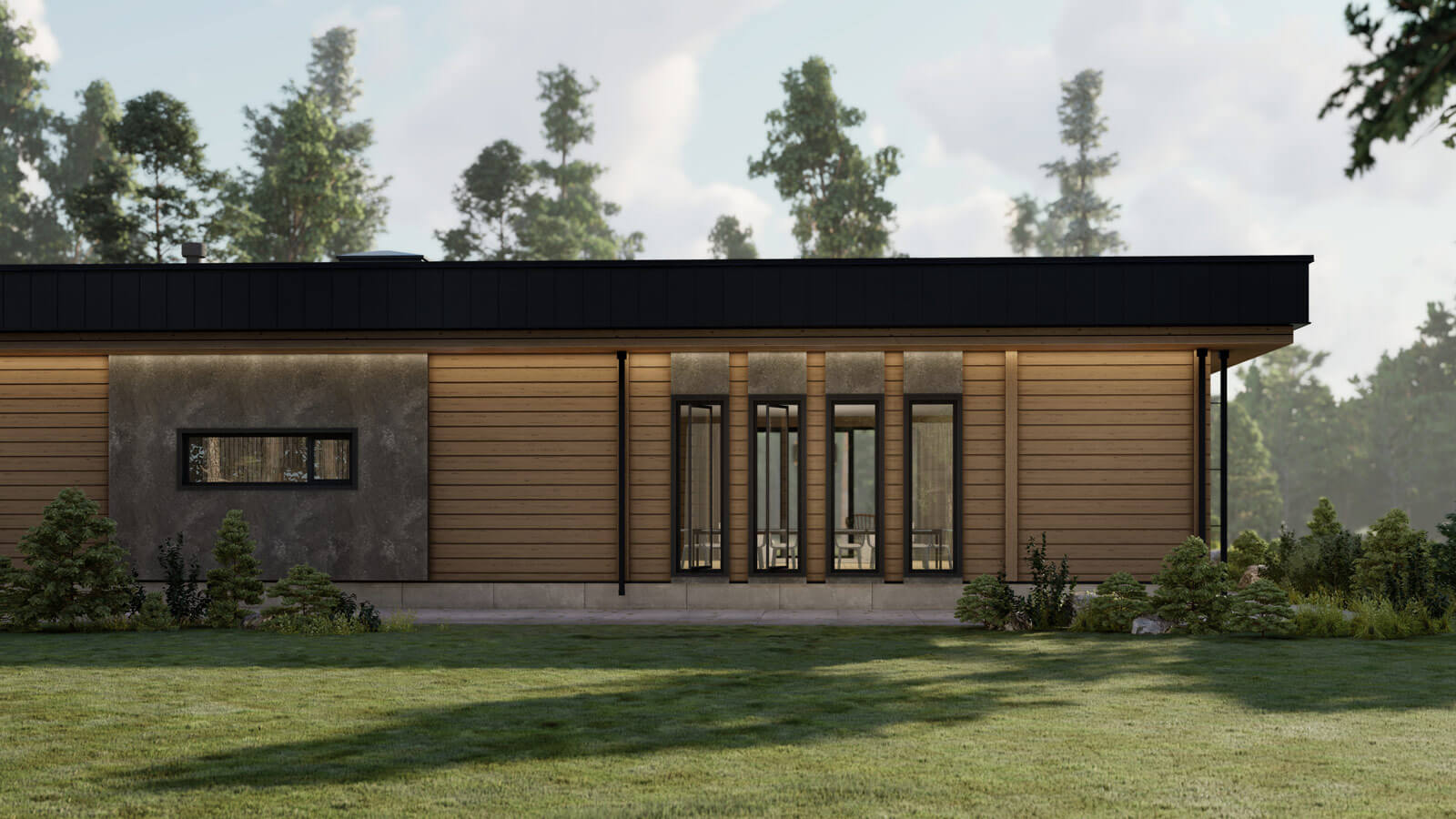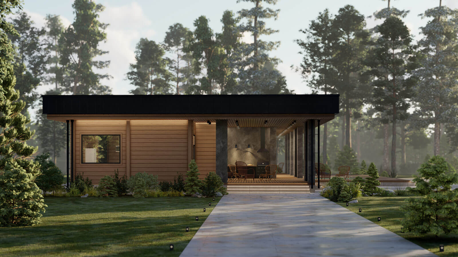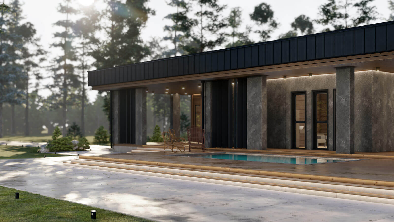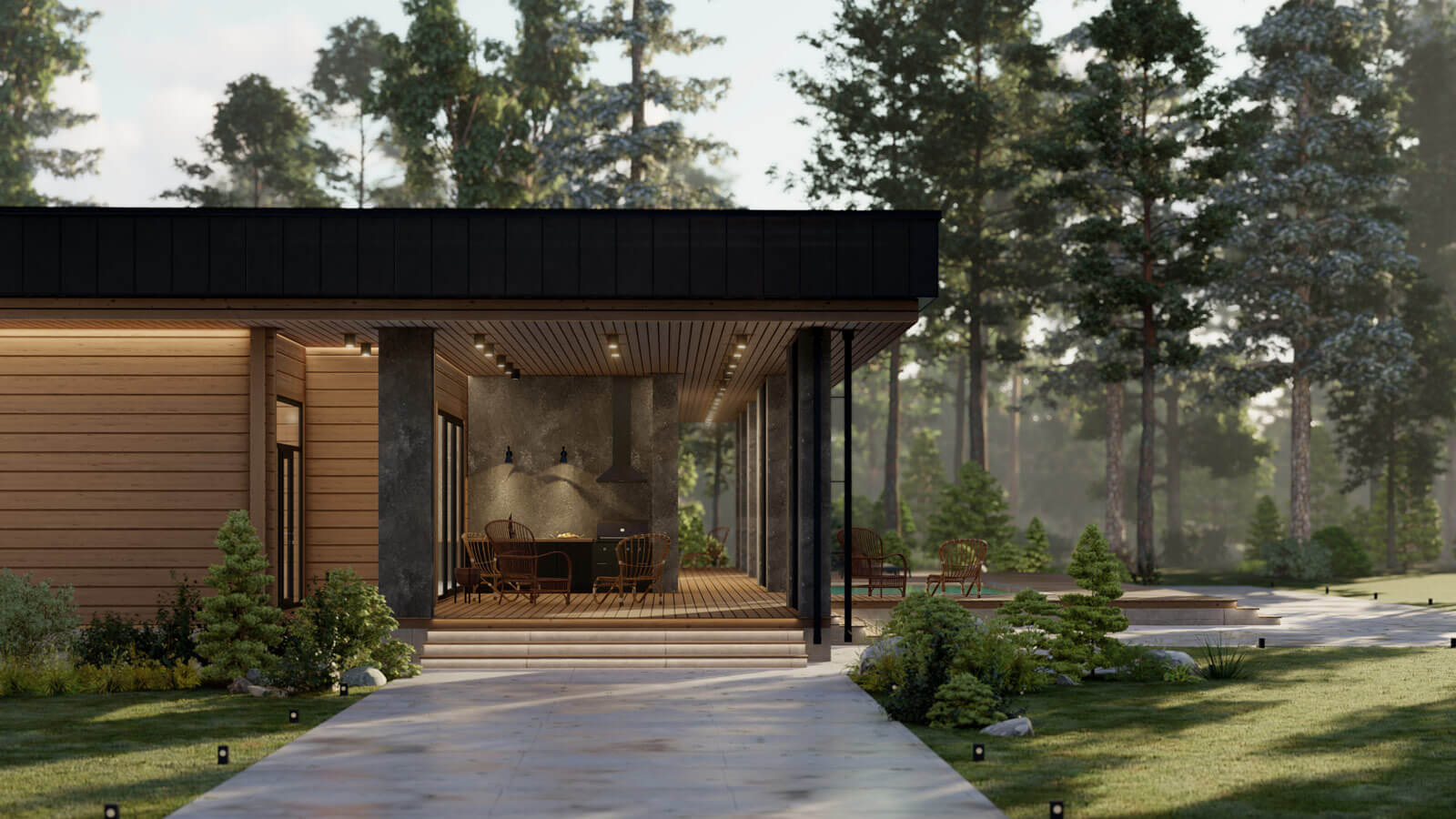 Стиль комплекса поддерживается осознанным использованием крупных массивных форм в сочетании с природными текстурами дерева и камня. Особенность композиции добавляют воздушные поворотные ламели в сочетании с мощными столбами-опорами террасы.
