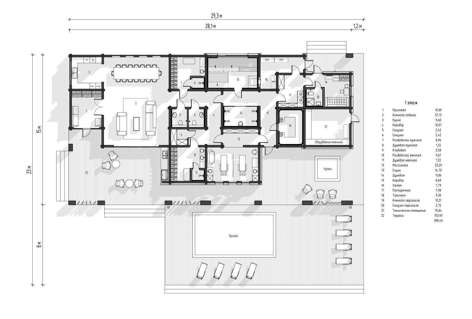 SPA-зона включает в себя женскую и мужскую раздевалки, душевую, большую парную с отдельным столом для парения, хамам и массажную комнату на две кушетки. Также предполагается подогреваемый открытый бассейн и купель для расслабления после банных процедур.