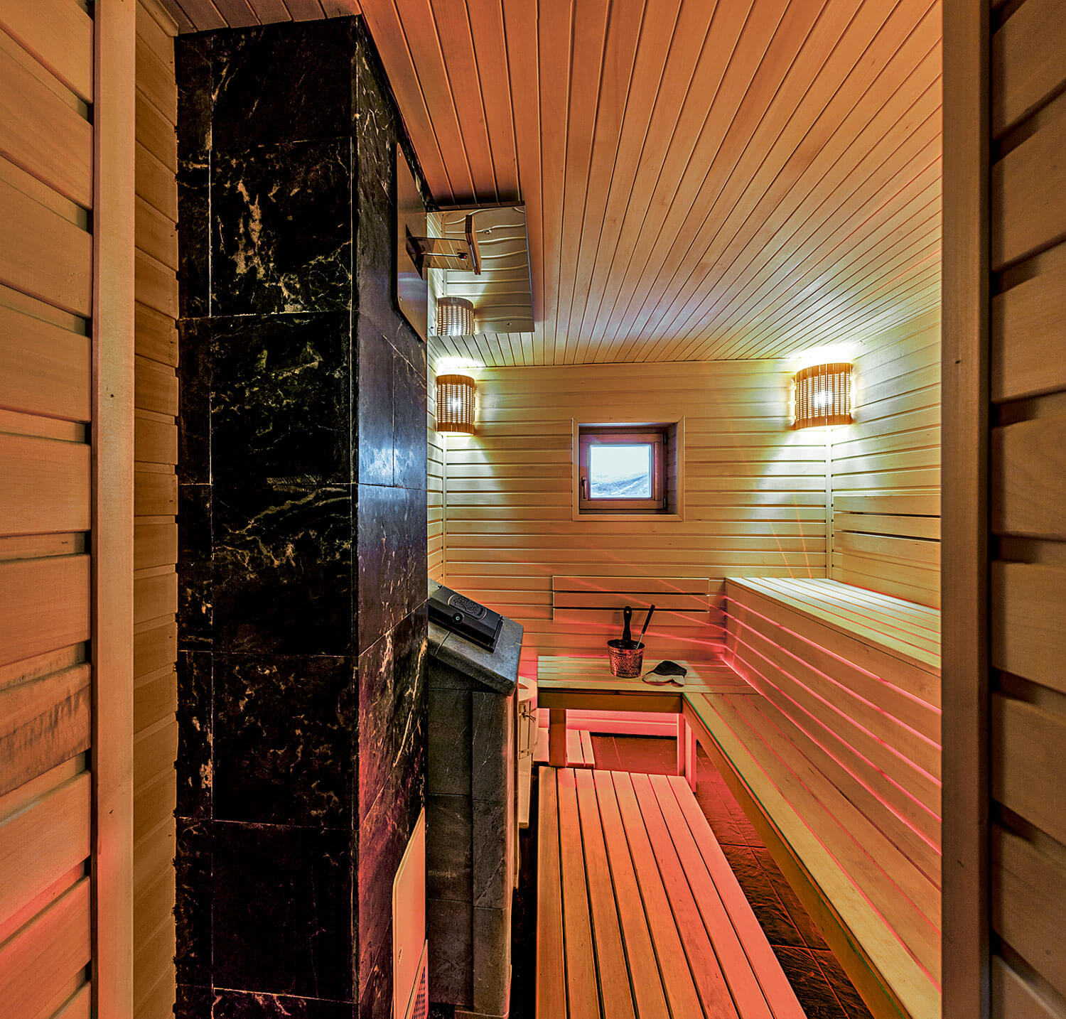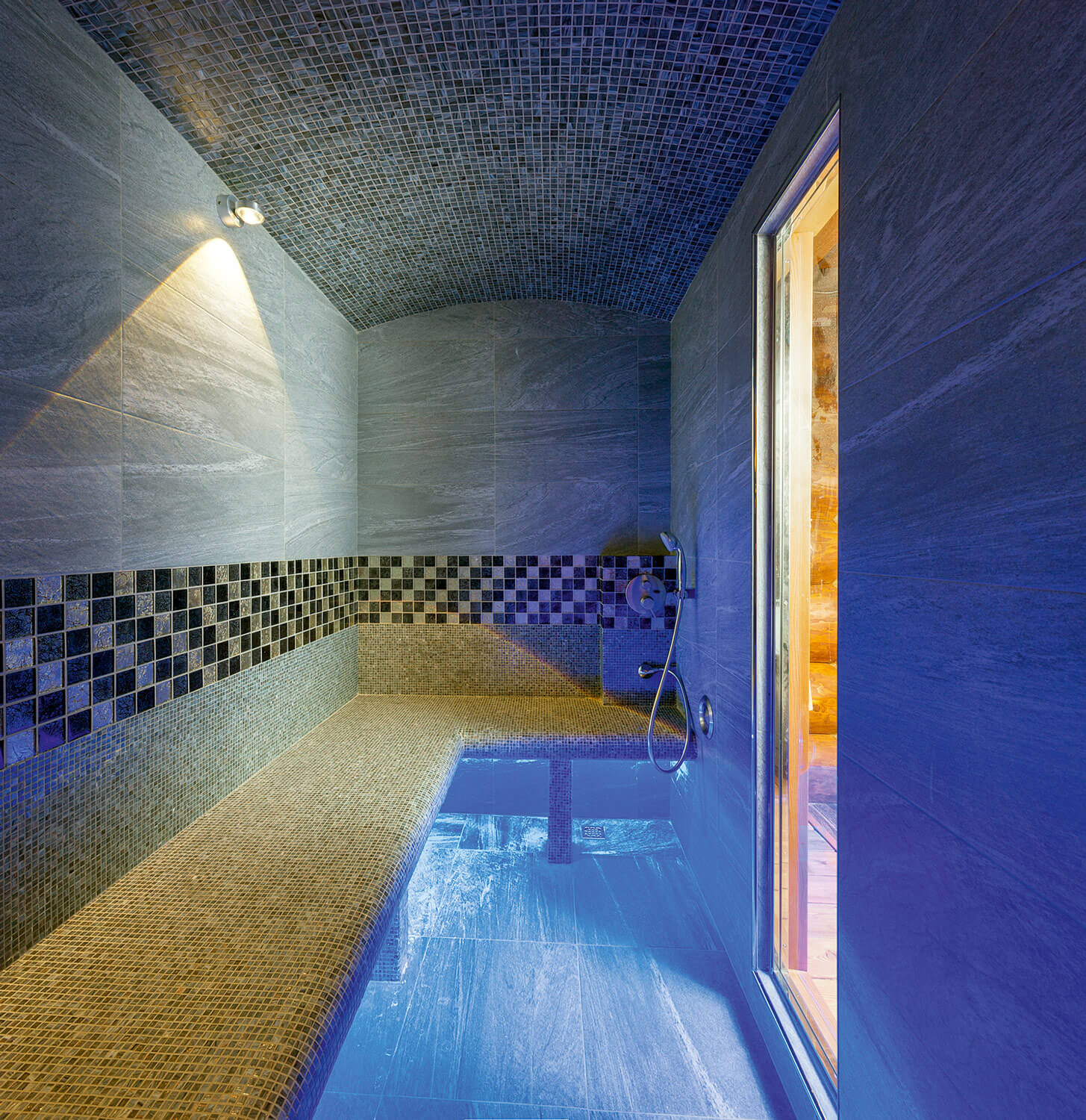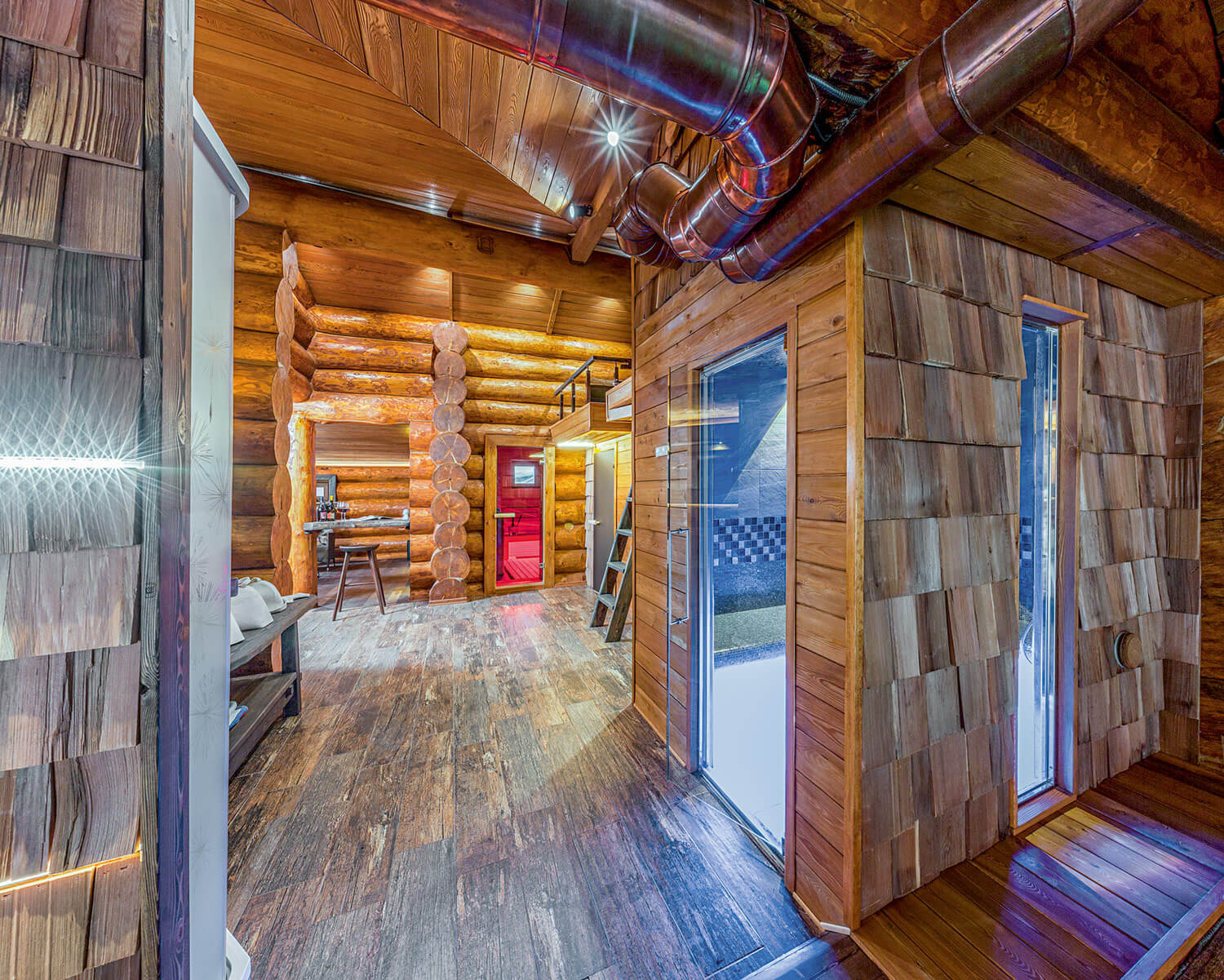 Изящная люстра — абсолютно необычный элемент декора для бани, тем не менее сочетание массивных бревен и хрусталя получилось органичным. В хаммаме и сауне, где есть небольшое окно с видом на участок, использована светодиодная подсветка, которая может менять цвет в широком диапазоне оттенков. Полукруглый свод хаммама выполнен по классическим правилам и облицован мозаикой.