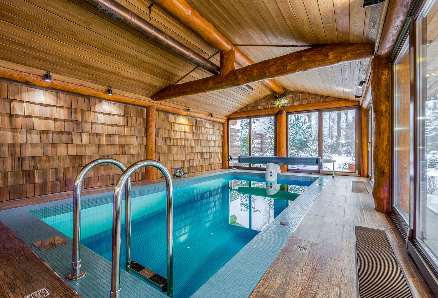 В дизайне зала бассейна использованы исключительно натуральные материалы. Колонны и балки из массивных бревен ручной рубки контрастируют с оригинальной отделкой стен дранкой и деревянной обшивкой потолка. Напольное покрытие выполнено из керамогранита, имитирующего текстуру древесины.