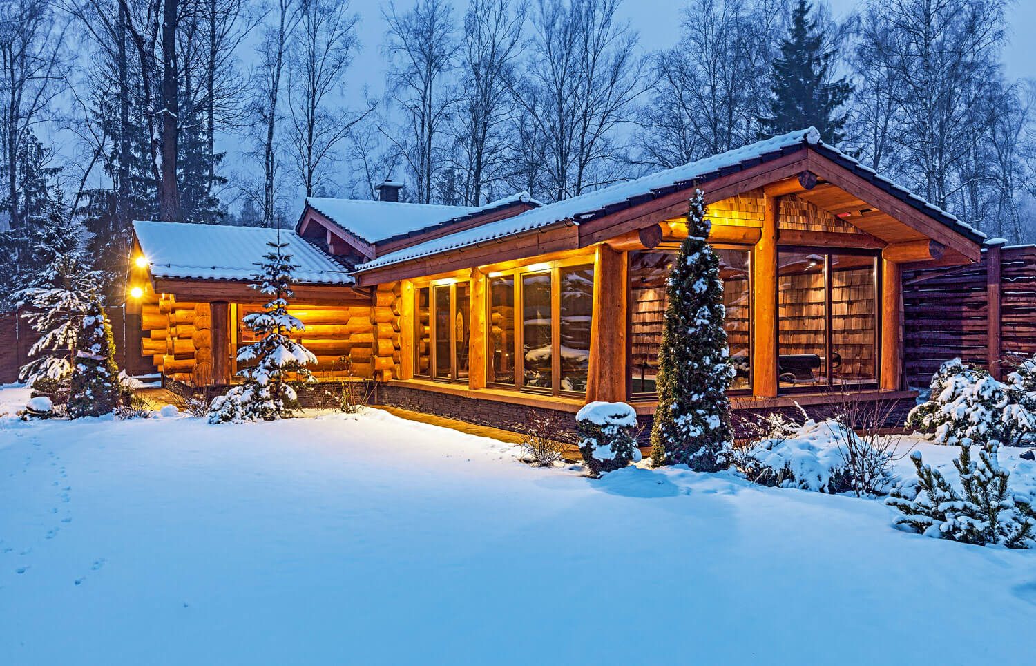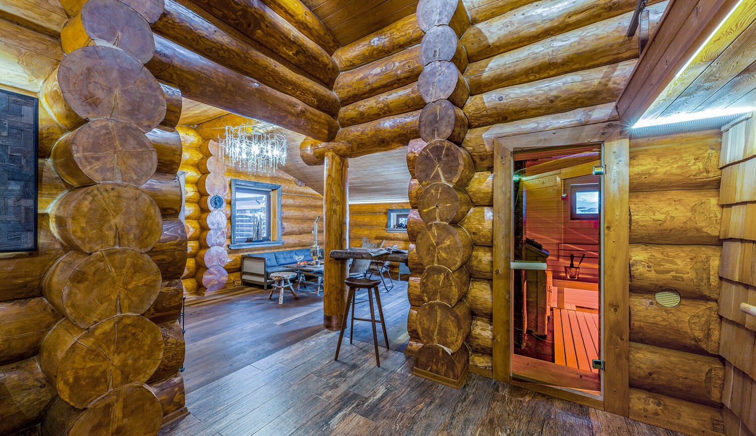 На контрасте с массивными бревенчатыми стенами особенно легкой кажется пристройка бассейна с панорамными окнами. В оформлении интерьеров выдержан принцип простоты и аутентичности. В отделке использованы такие материалы, как дранка и деревянная обшивка. Многообразие текстур натурального дерева сделало помещения теплыми, уютными. Например, обстановка комнаты отдыха воспроизводит мотивы стиля кантри. Грубый стол из массива дерева, кресла с искусственно состаренной кожаной обивкой, самовар придают помещению особенный колорит.