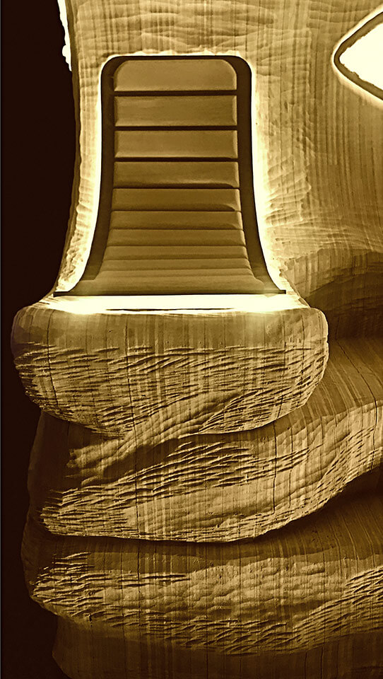 Отправной точкой в процессе формирования идеи для создания бани ЕВА07 послужил спор с дизайнером: он увидел, что активная линия в автомобиле Bugatti Chiron — это подкова. Автор бани настаивал, что это падающая волна, а так как машина очень быстрая, то волна просто не успевает упасть. Все вышесказанное и рождает такую дивную скульптурную форму, которая застыла в этом проекте.