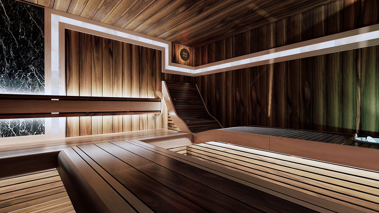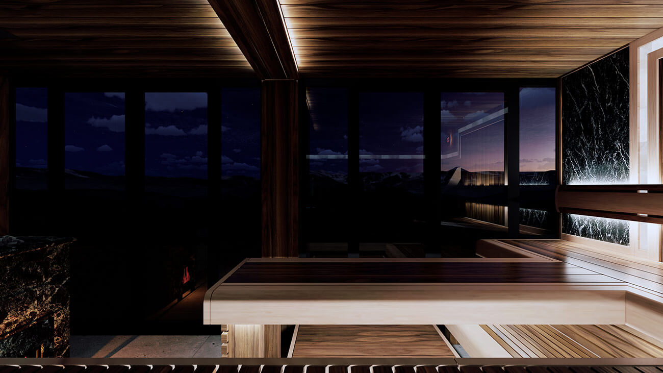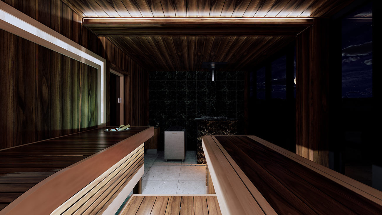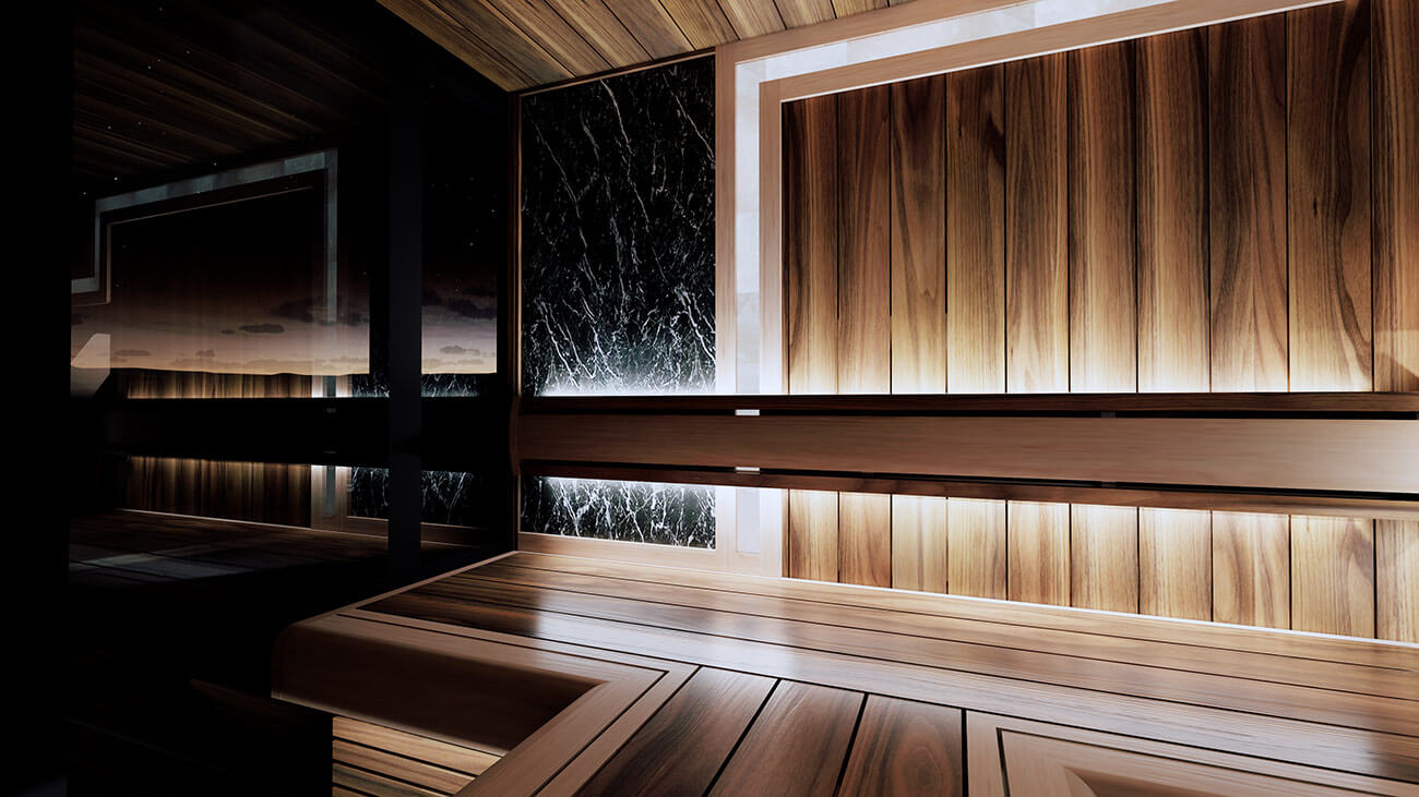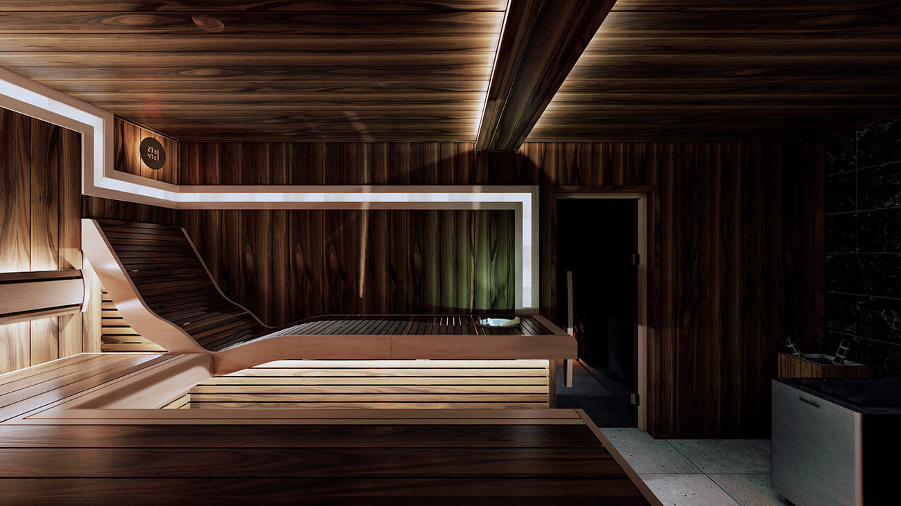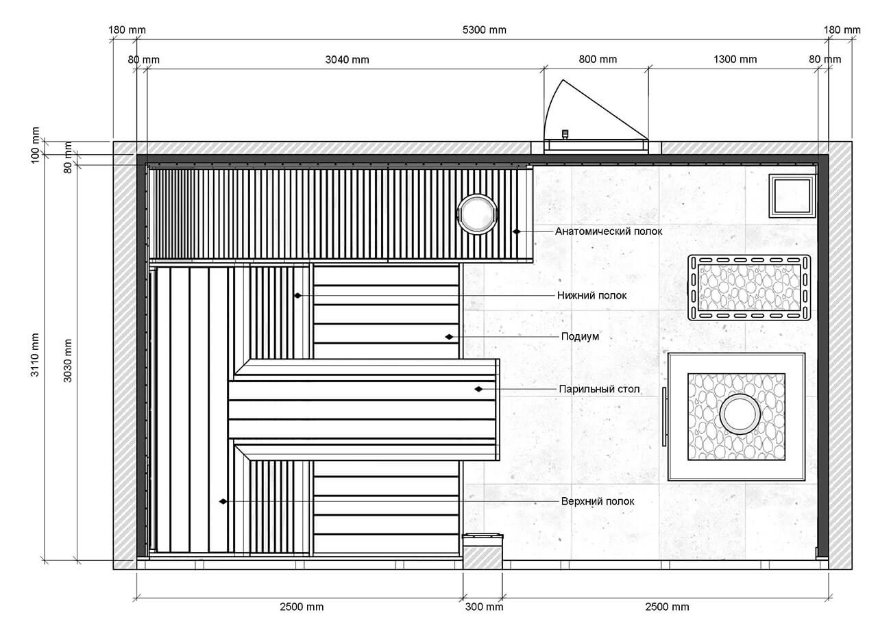 Комбинирующую светосхему помещения рисуют вставки светлой древесины ольхи на полках. Полки в помещении расположены г-образно, вытекая в парильный стол посередине помещения. Справа от парильного стола расположился анатомический полок, повторяющий естественные изгибы тела человека.
