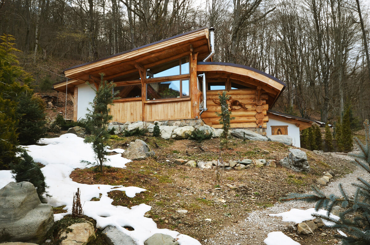 Техническое помещение вынесено отдельным блоком, а комната отдыха с душем и туалетом в отдельном флигеле, тут же расположен камин с функцией плиты. Панорамное окно с видом на горы — это главный элемент краснополянской архитектуры.