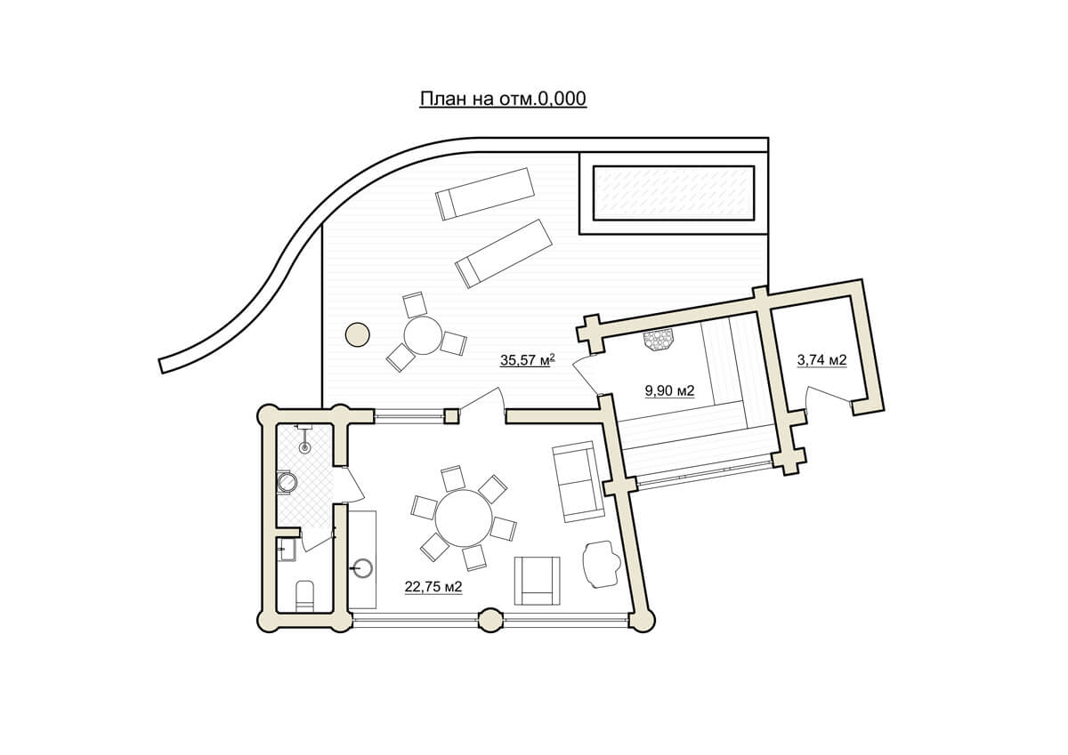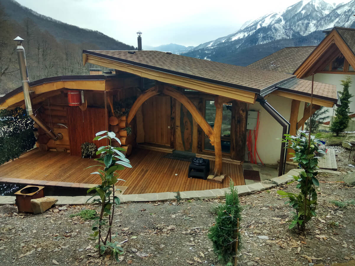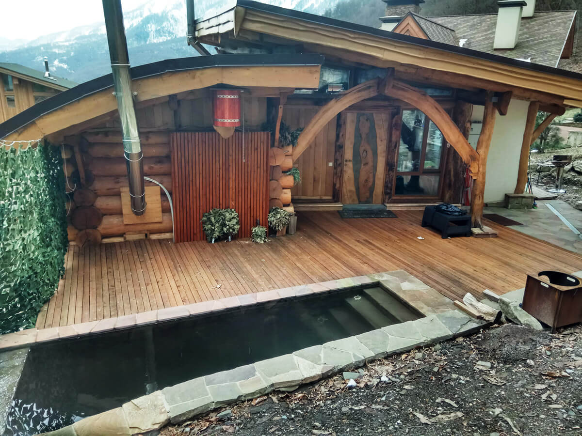 Планировка бани тоже довольно своеобразная. Парная на дровах, выход из парной сразу на улицу, что довольно непривычно для средней полосы, выход на террасу, где расположена холодная купель, кстати, купель — это совершенно уникальная позиция, вода в нее поступает из соседнего горного ручья и постоянно обновляется, это решает многие технологические проблемы, да и просто реальный бонус.