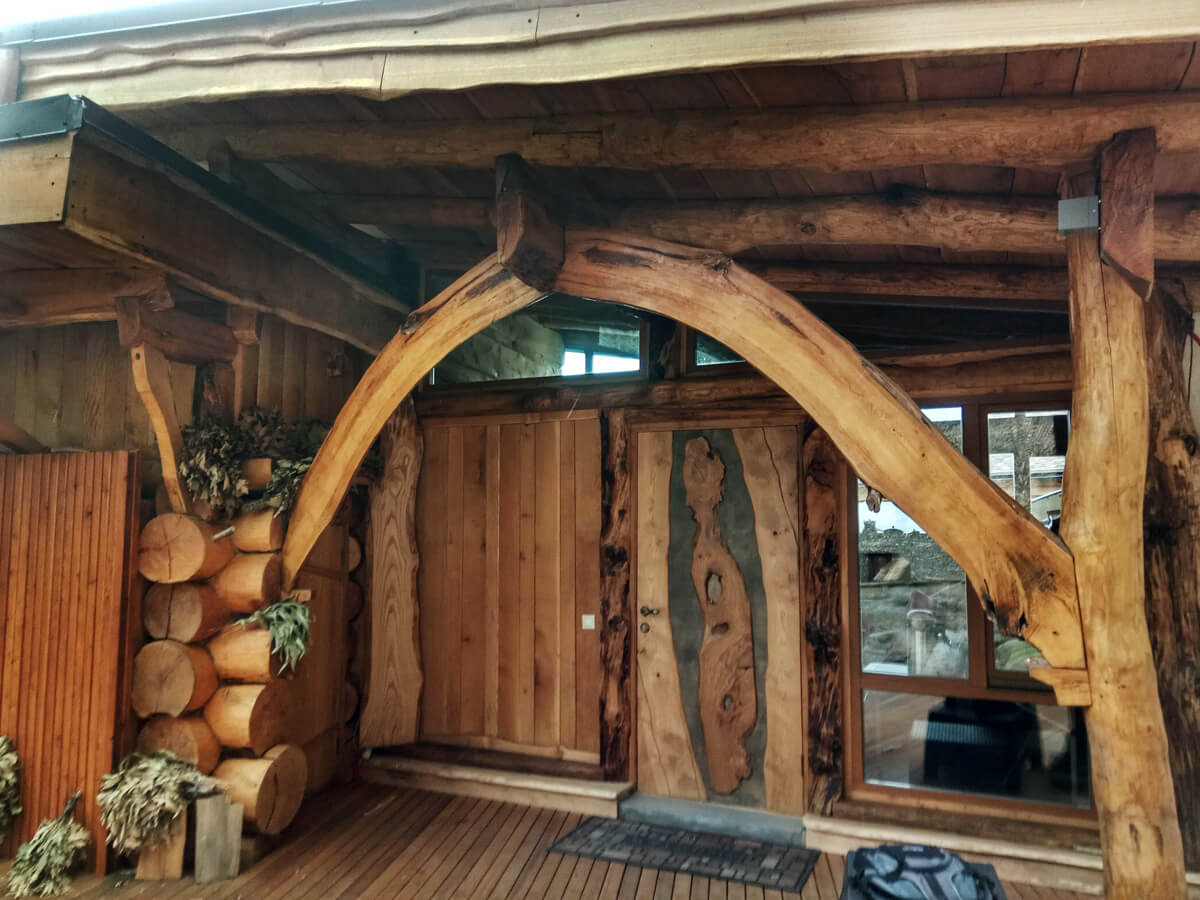 К технологии. Парная, это полноценный сруб ручной рубки, местная ольха, впрочем, как и все материалы, которые использовались в строительстве и отделке этой баньки, все то, что мешало при строительстве горнолыжных трасс.