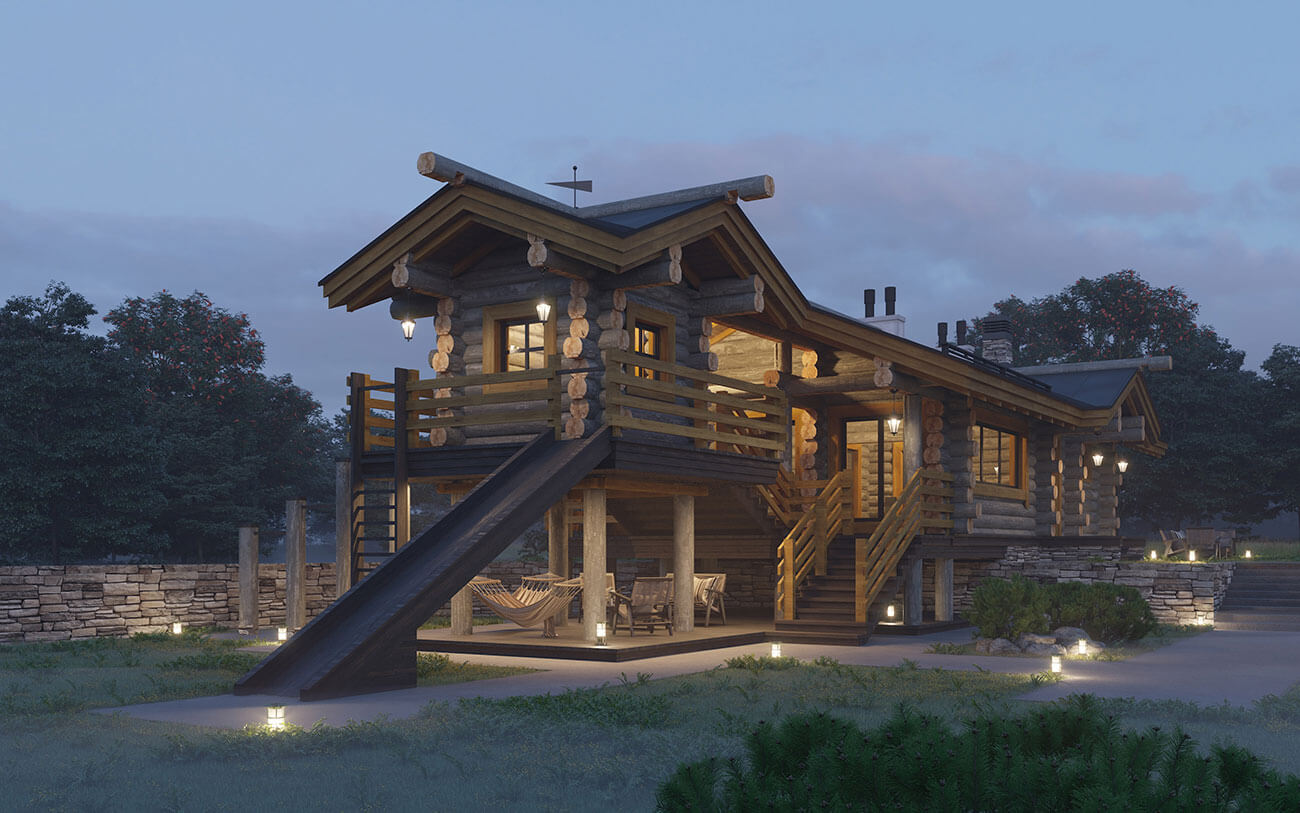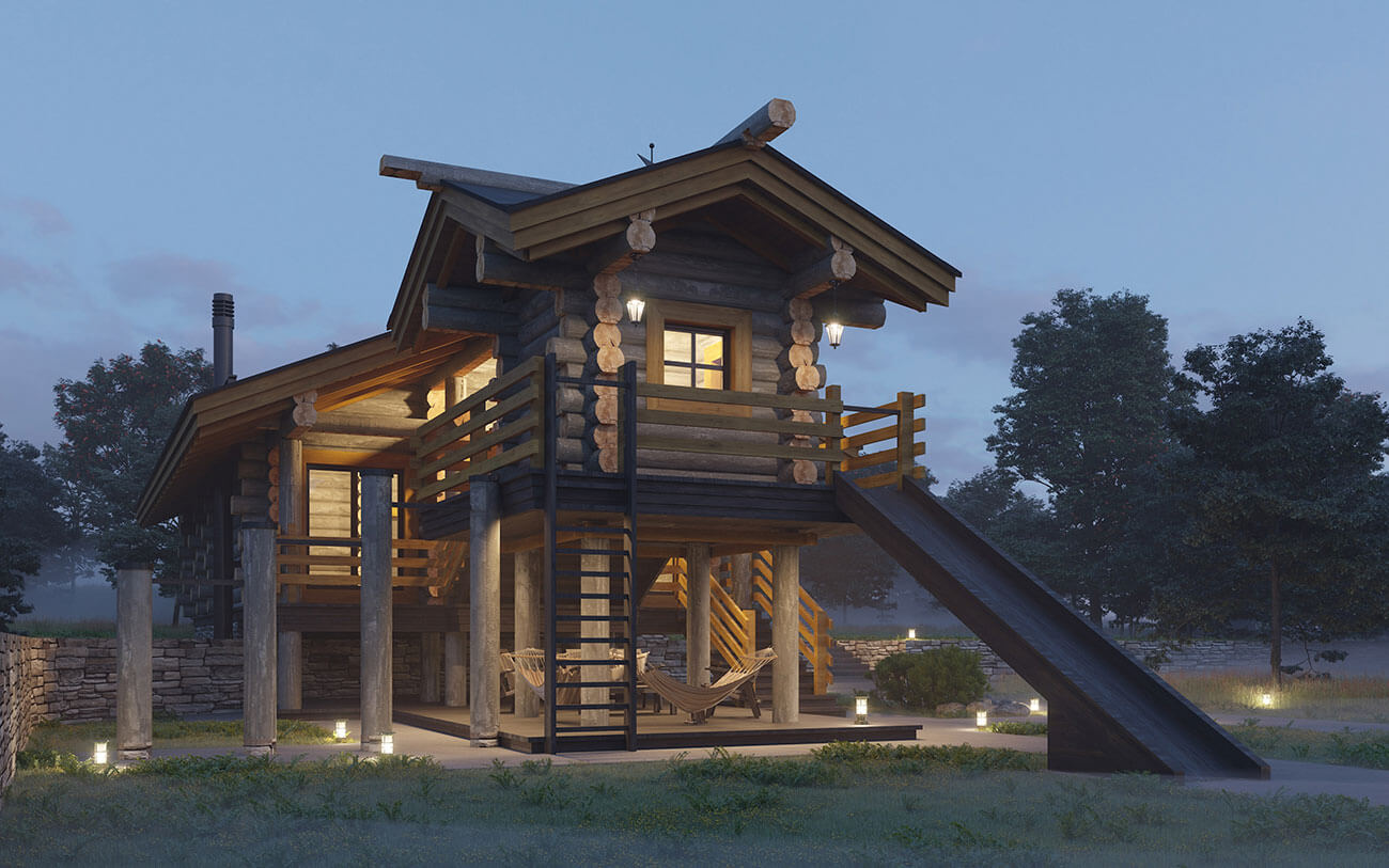 Баня с детским комплексом рассчитана для круглогодичного использования в деревне Рыбаки Московской области. Участок со сложным рельефом с перепадом высот и подпорной стенкой, поэтому часть бани располагается на опорах, благодаря чему детский комплекс получился двухуровневым.