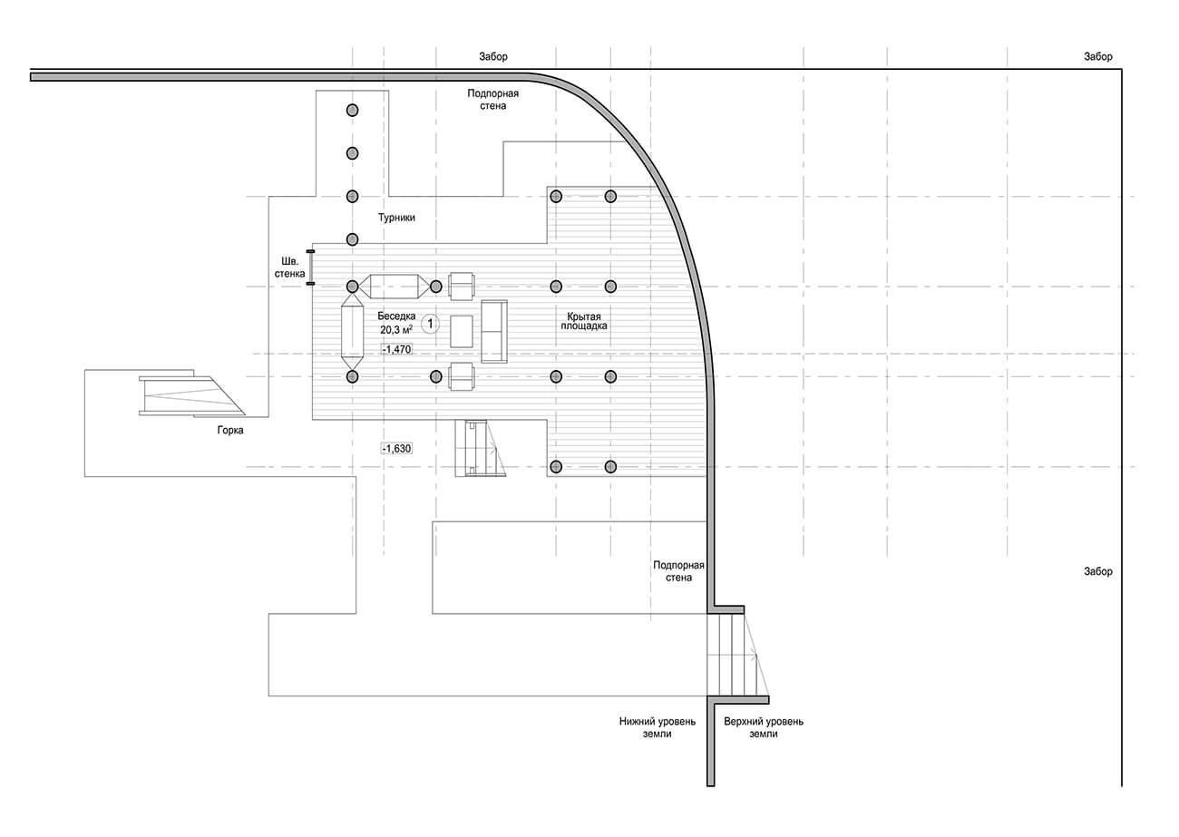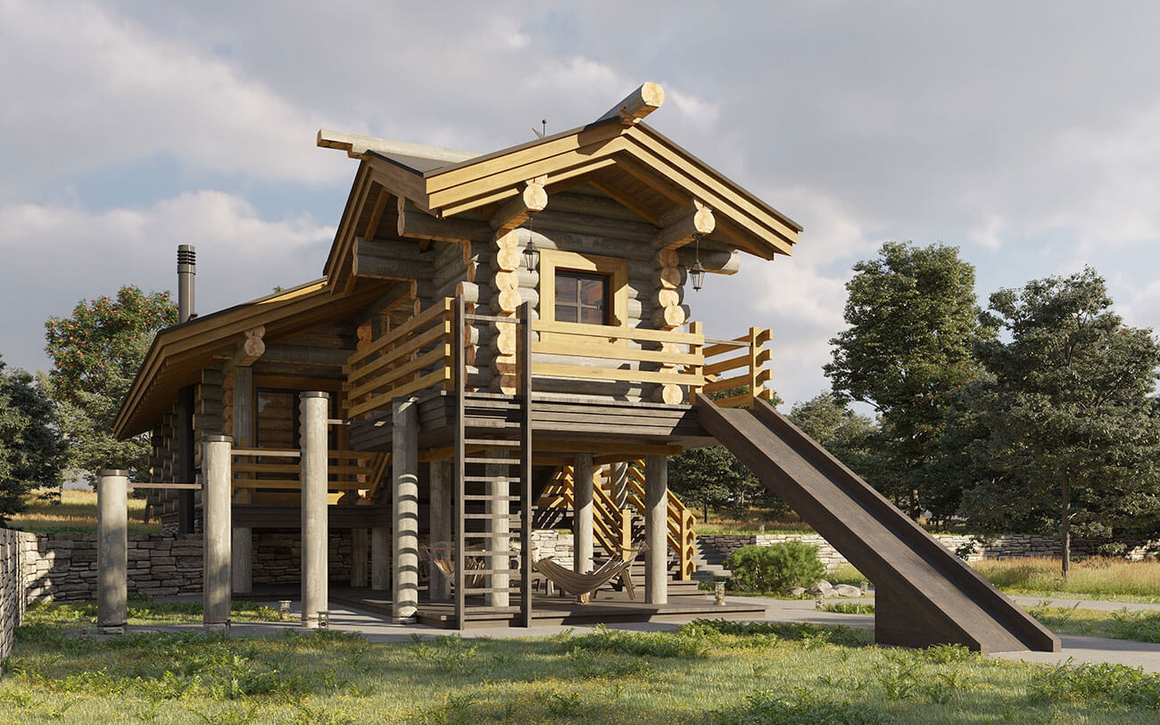 Комплекс включает в себя домик для игр с обходной галереей на верхнем уровне и беседку под ним с зоной отдыха, гамаком и диванчиками. Рядом предусмотрена зона для игры, шведская стенка и турники.