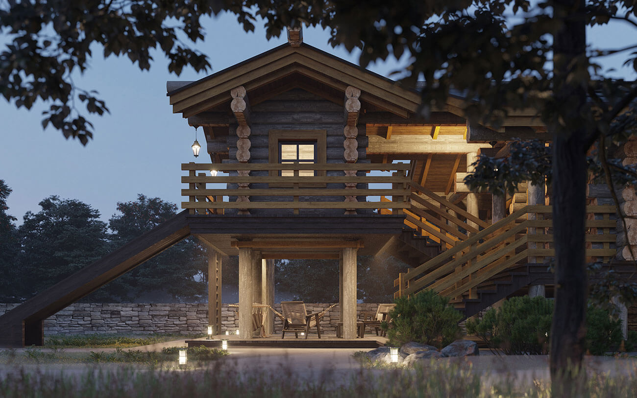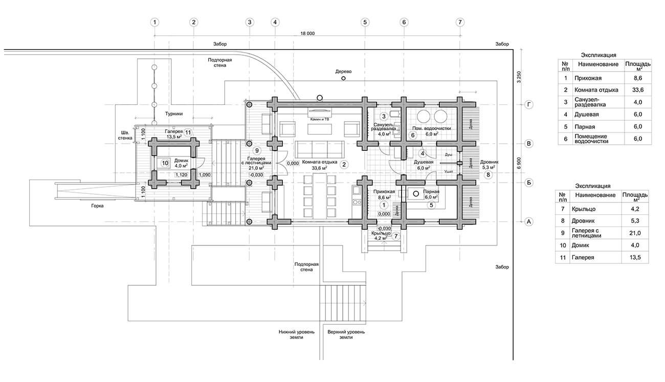 В бане располагаются прихожая с вешалкой, топкой банной печи и дровником, туалет с раздевалкой, помывочная с душем и ушатом, парная. В комнате отдыха есть мини-кухня, барная стойка и стол на 8 человек. На выходе из комнаты отдыха начинается крытая галерея с лестницами, ведущая на верхний уровень к домику для игр, другая спускается к беседке.