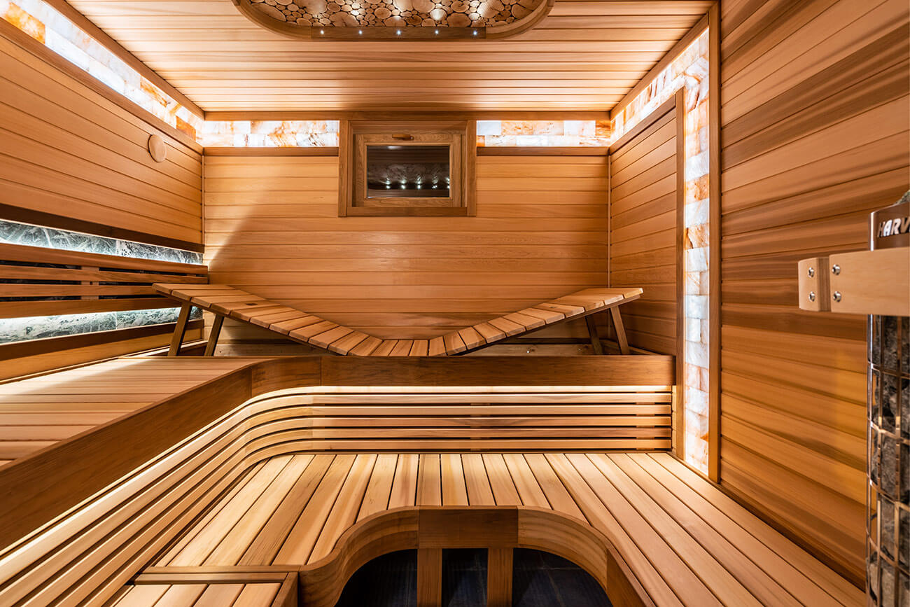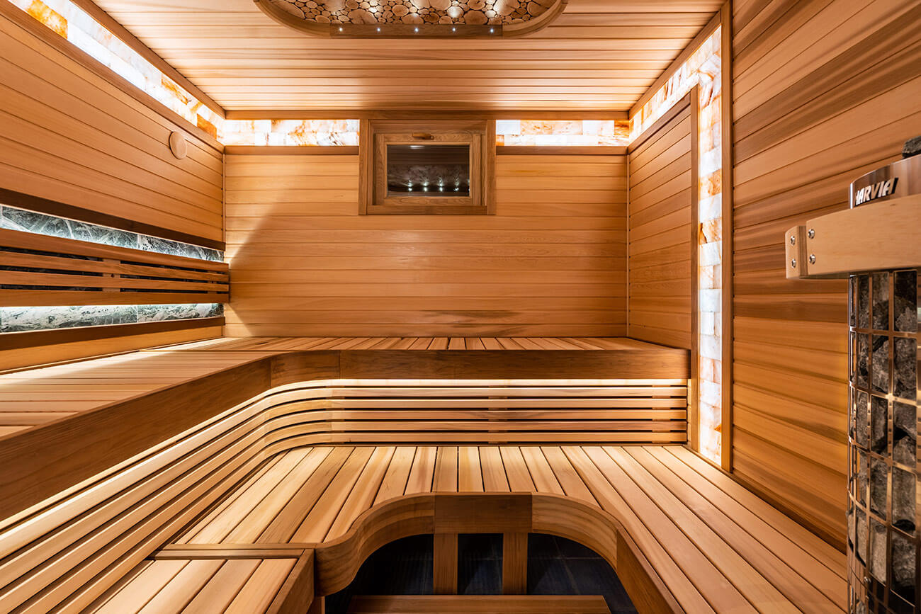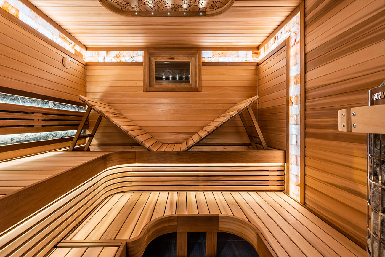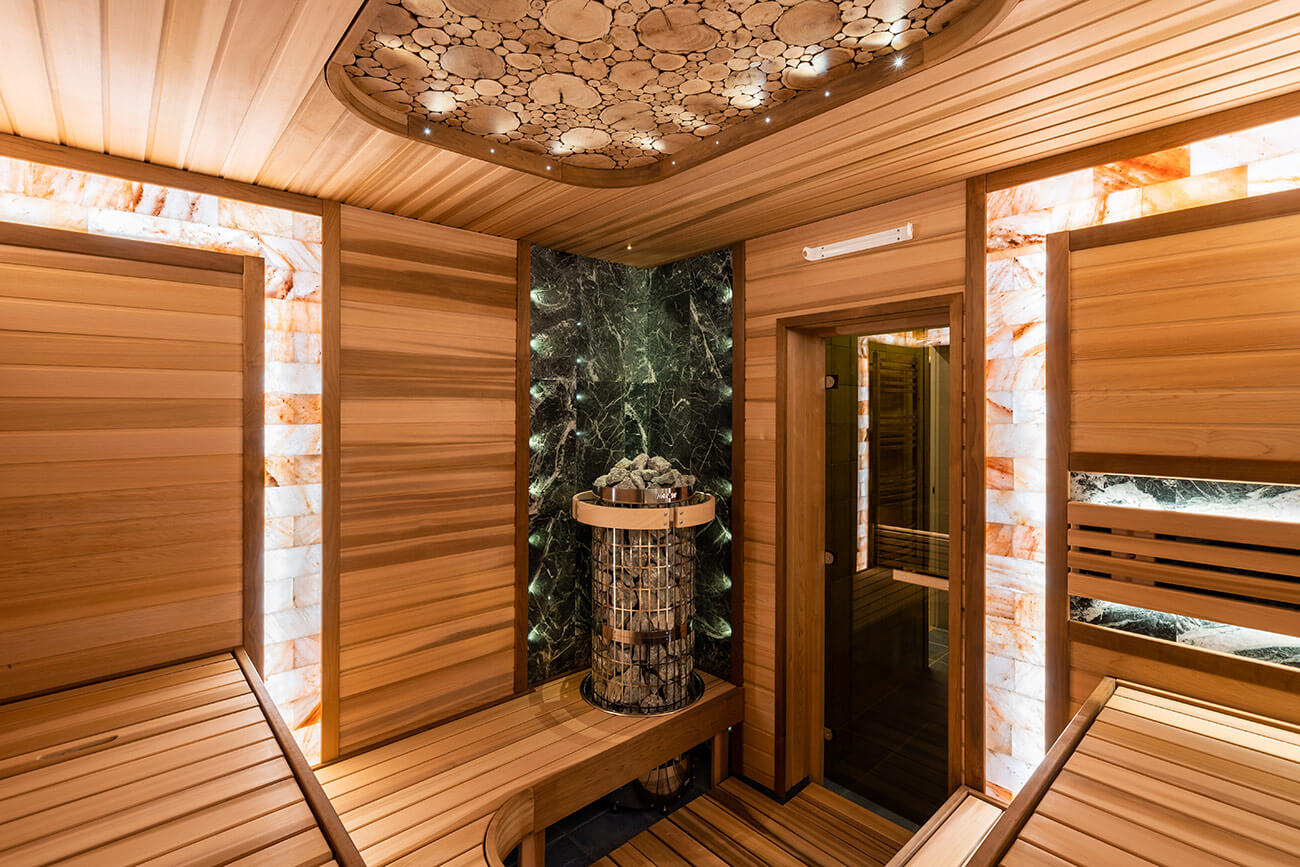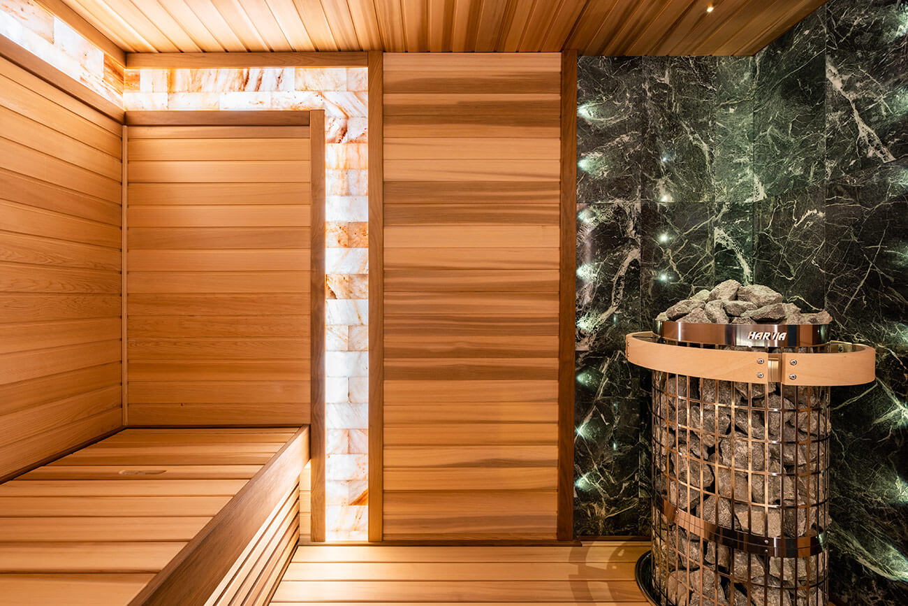 Основным материалом отделки парной является комбинация премиальной древесины канадского кедра и термообработанной ольхи. В центре внимания парной – полки бабочки с подъёмным механизмом спинки и печная зона. В печной зоне мы разместили плитку змеевика, которая выгодно гармонирует с древесиной пестрого кедра, и печь Harvia cilindro. Печную зону выделает точечное оптоволоконное освещение cariitti. Также, плитку змеевика мы расположили за спинкой полков, дополнительно подсветив ее ленточной подсветкой. В качестве декора мы разместили столбы из гималайской соли и панно из срезов можжевельника.
