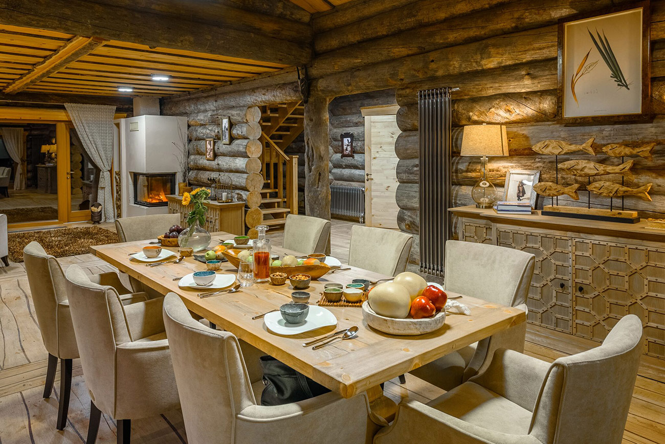 Архитектурное решение образа бани — объемно-пространственная композиция горизонтальной направленности, подчеркнутая линиями кровель, архитектурными элементами и деталями, сочетающая современное видение с традициями деревянной архитектуры. Широкие, относительно пологие крыши объединяют, а также зрительно и фактически занижают объем и усиливают его связь с ландшафтом.