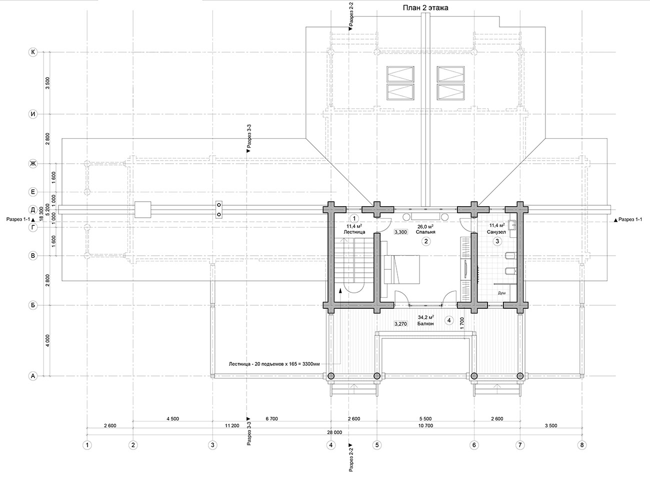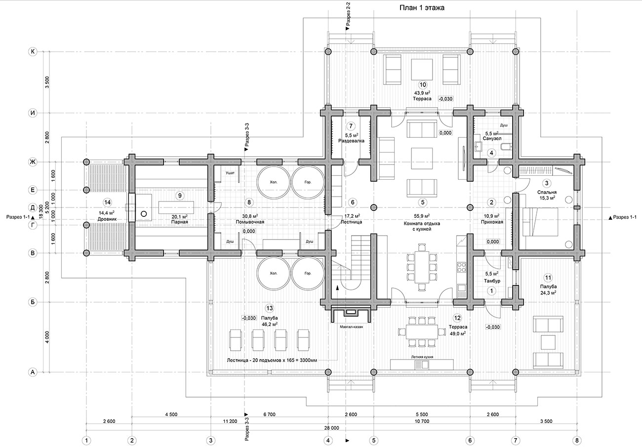 Общая площадь помещений (без террас, палуб, дровника и балкона) составляет 215,5 м², площадь террас, палуб, дровника и балкона 212 м². Площади указаны на планах и в экспликации.