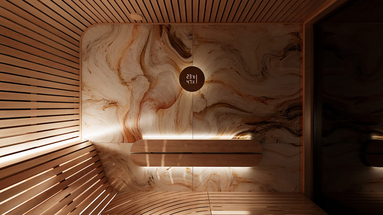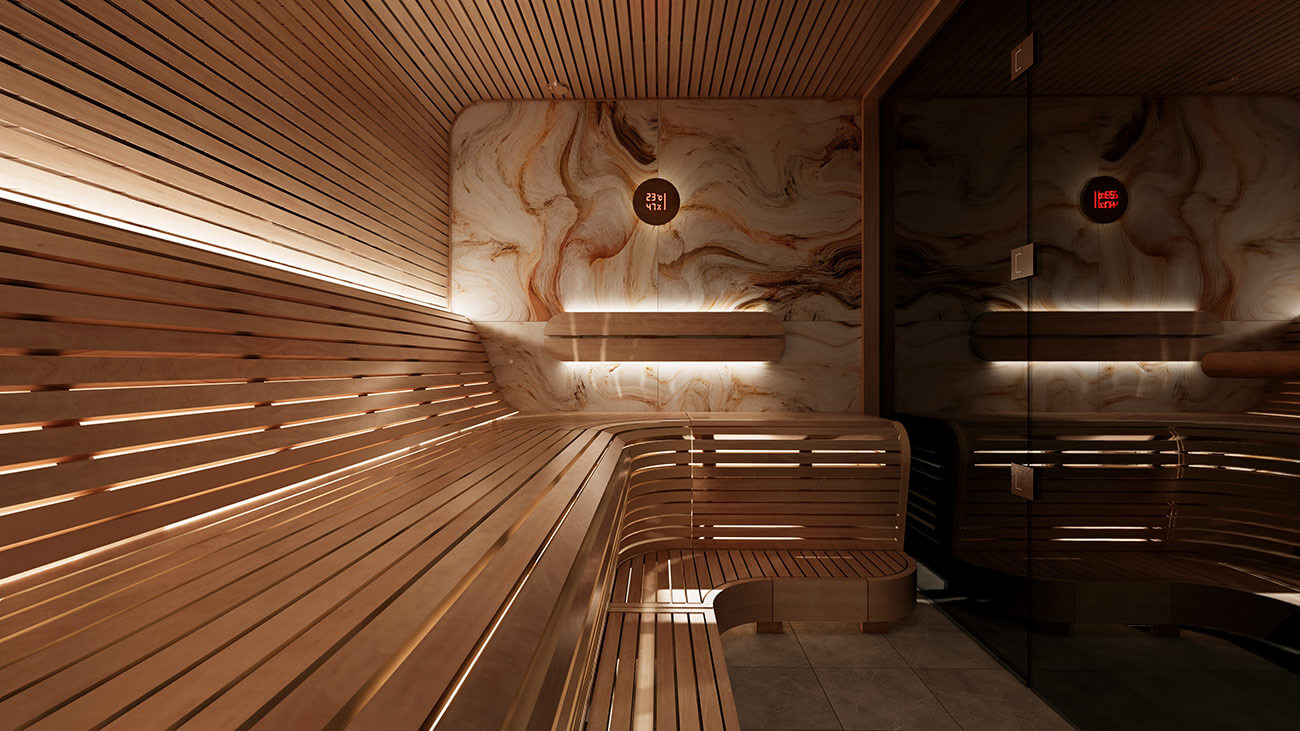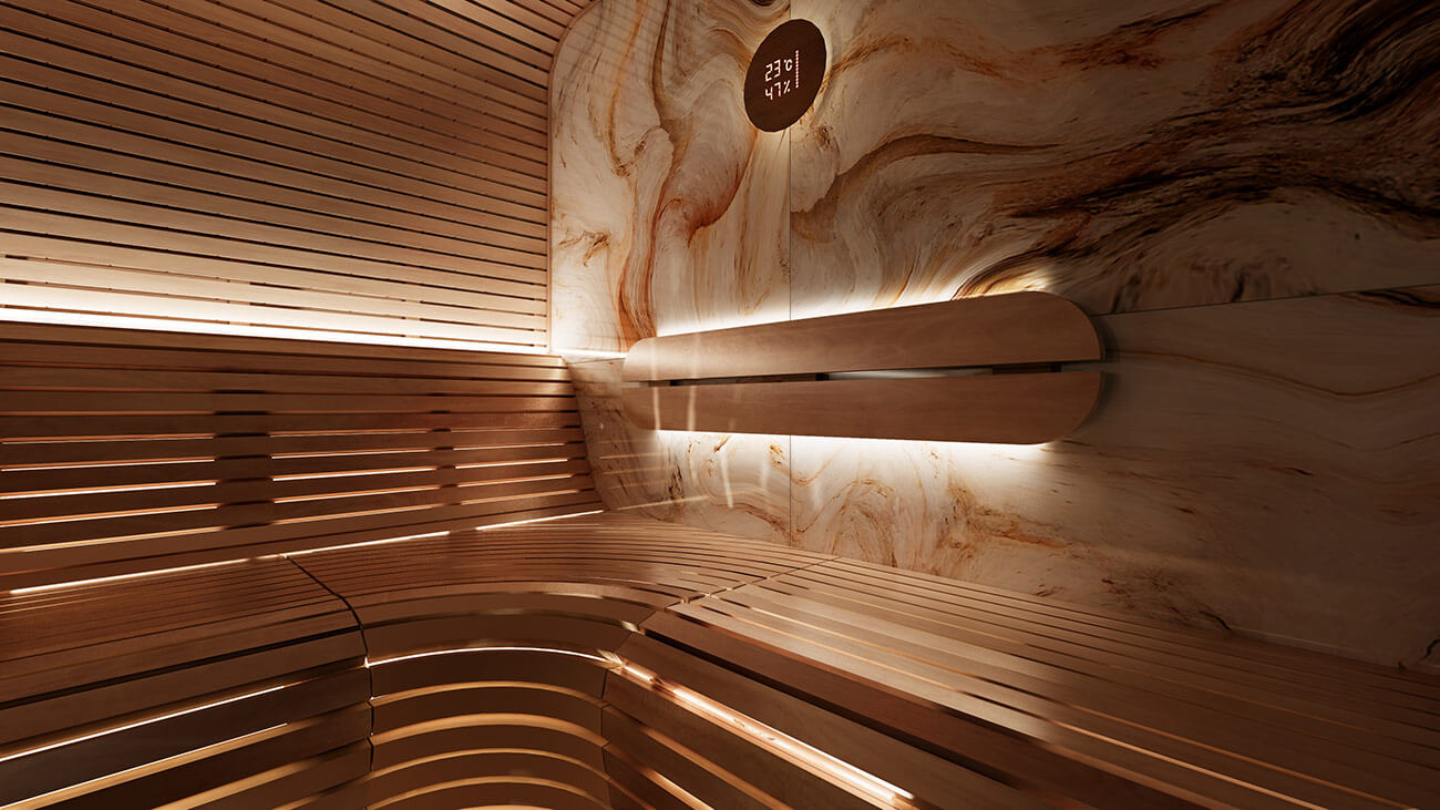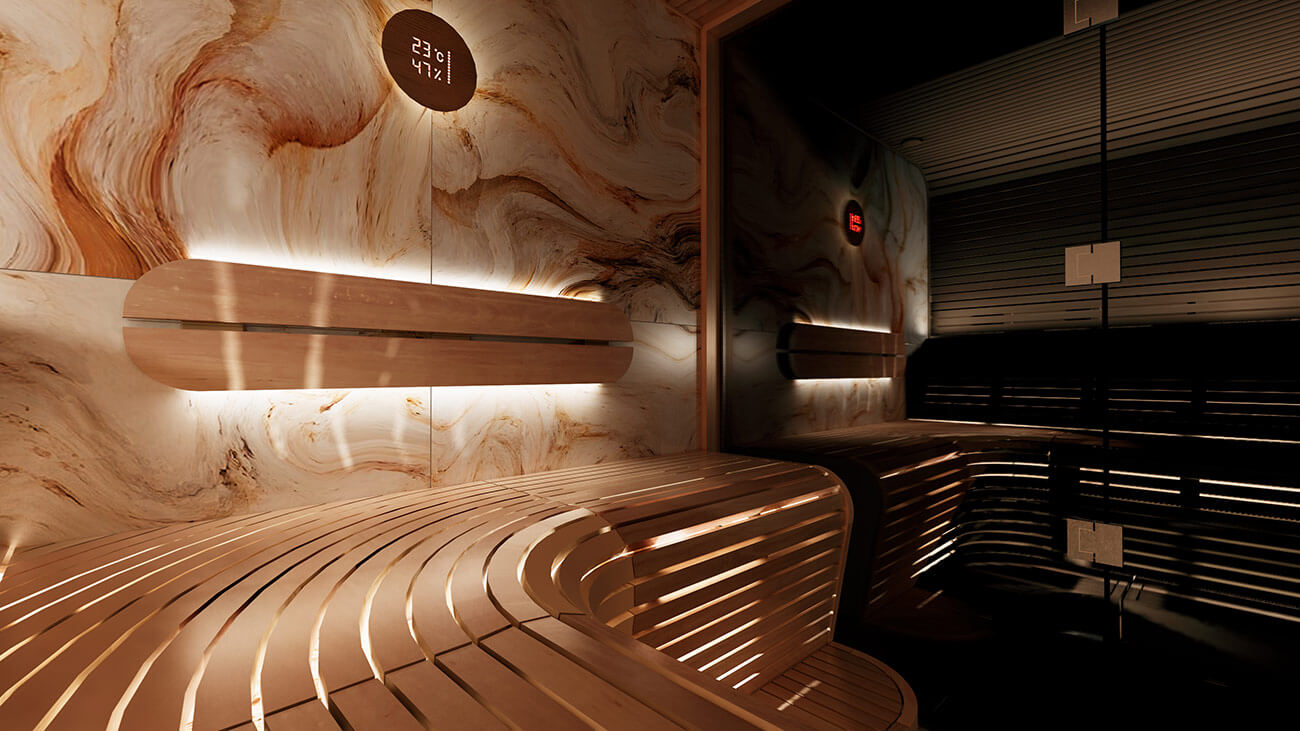 Баня в футуристичном стиле с закругленными полками