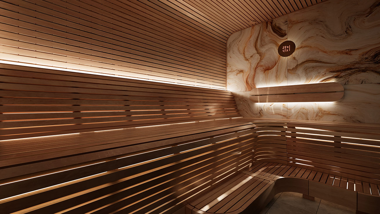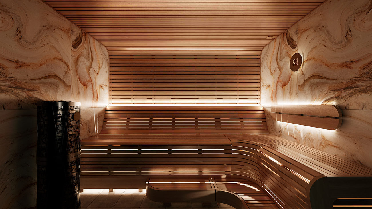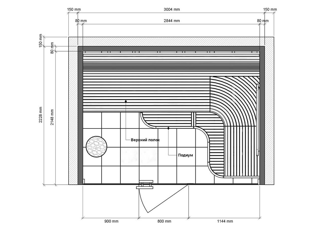 Баня в футуристичном стиле с закругленными полками