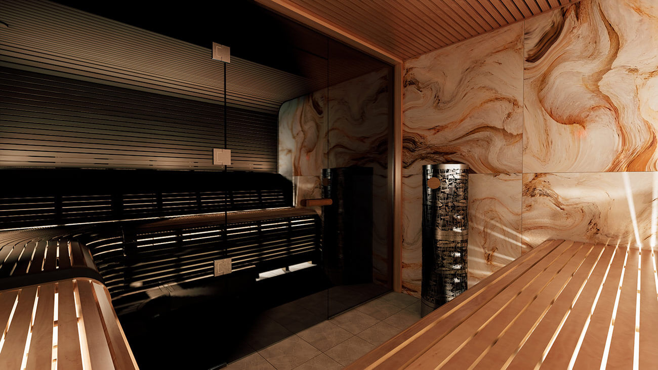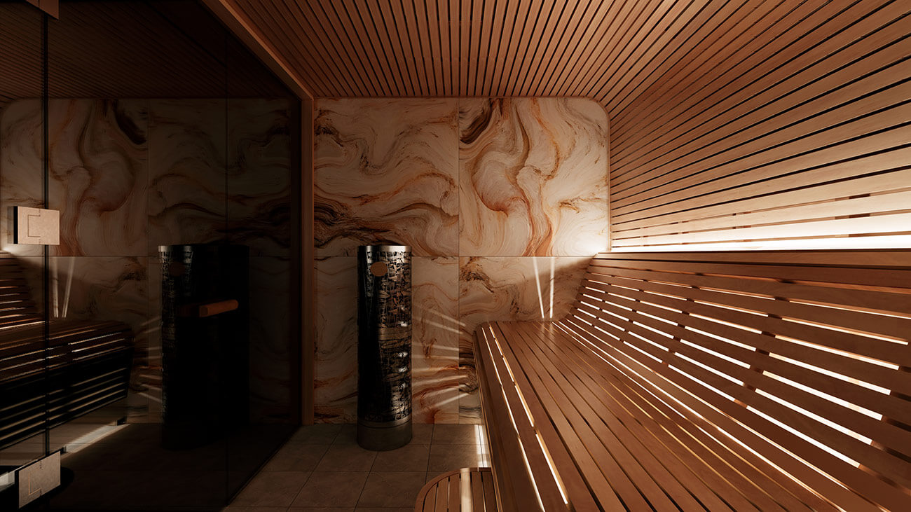 Основным материалом данной бани является премиальная древесина ольхи. Полки из ольхи отлично комбинирует со стеновой отделкой из плитки гладкого талькохлорита. Соблюдение футуризма в дизайне парной позволило дизайнерам разработать закругленные полки с анатомической спинкой. Для большей практичности парной мы добавили механизм выдвижного полка на первый уровень.