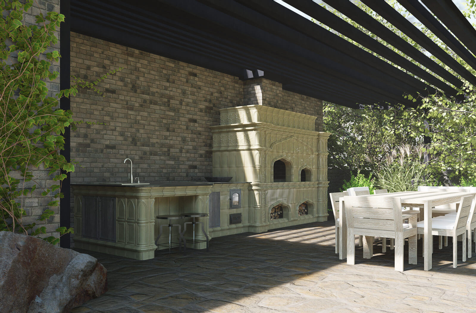 Подобный комплекс отлично решает задачи уличной кухни в плане наполнения и зонирования и решен таким образом, чтобы последующее мебельное наполнение кухни отвечало всем нормам эргономики и безопасности. Двигаясь слева направо мы сначала видим секцию с мойкой, затем барную стойку с большой рабочей зоной, шкафчики для хранения утвари и дровяную плиту, подходящую в том числе и для казана. Еще правее находится сердце комплекса — мангал и русская печь с дровницами. Три самостоятельные горячие зоны позволят вам готовить сразу несколько блюд с товарищами, не мешая друг другу в процессе.