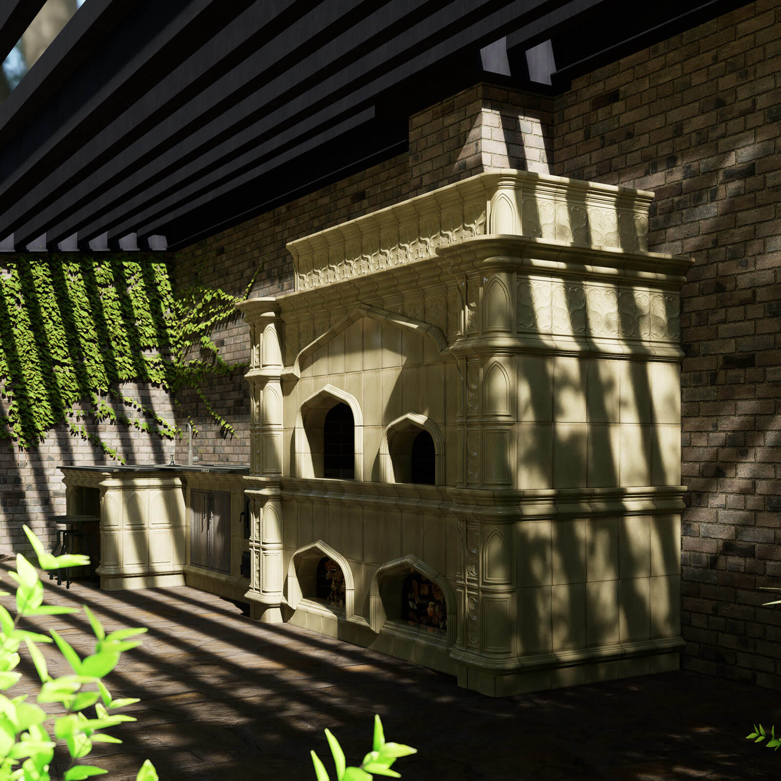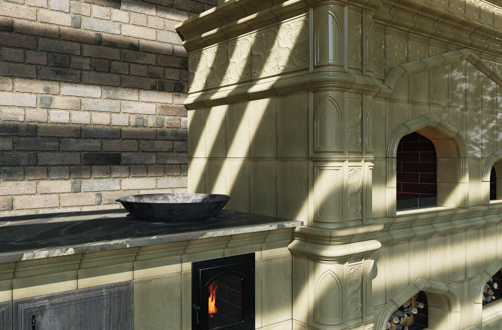 Создавая данный дизайн-проект, мы вдохновлялись готическим архитектурным стилем. Подчеркнутая вертикаль каждой формы, богатое украшение рельефами и синтез инженерии и искусства — все для того, чтобы готовка приносила эстетическое удовольствие, оставаясь удобной и эффективной. Для изразцов мы выбрали сдержанный зеленый оттенок майоликовой глазури, а для столешницы — гранит Питон Блэк с прожилками в тон. Каждый материал обладает отличной износоустойчивостью, а также легок в уходе. Все это позволяет нам проектировать такие печи, которые смогут радовать вас каждый день даже в рутинном деле приготовления еды - ведь пища, приготовленная с любовью, гораздо вкуснее!