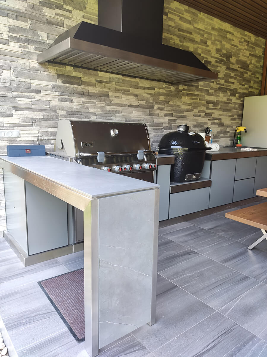 Комплекс многофункциональный: встроены газовый и керамический грили, мойка, дымосборник с жироуловителями.