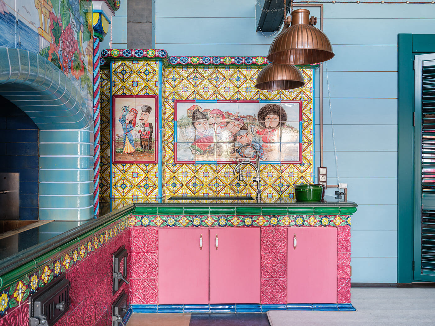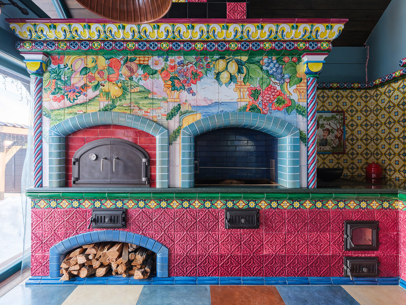 Большое внимание в данном проекте мы уделили дизайну барбекю. Здесь у нас использована керамика ручной работы. Все элементы формуются, обжигаются, а затем расписываются художницами. На фронтальной плоскости размещено панно, на котором разместили сюжет по мотивам традиционной итальянской майолики. Получилось вкусное изображение с фруктами, ягодами и листьями аканта. Обратите внимание мы не делали орнамент в каждой плитке – мы объединили их в один блок и сделали одно изображение. Благодаря такому приему появилось цельное восприятие конструкции и при этом она стала смотреться визуально меньше. Чтобы не перегружать декором фасад – цокольный ярус мы сделали однотонным. Одно из отличий изразцов от керамической плитки это возможность создавать архитектурные элементы, посмотрите здесь на углах витые колонны, которые завершаются капителью. Они приходят в навершие из сочетания валика с массивным карнизом. Все эти детали создают общую форму барбекю и задают ее пропорцию. Это база, которая в последствии влиять на восприятие комплекса. Если первоначально пропорции подобранны неправильно, то даже самое изящно расписанное изделие будет восприниматься как некрасивое.