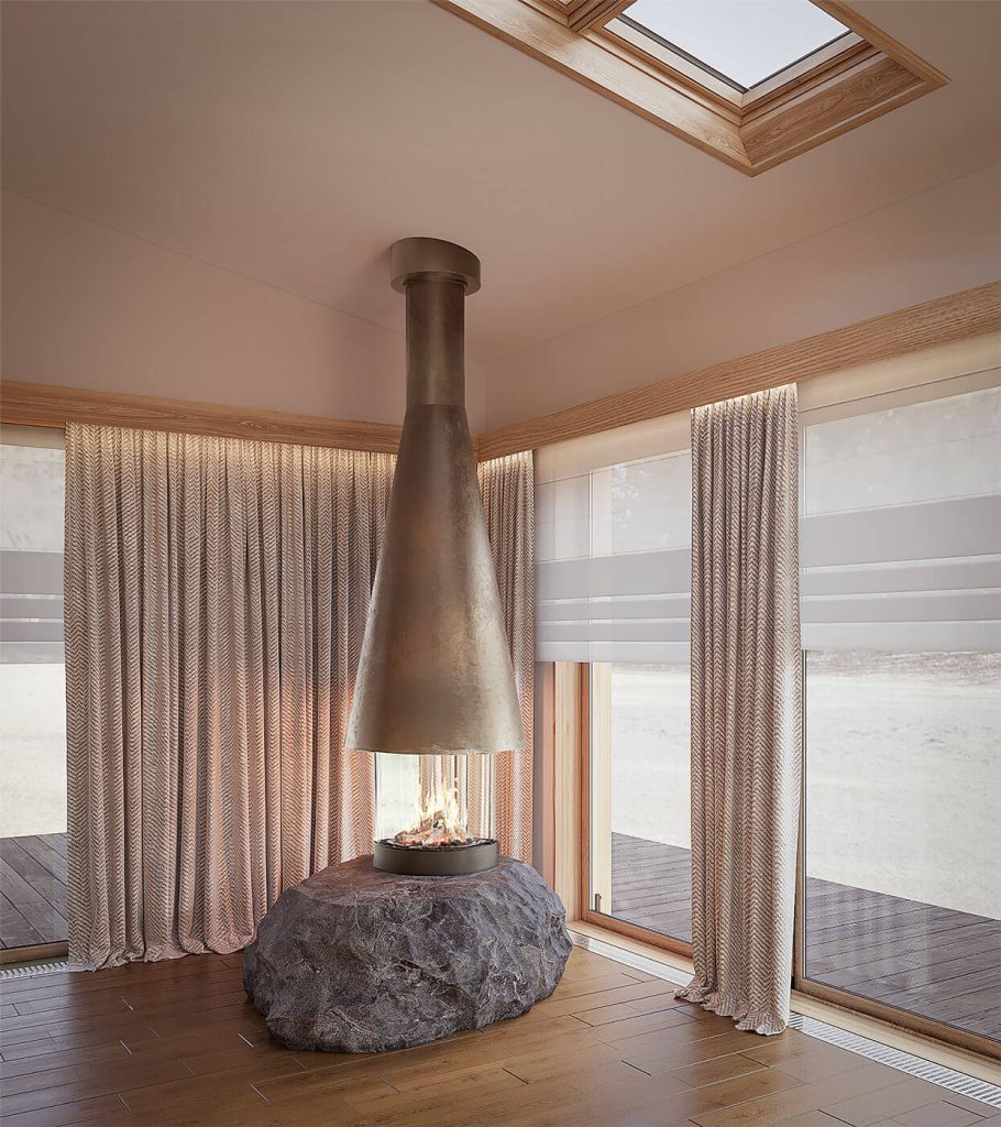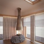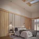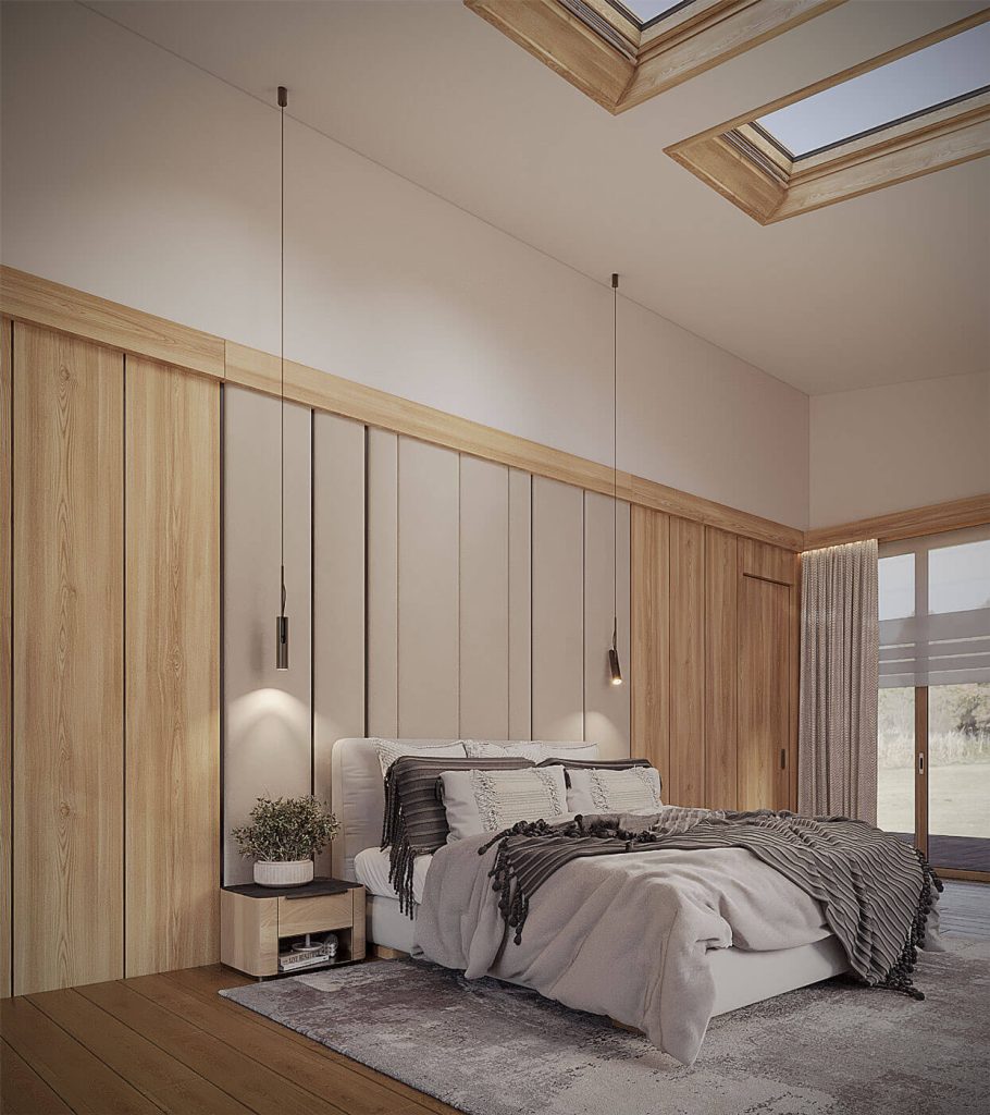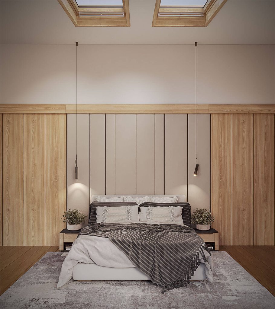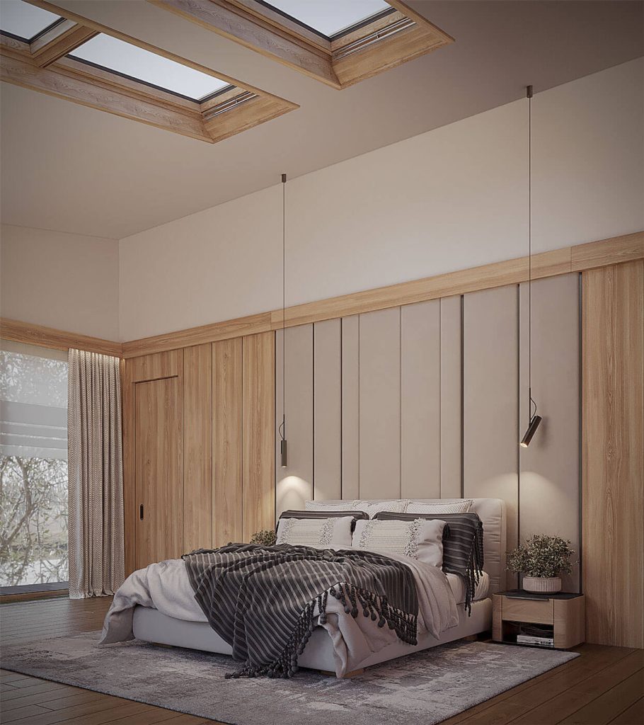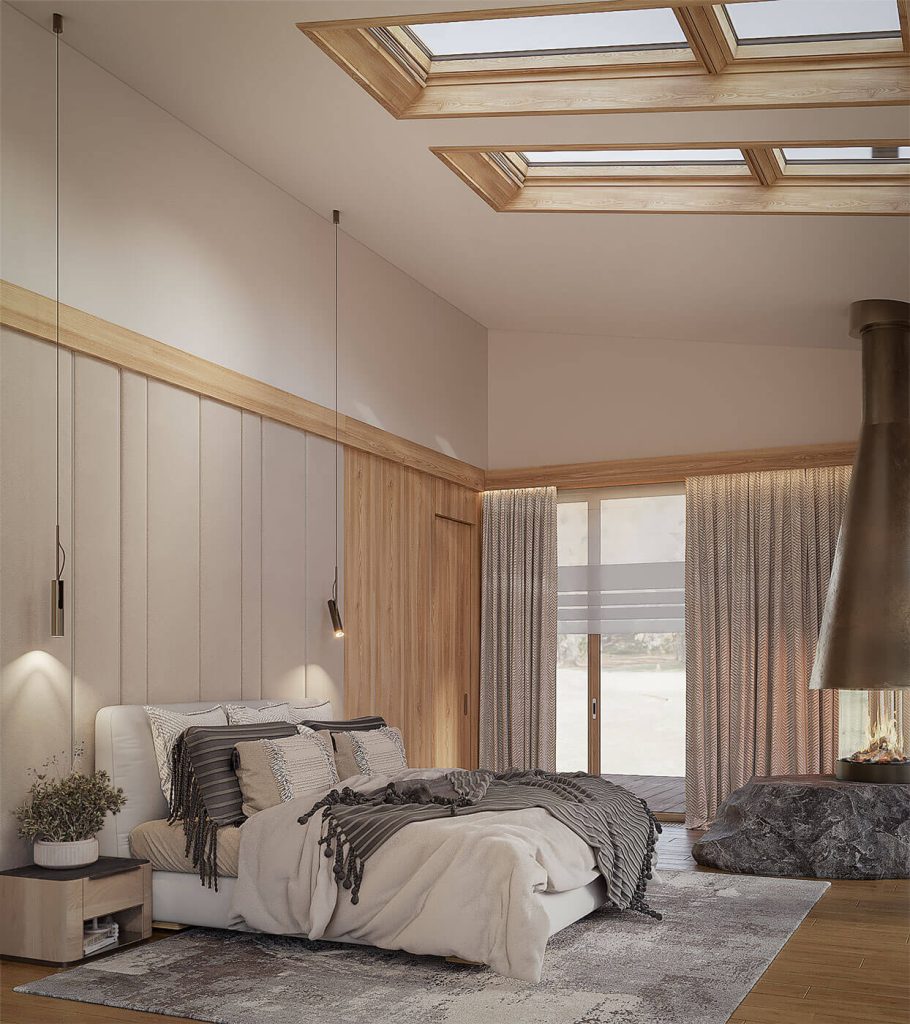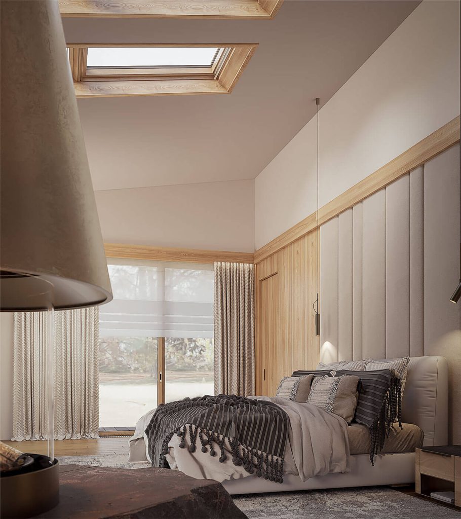 Планировочная структура подчинена принципам логики и комфорта: свободная циркуляция воздуха, отсутствие лишних перегородок, использование нейтральных оттенков и натуральных материалов — камня, дерева, стекла. Мансардные окна формируют ритм помещения, создавая равномерное распределение света в течение дня.