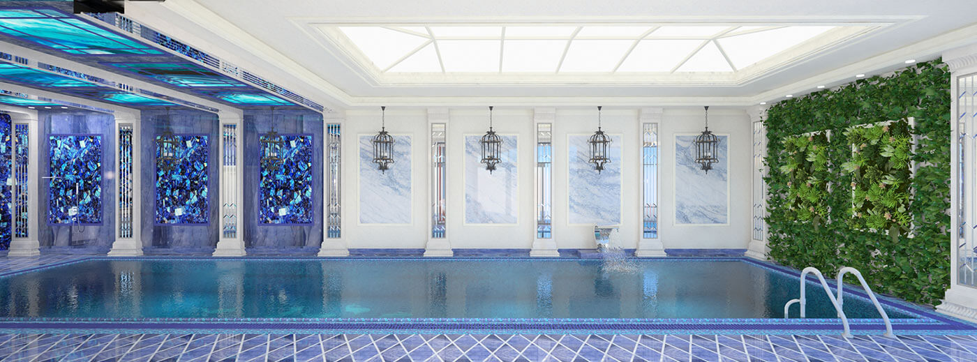 Дизайн бассейна в частном загородном доме выполнен в бело-синей гамме, напоминающей о теплом море-океане.