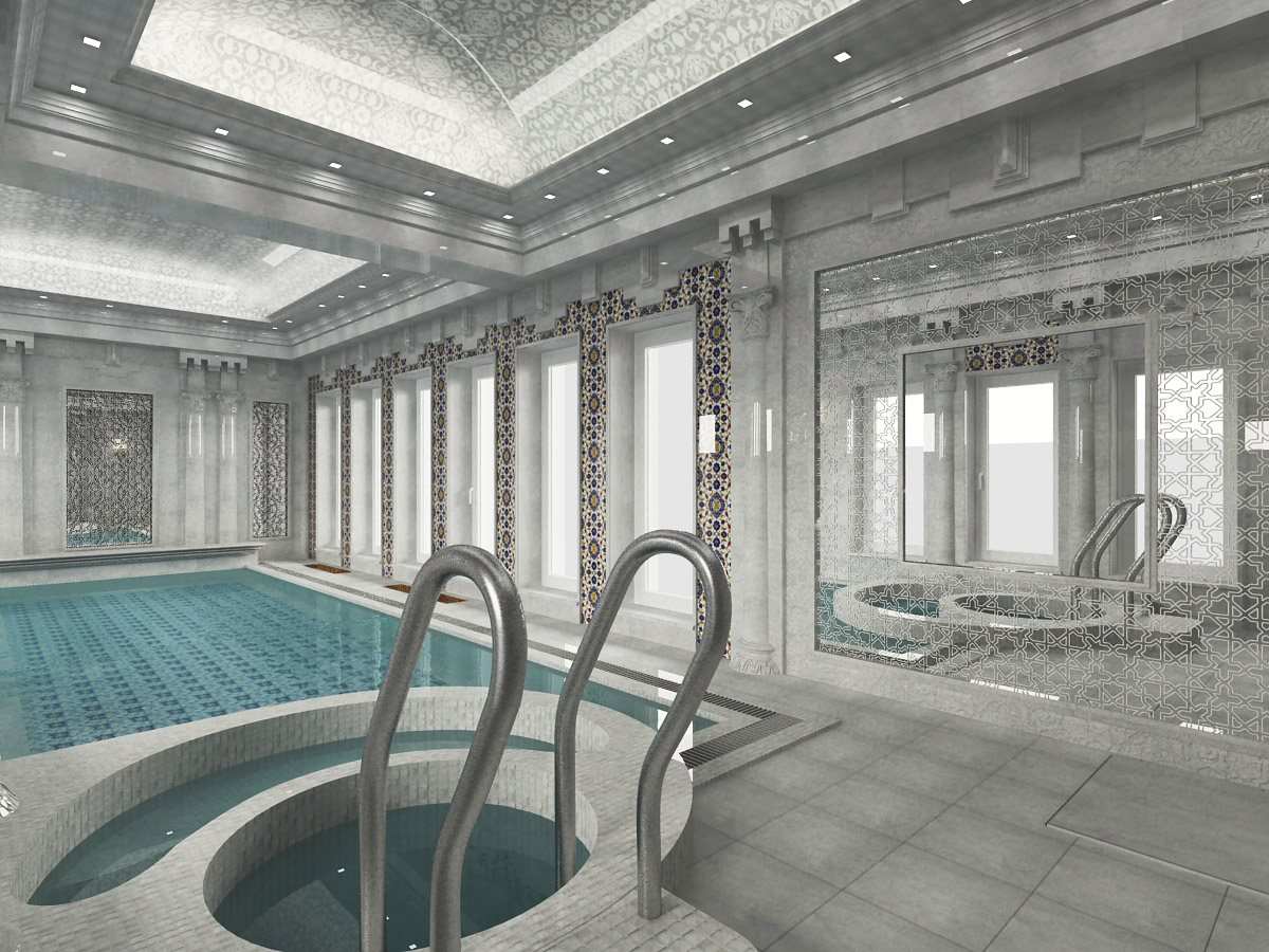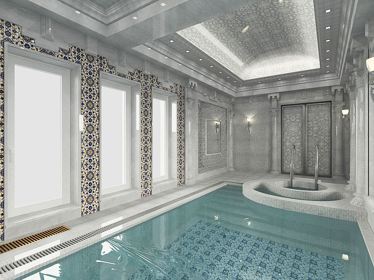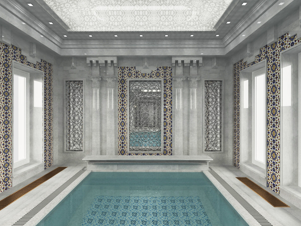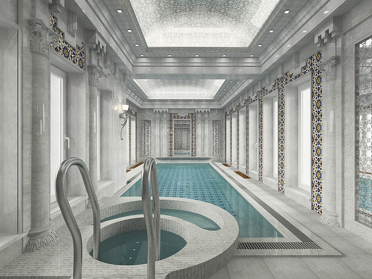 В проекте используется кварцевая плитка «Изник». Каждая плитка расписана вручную. Конечно, такое красивое решение должно быть обрамлено в роскошный мрамор. Все колонны, пилястры и бордюры выполнены из массива камня (не облицовка). Материалы: мрамор (Турция).