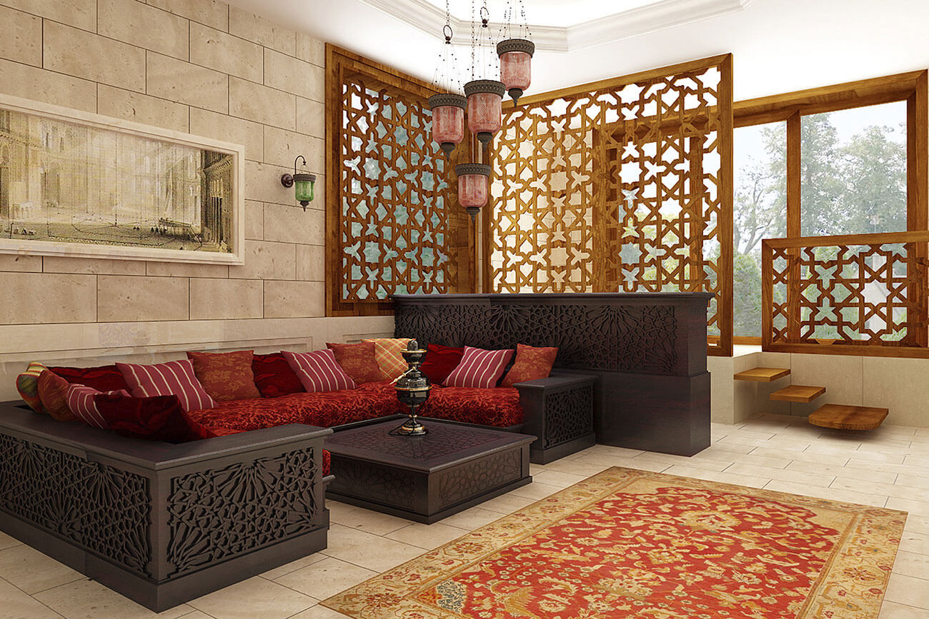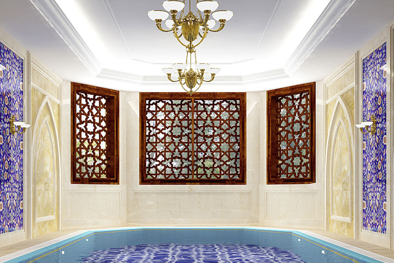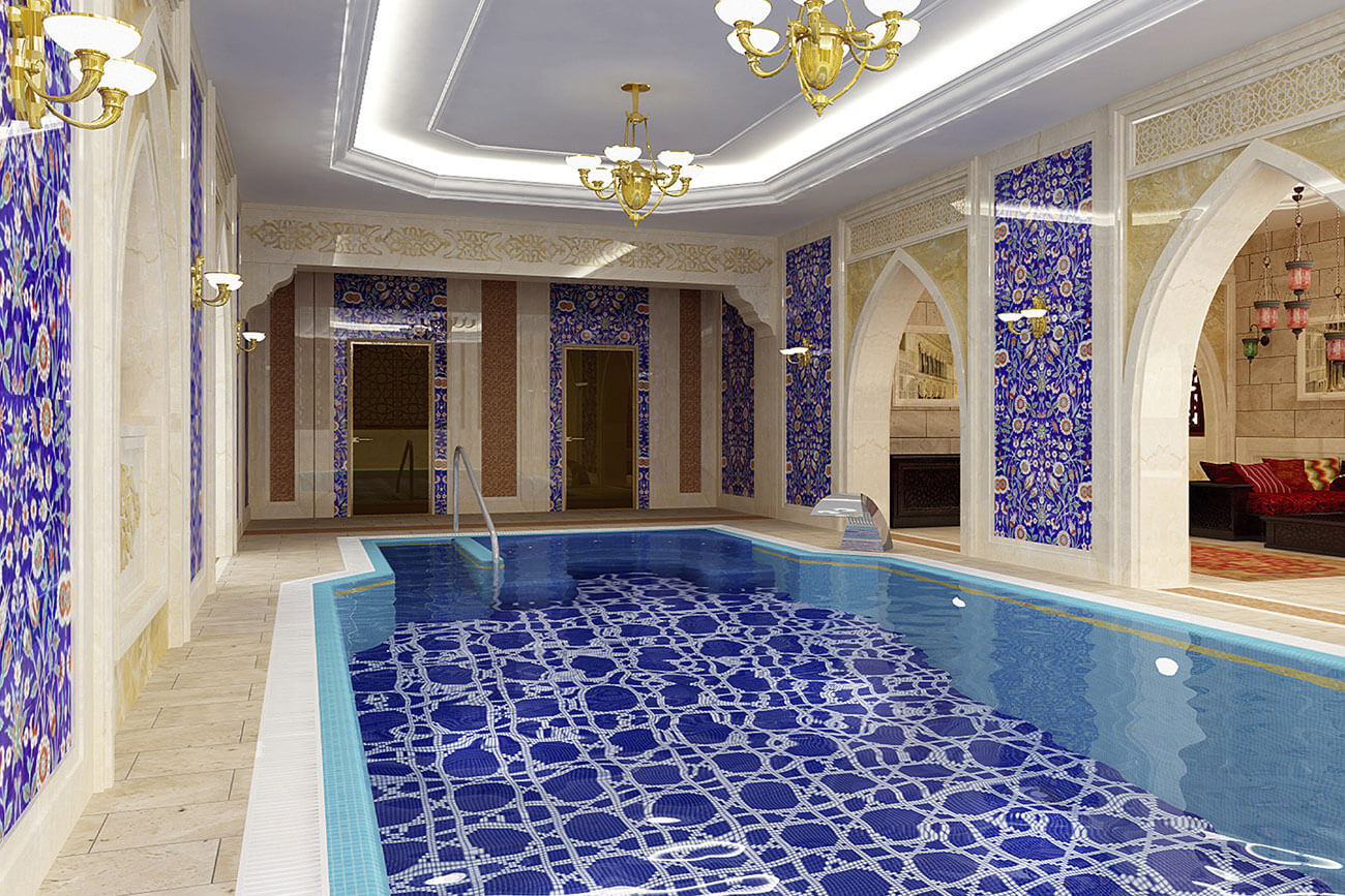 Этот бассейн был создан по заказу интернациональной семьи. Восточный мужчина и славянская девушка решили объединить восточные мотивы и европейскую атмосферу. Так в интерьере появилась резная мебель и арки. Особая ценность — панно из кварцевой плитки изник. Ее будет делать под заказ в древнем турецком городе Изник. Именно эти изразцы до сих пор украшают мечети и дворцы Турции.