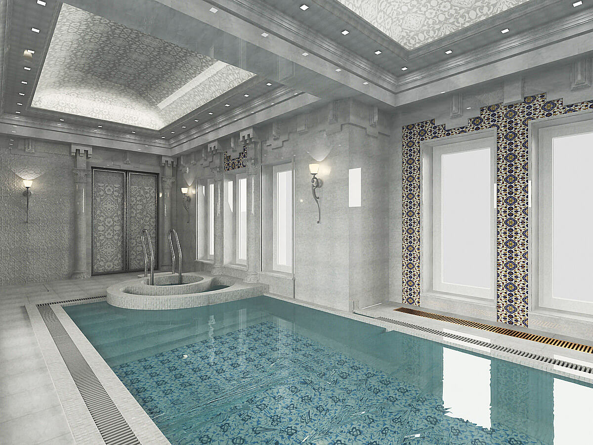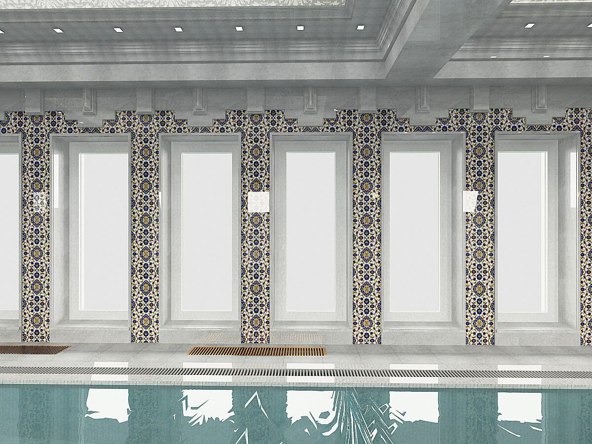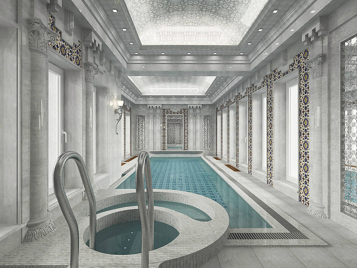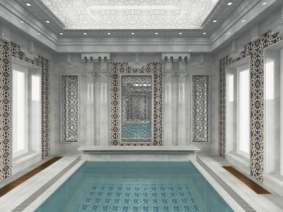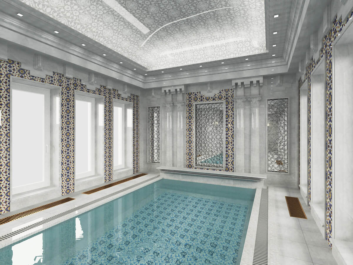 Использованные отделочные материалы: мрамор белый «Мугла», кварцевая плитка ИЗНИК, отрисованная специально под дизайн (для данного проекта были созданы специальные новые цвета из натуральных камней, которые ранее не применялись, все узоры отрисованы вручную, покрыты глянцевой глазурью), белая мозаика для чаши бассейна и керамическая восточная плитка для облицовки дна бассейна.