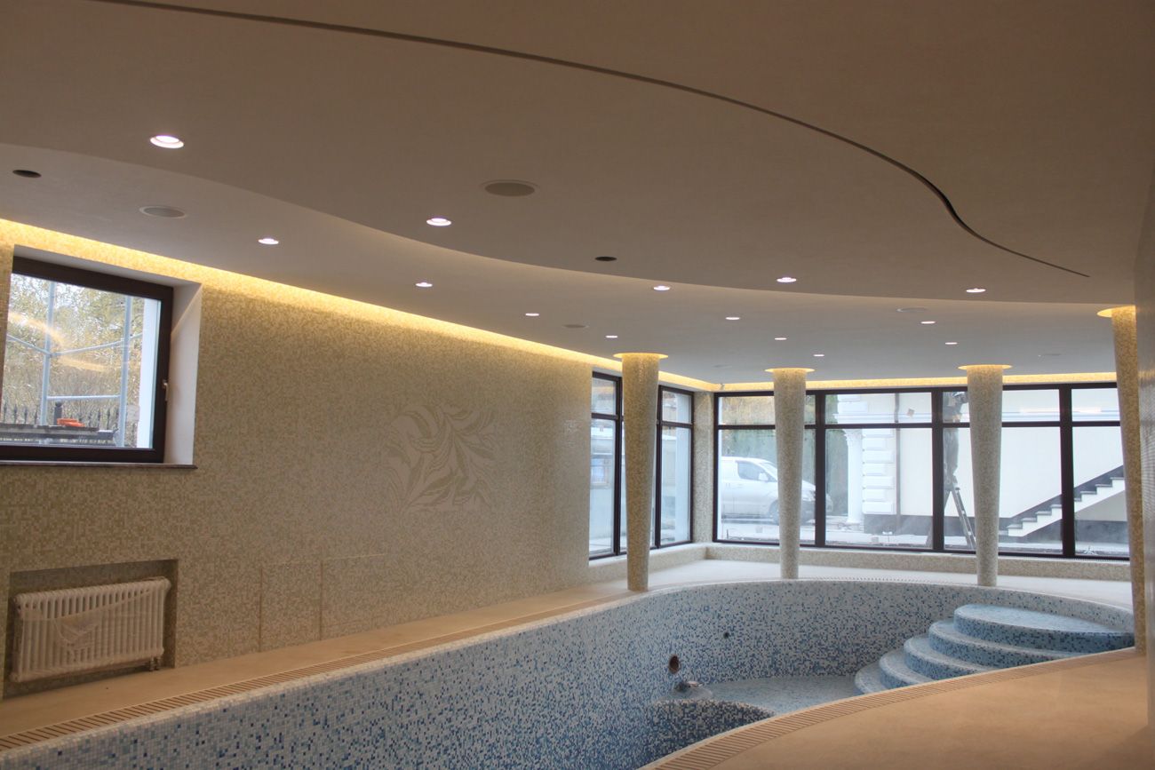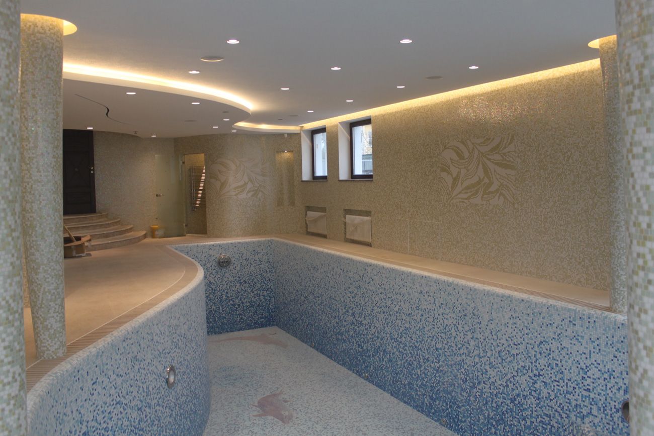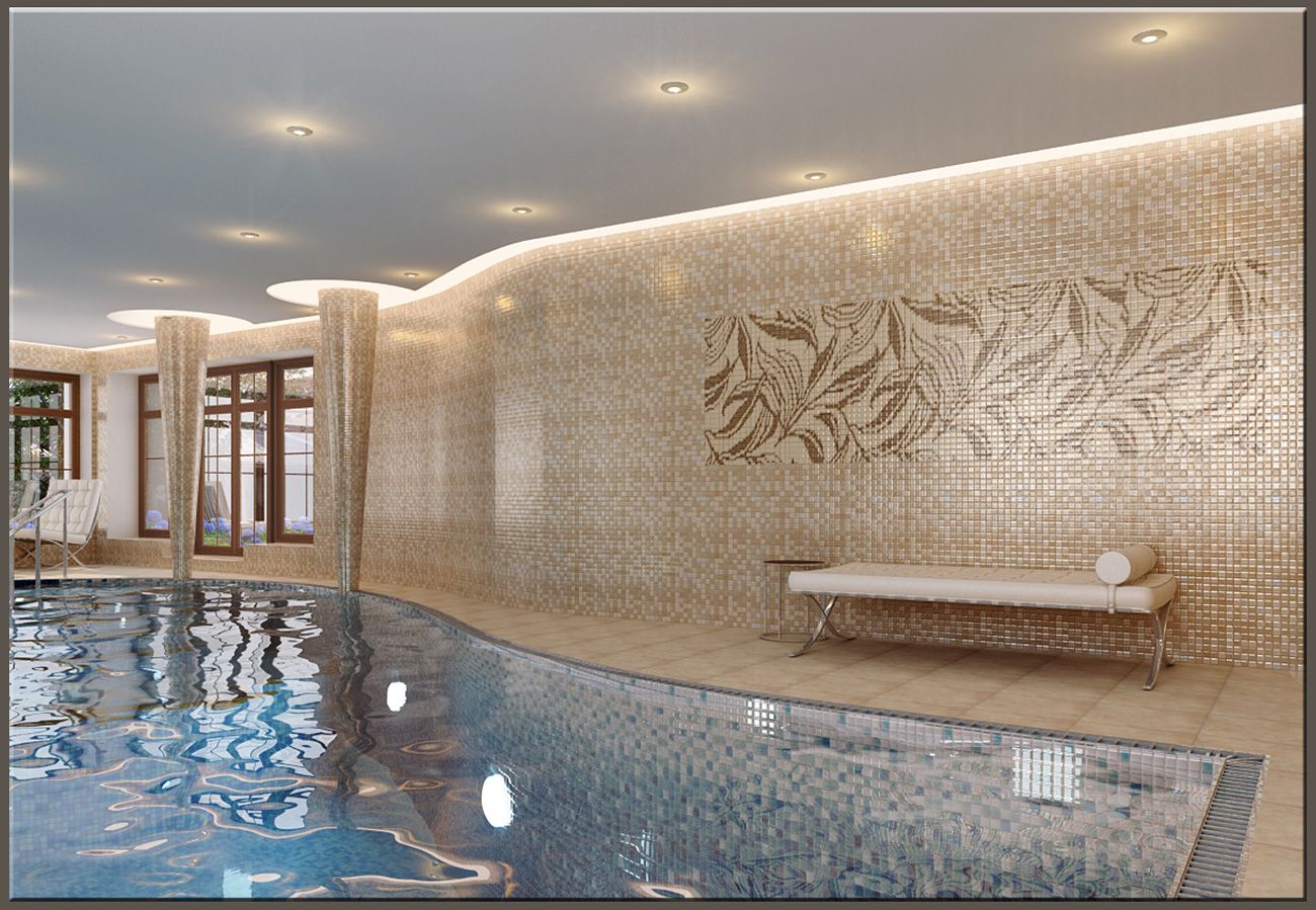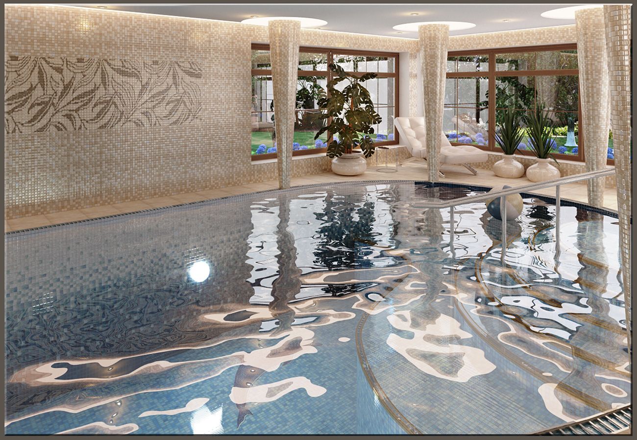 Несущие колонны, которые использовали от проседания потолка над зоной бассейна, превратились в сосульки, перетекающие из потолка в чашу бассейна. Был вариант с голубой мозаикой (как будто вода льется из потолка), но потом отказались, оставили бежевую мозаику фабрики Trend.