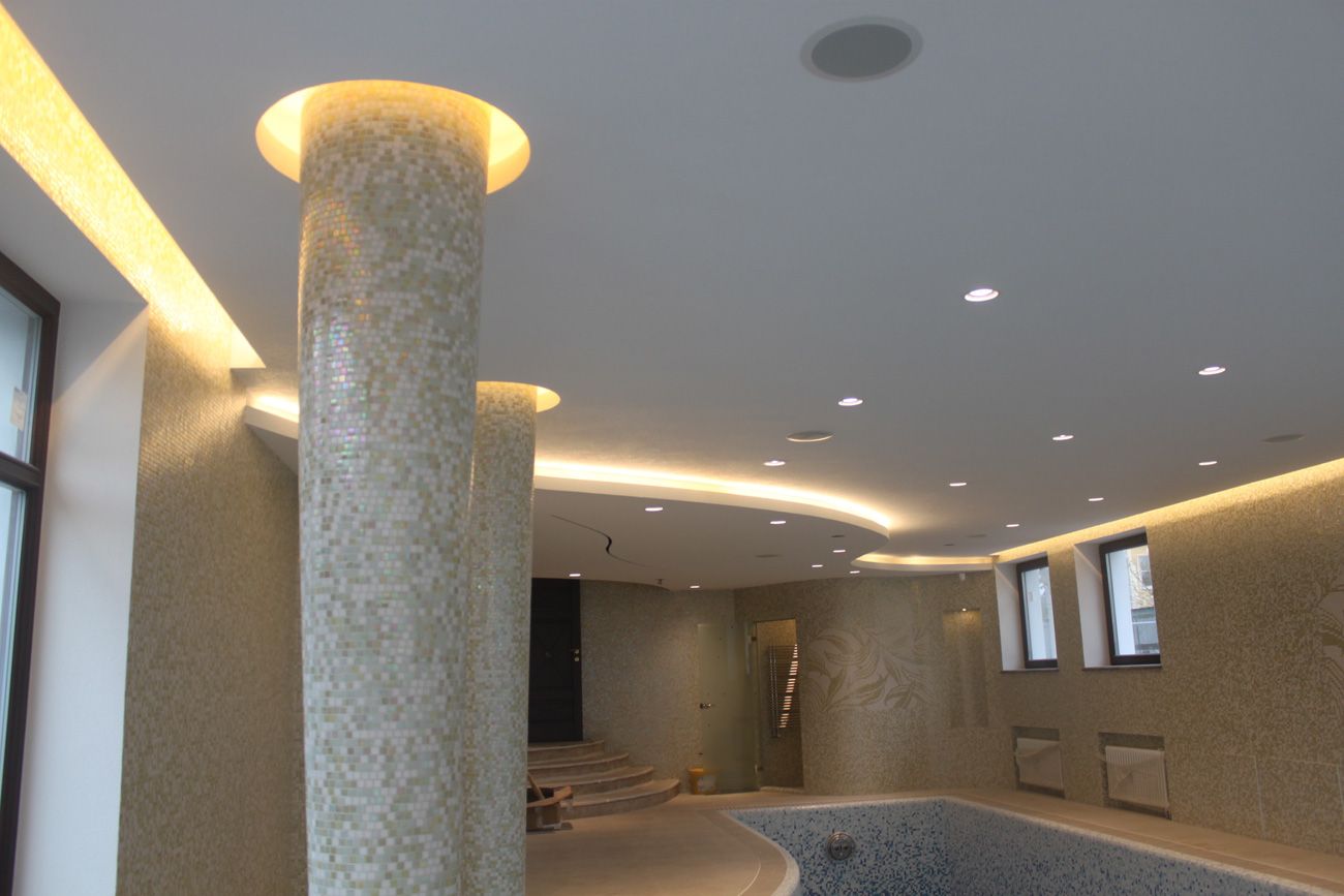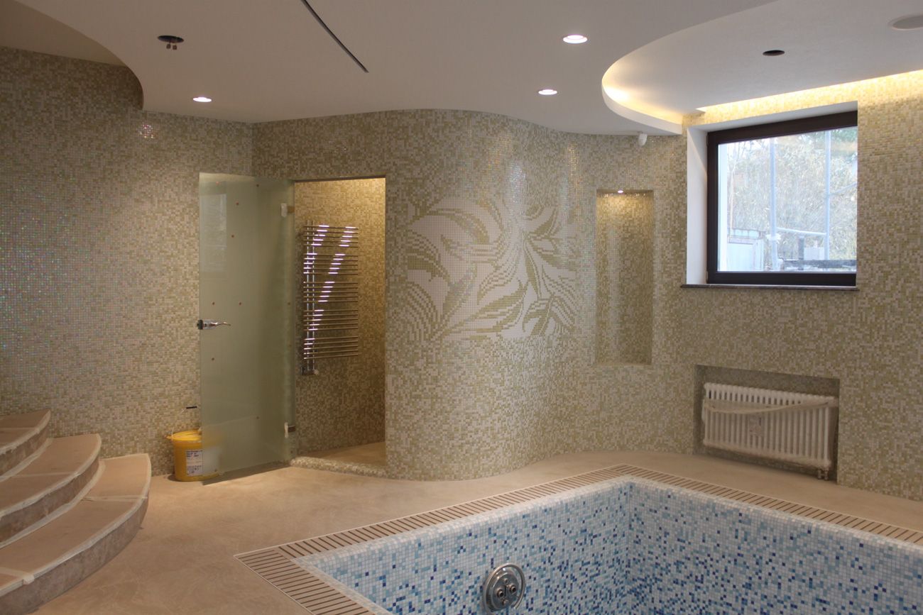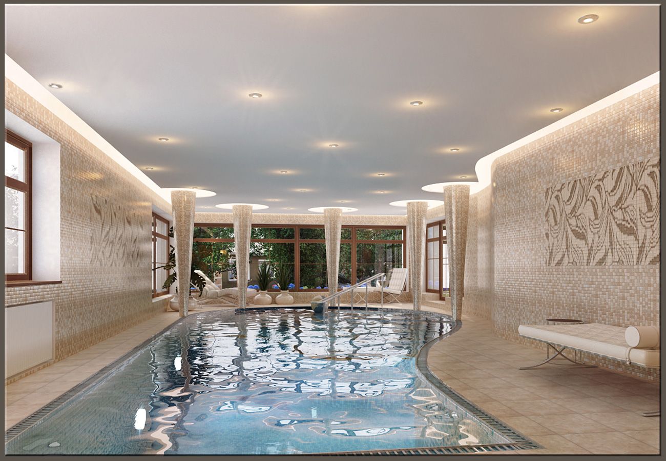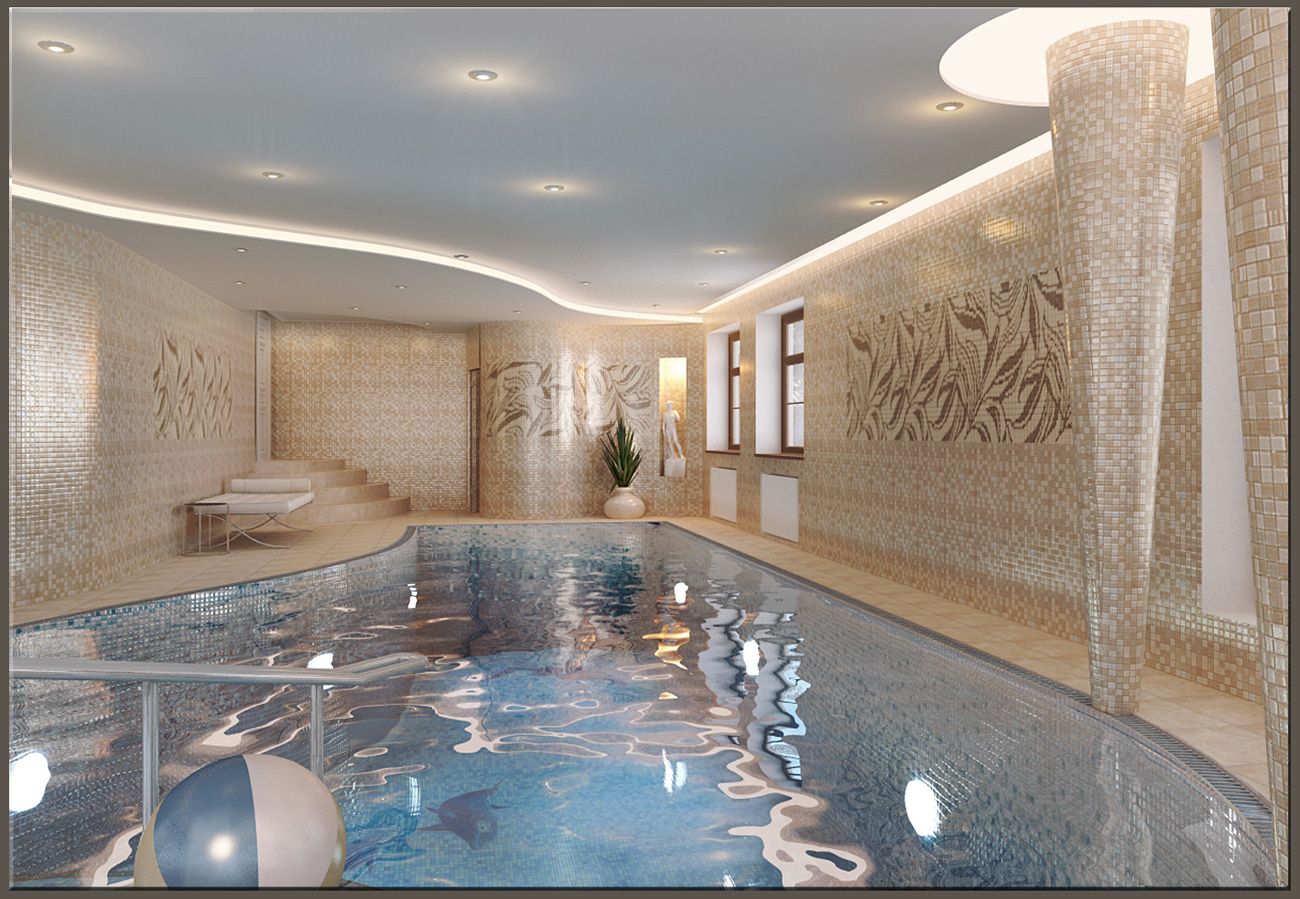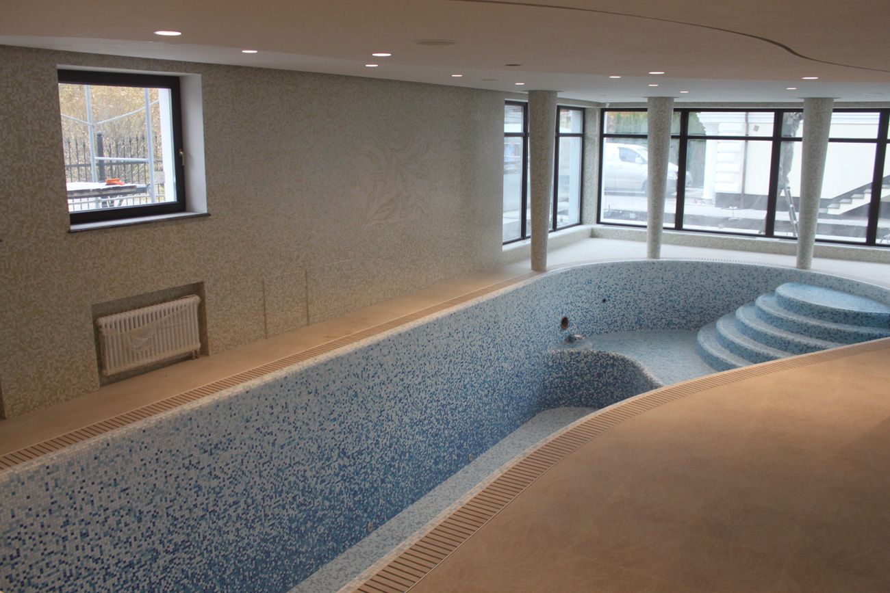 Несущие колонны, которые использовали от проседания потолка над зоной бассейна, превратились в сосульки, перетекающие из потолка в чашу бассейна. Был вариант с голубой мозаикой (как будто вода льется из потолка), но потом отказались, оставили бежевую мозаику фабрики Trend.