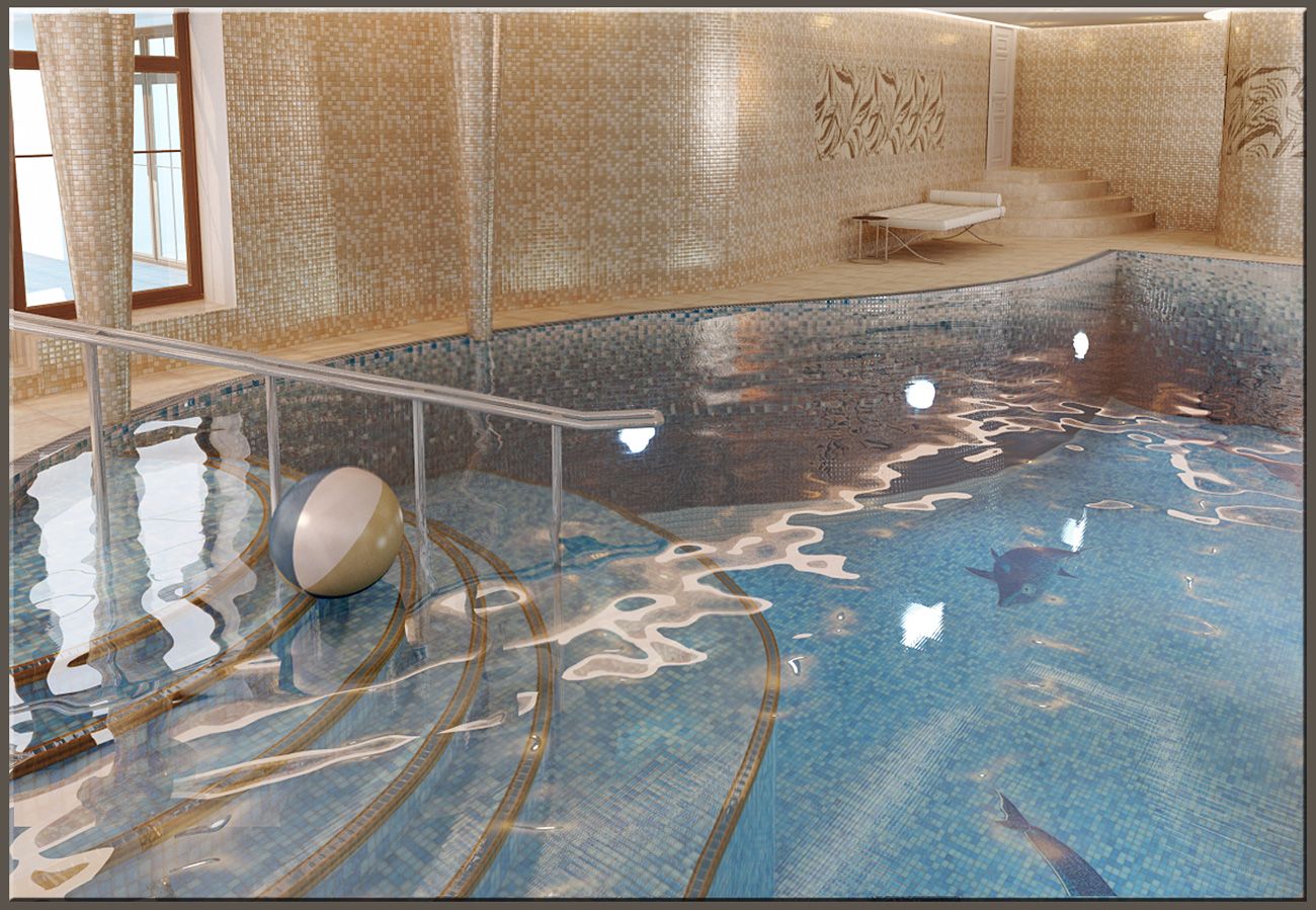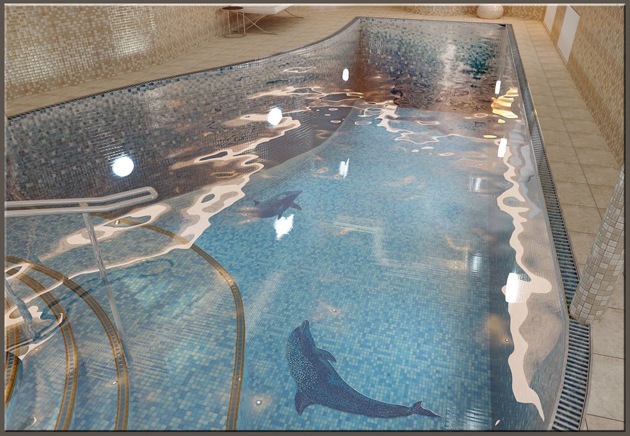 Для стенок чаши бассейна использована мозаика EUCALYPTUS c растяжкой от светлого к темному из коллекции AQUATICA. H2O. Дно чаши выполнено из плитки OCEANIC из этой же коллекции. Три дельфина на ней — из коллекции I DECORI 2 -GEORGA и 1 MILDRED.