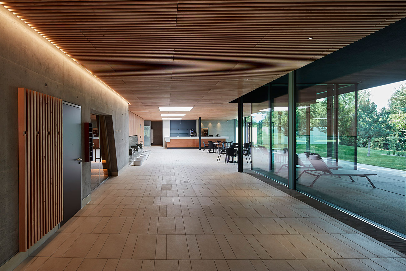 В интерьере комплекса использован прием разделения общественных зон прозрачными большеформатными перегородками. Это расширяет пространство и стирает видимые границы между зонами. Волнообразный реечный потолок плавно переходит из одного помещения в другое и благодаря прозрачным перегородкам воспринимается единым архитектурным элементом.