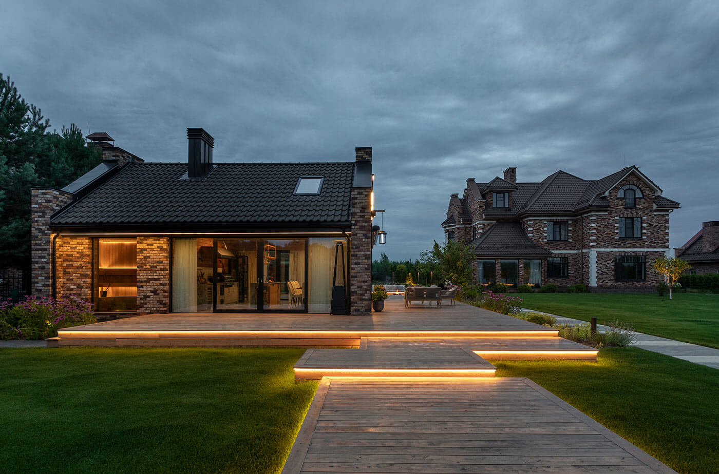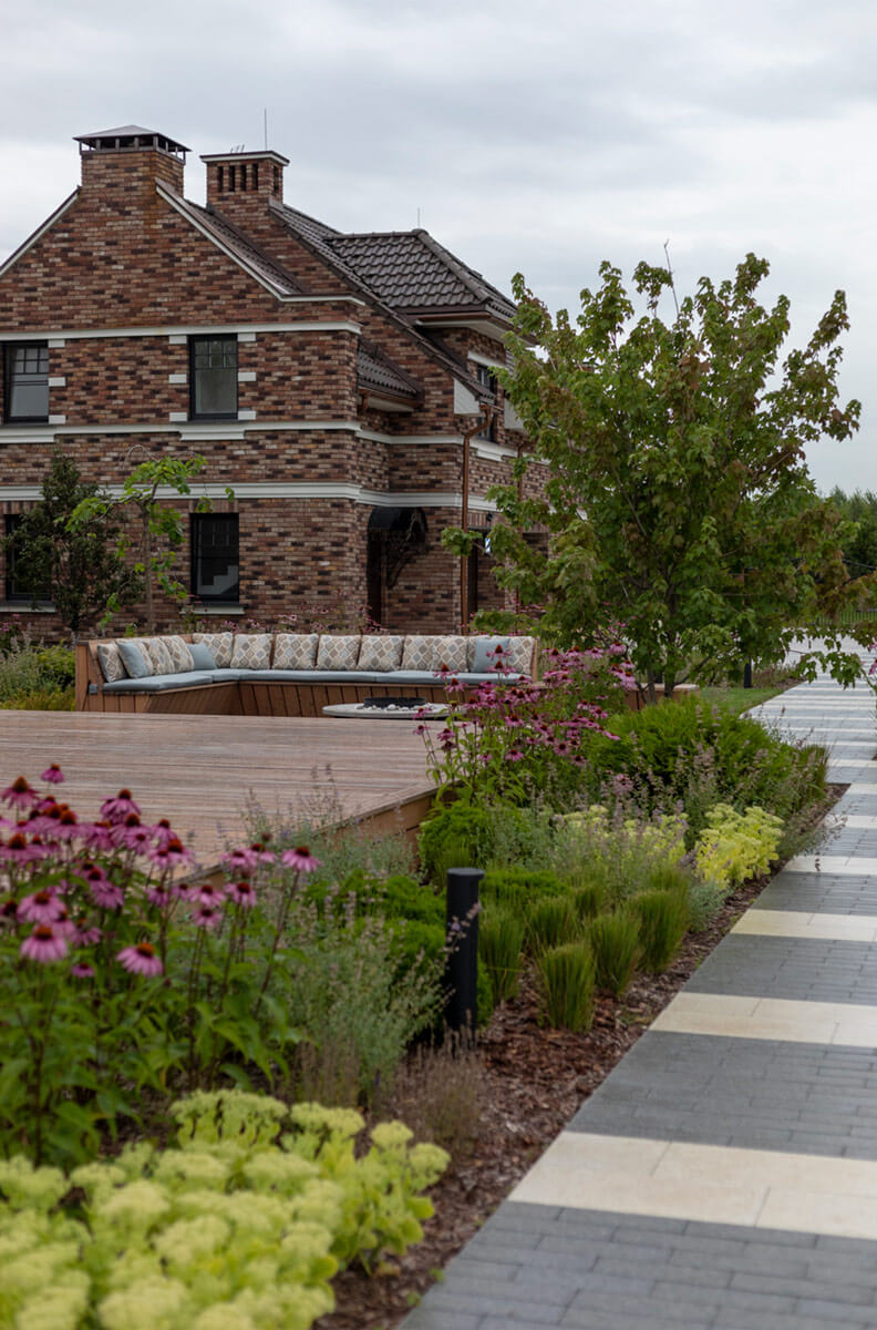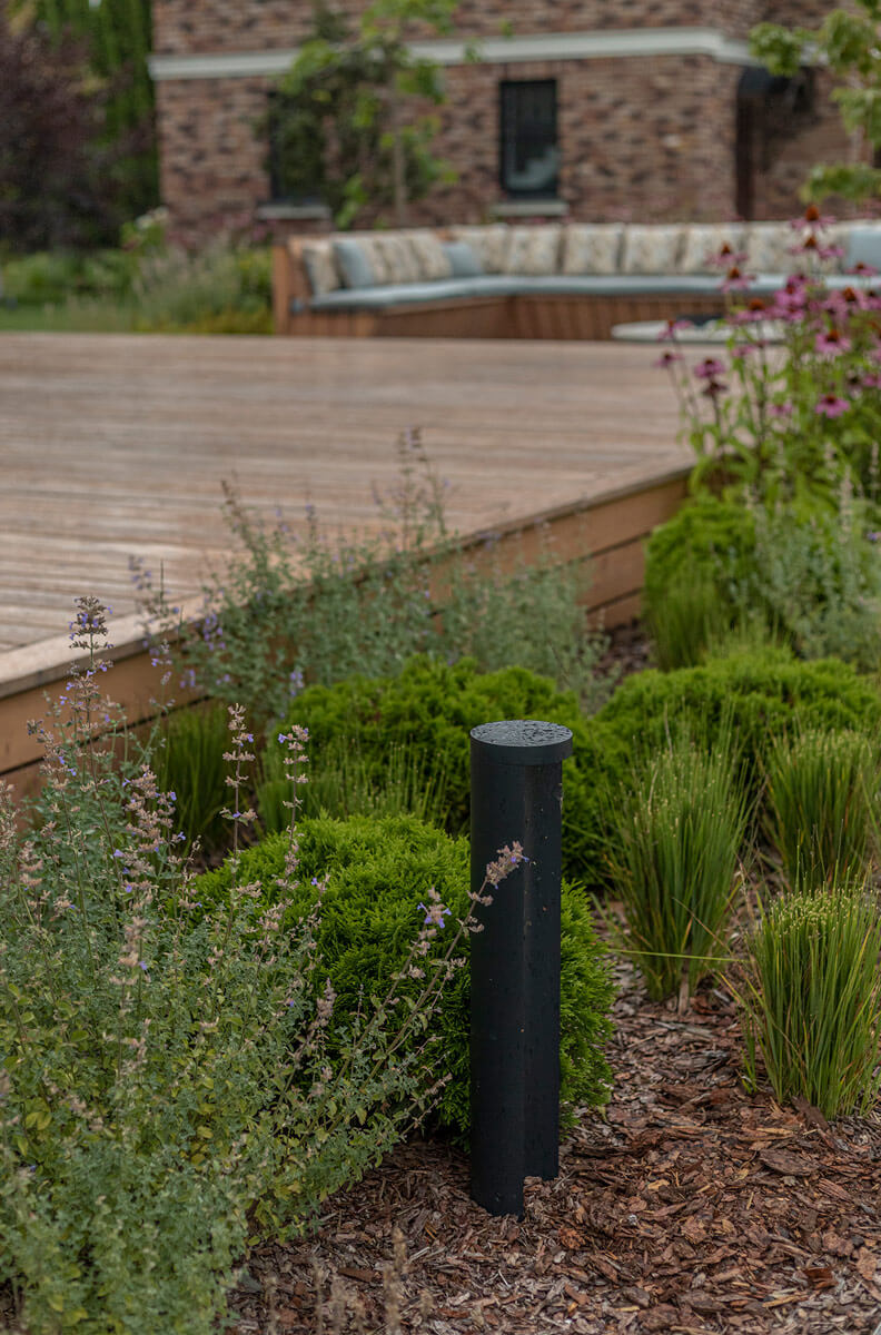 Для комфортного времяпрепровождения вечером предусмотрено функциональное и декоративное освещение, заложены разные сценарии подсветки: высокие болларды для освещения парковочной зоны и входной группы, метровые фонарики для всесезонной подсветки дорожек, прожекторная подсветка акцентных деревьев, светодиодная лента в настиле.