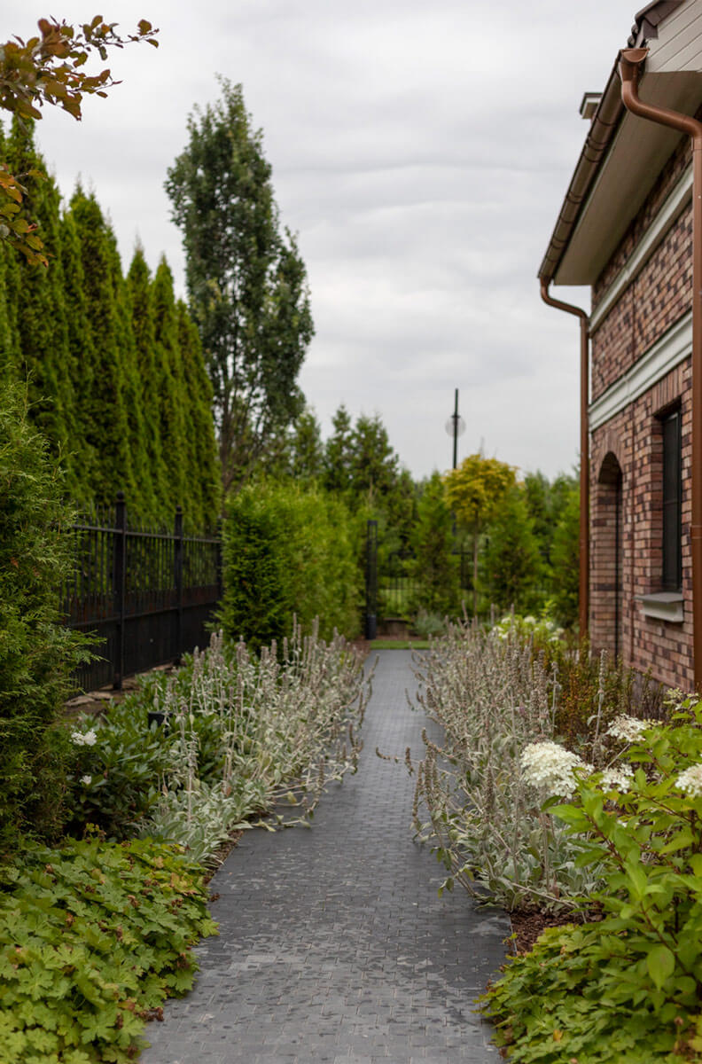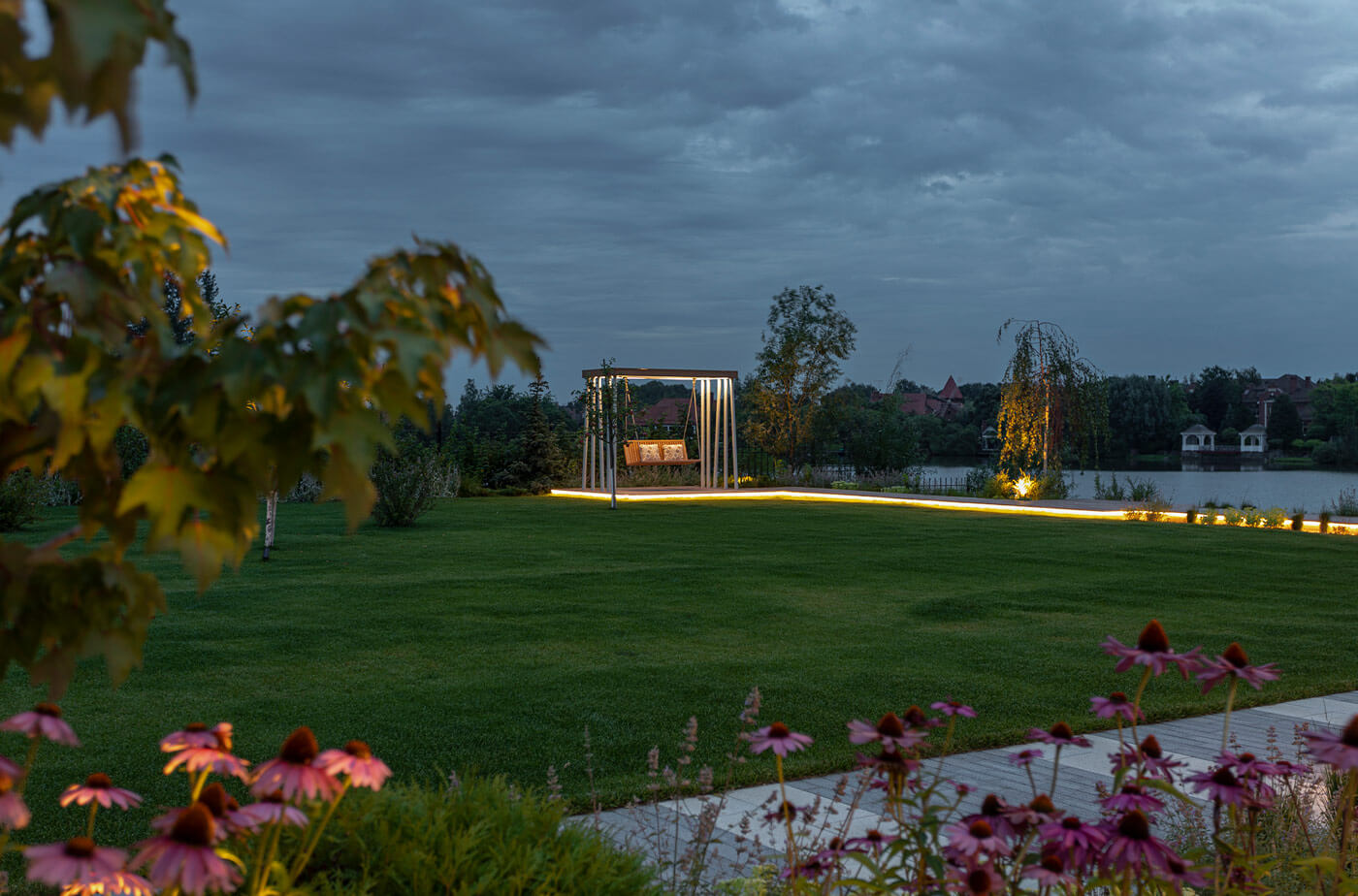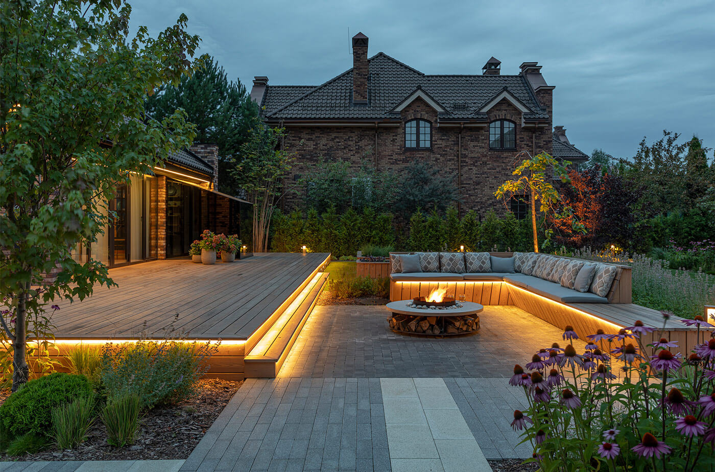 Для комфортного времяпрепровождения вечером предусмотрено функциональное и декоративное освещение, заложены разные сценарии подсветки: высокие болларды для освещения парковочной зоны и входной группы, метровые фонарики для всесезонной подсветки дорожек, прожекторная подсветка акцентных деревьев, светодиодная лента в настиле.