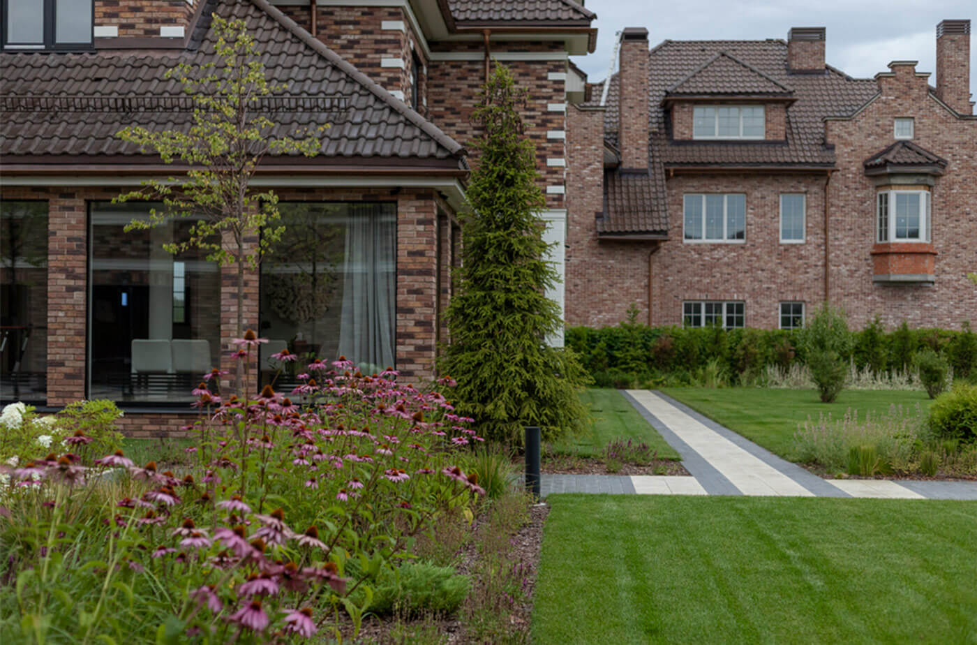 Общая стилистика озеленения и подобранный ассортимент растений соответствуют концепции бельгийских садов: правильные геометричные формы, цветники малого ухода, стриженные элементы озеленения.