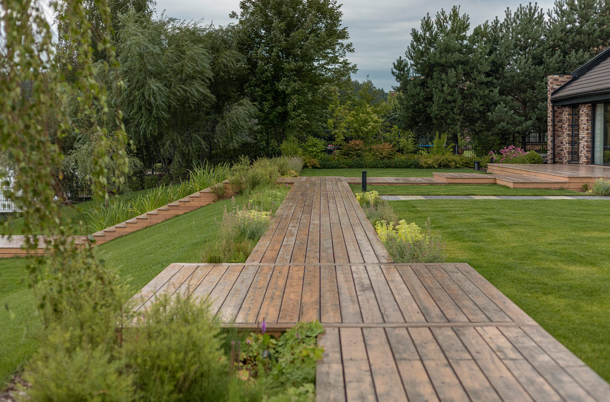 Периметр участка оформлен живой изгородью из Туи Brabant, которая создает приватность пространства. Центральной точкой притяжения является видовая зона отдыха с костровой чашей и скамьей из лиственницы, обрамленная декоративно-лиственными кленами и естественными цветниками из многолетников непрерывного цветения. В рамках природной концепции мы реализовали сеть деревянных настилов и лестниц, которые позволяют не только удобно передвигаться по саду, но и являются спуском к собственной пристани и береговой зоне.