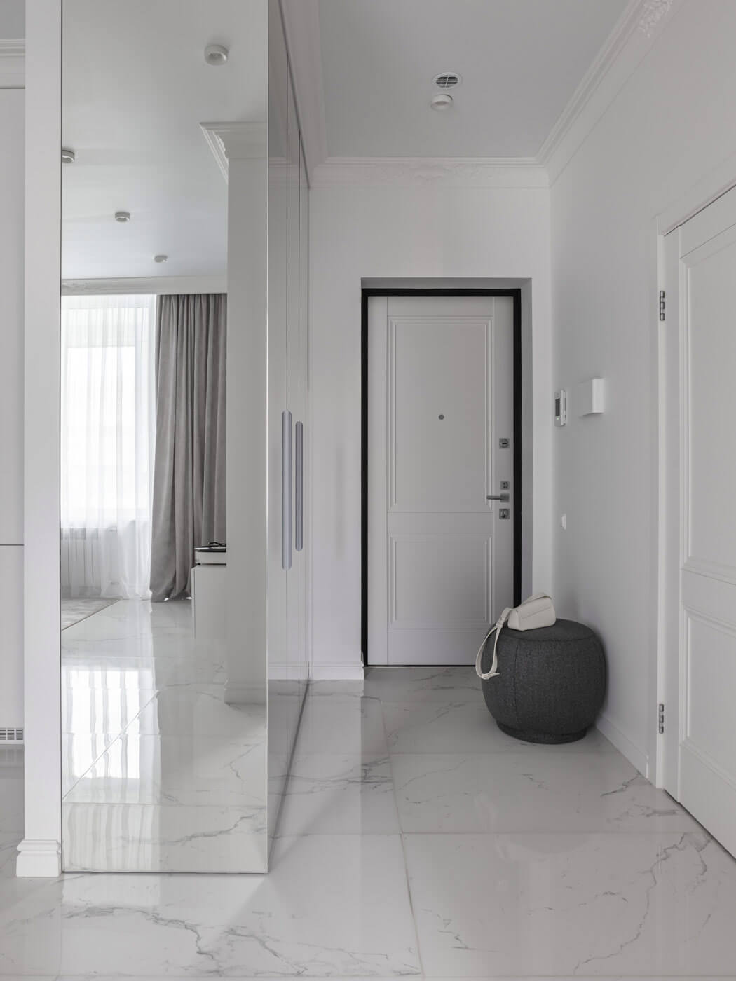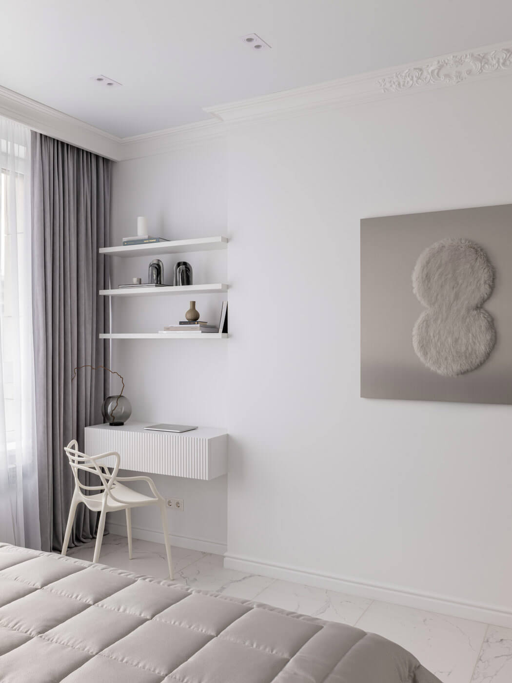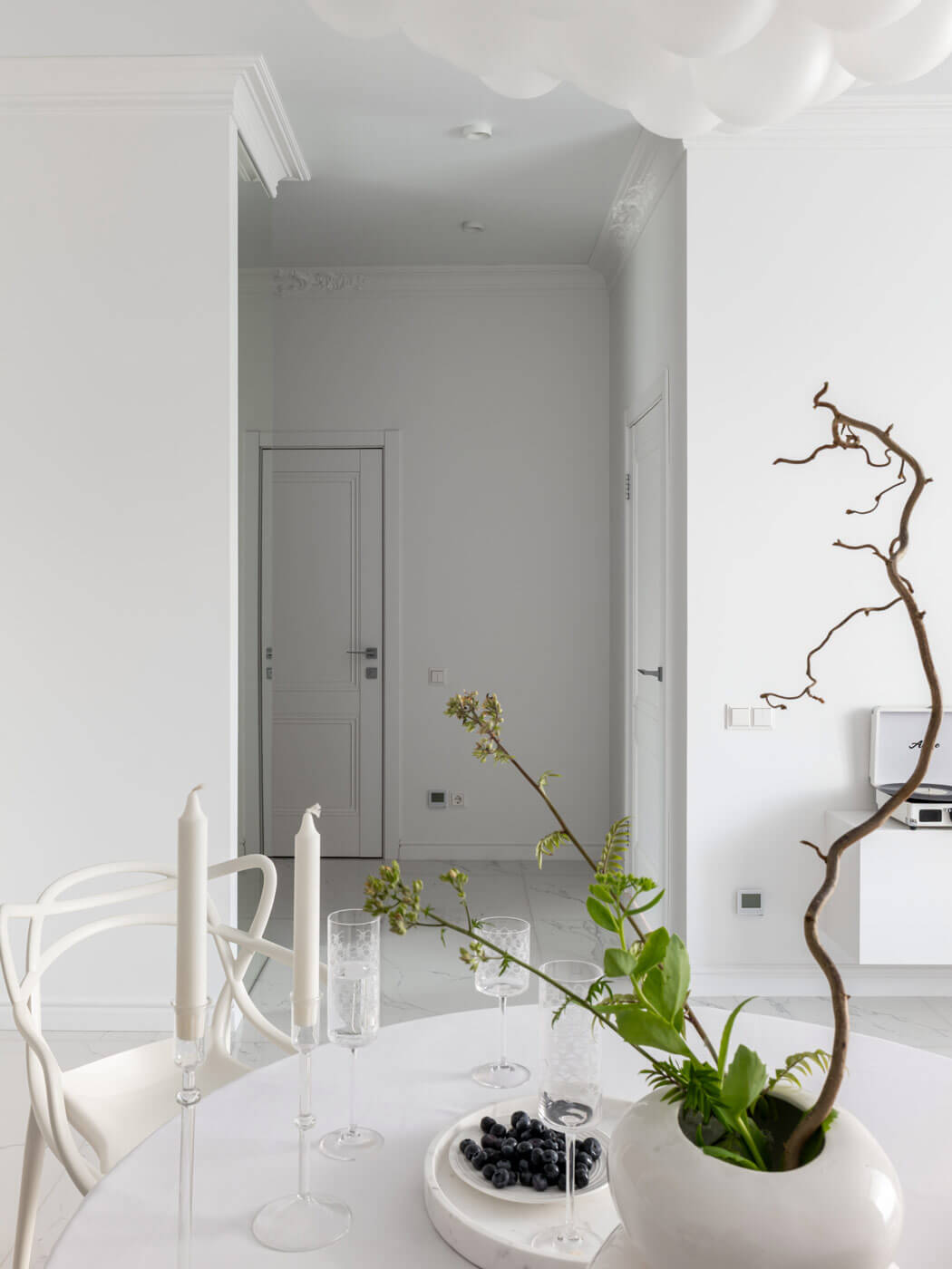 Белый в интерьере — сознательный выбор, приближающийся к медитативной практике. Стены, выкрашенные в тон «белый шёпот», отражают до 80% естественного света, создавая эффект парящего пространства. Французские акценты — тонкая потолочная лепнина в классическом стиле, шкаф с зеркальными фасадами — добавляют интерьеру изысканности, не нарушая его строгой геометрии.
