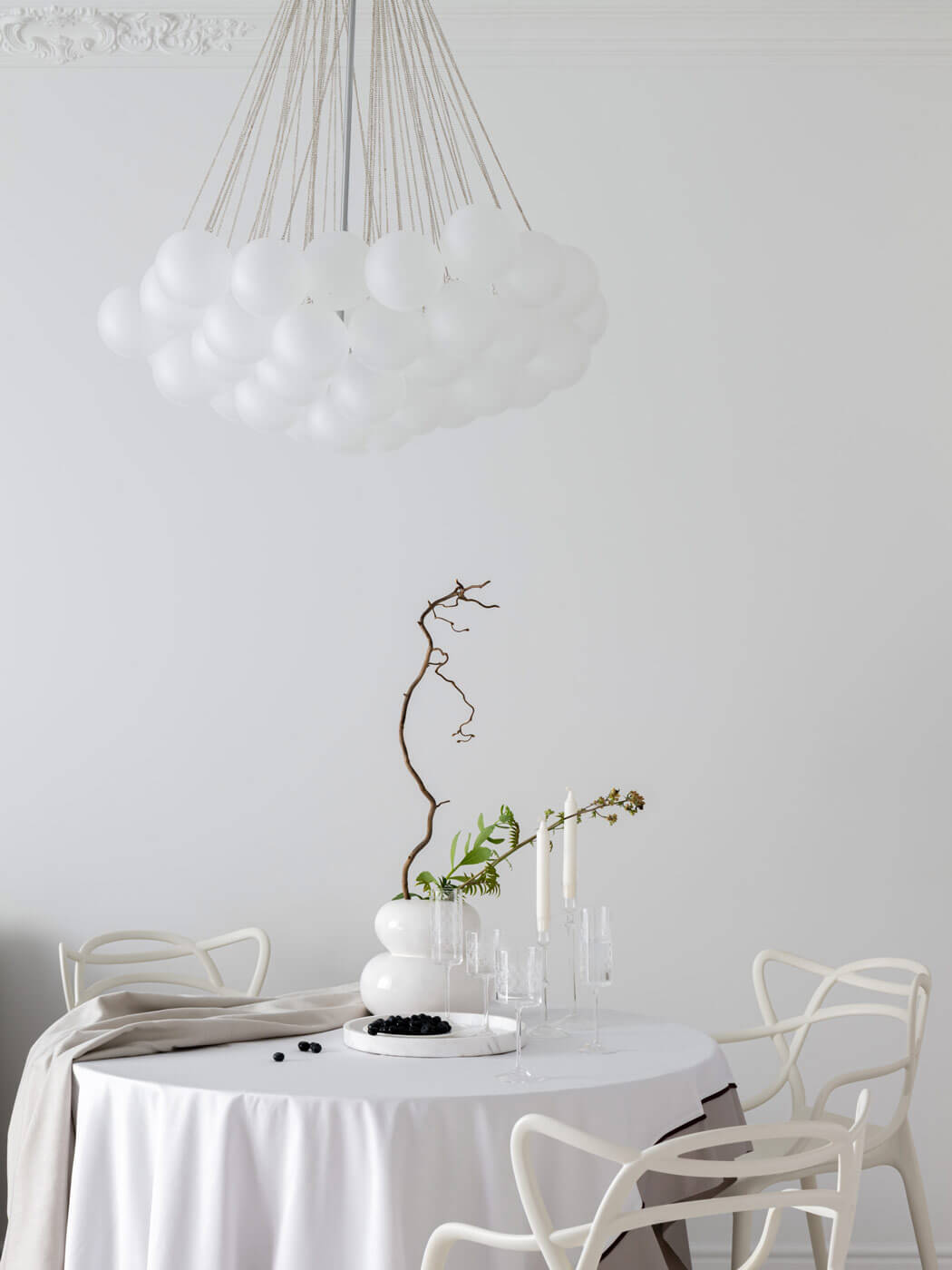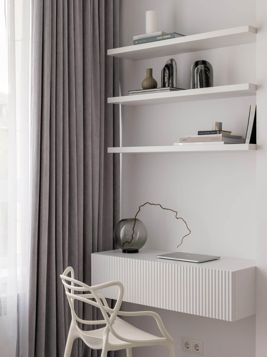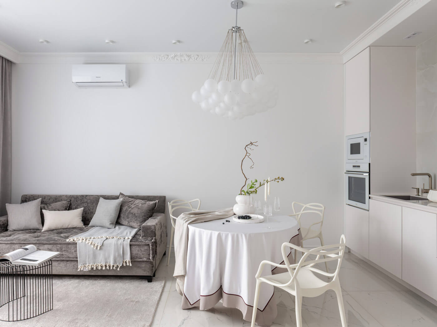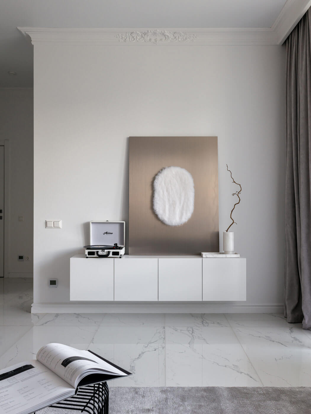 Белый в интерьере — сознательный выбор, приближающийся к медитативной практике. Стены, выкрашенные в тон «белый шёпот», отражают до 80% естественного света, создавая эффект парящего пространства. Французские акценты — тонкая потолочная лепнина в классическом стиле, шкаф с зеркальными фасадами — добавляют интерьеру изысканности, не нарушая его строгой геометрии.