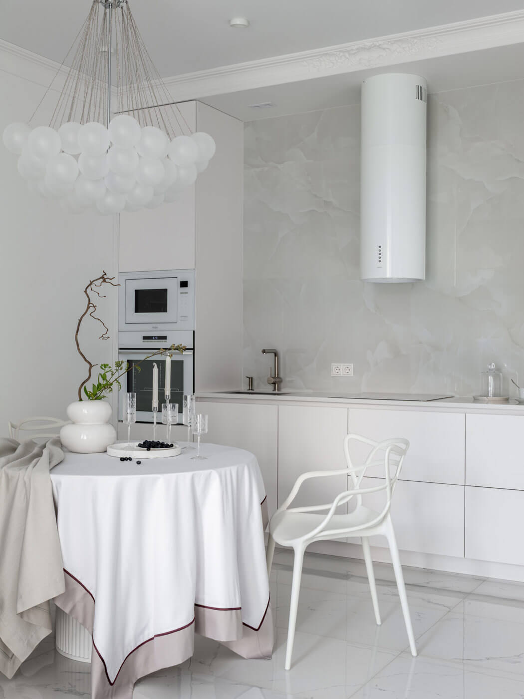 Для матовых фасадов белой кухни мы выбрали покрытие качественной эмалью, которое в использовании очень практично. Столешница из кварцевого агломерата так же удобно в уходе. На фартуке глянцевый крупноформатный керамогранит с текстурой оникс, словно облака.