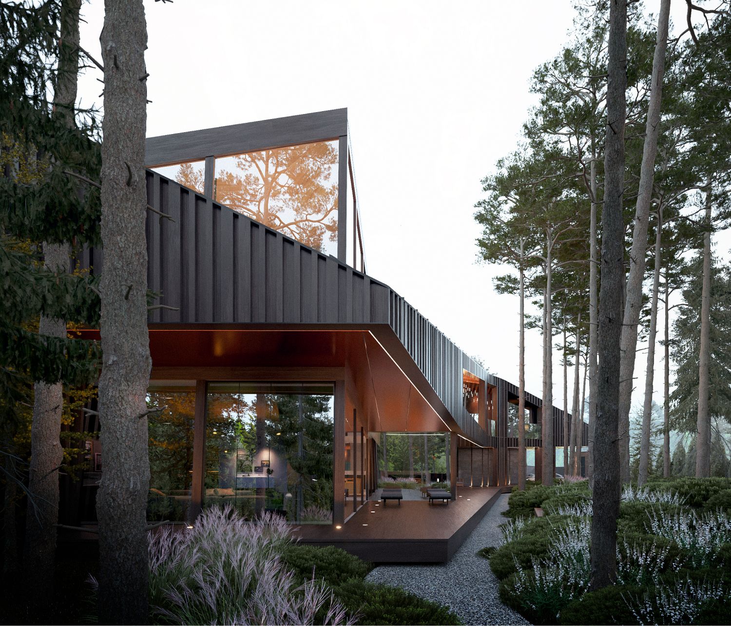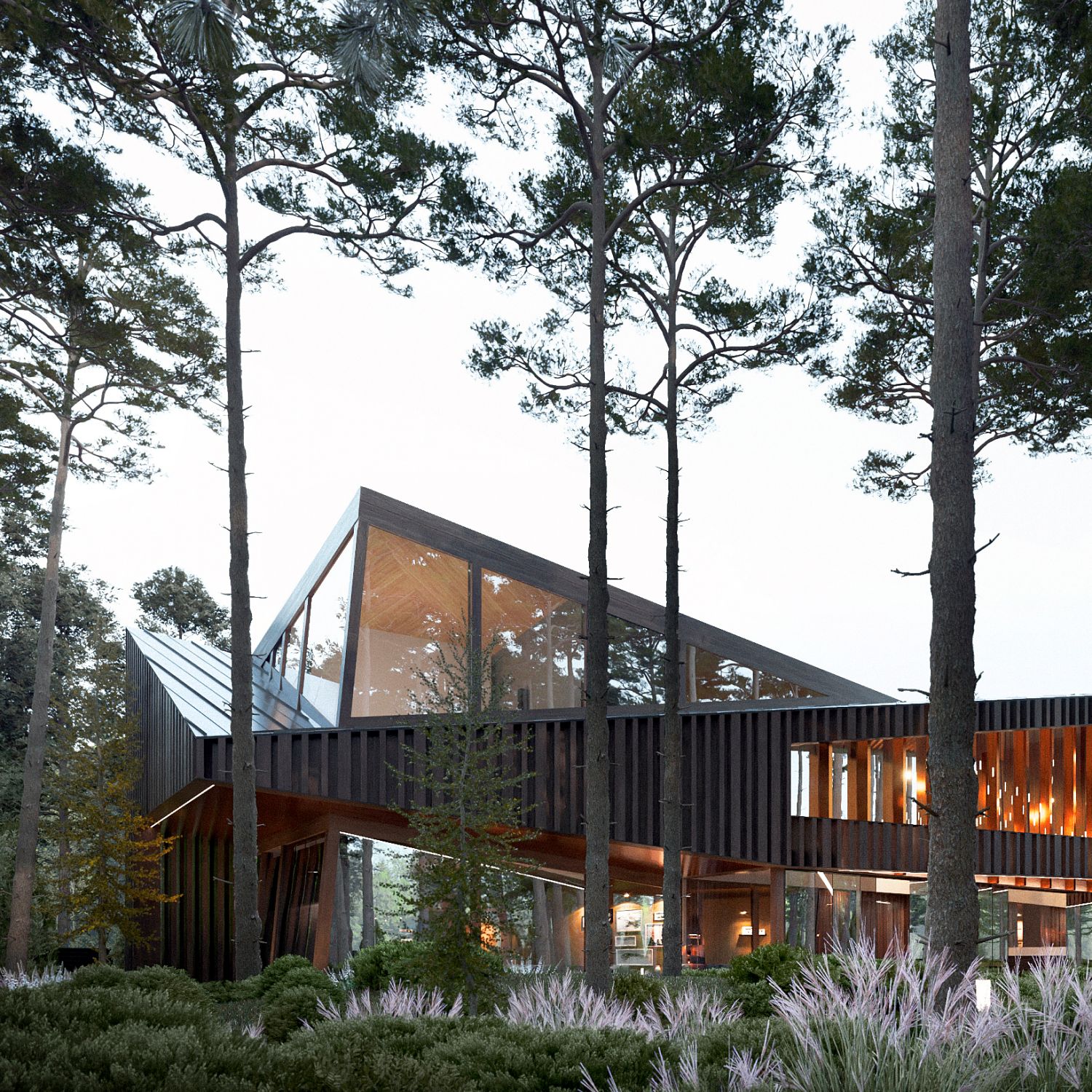 Выразительный силуэт с кровлей в форме крыла самолета задает зданию энергию и узнаваемый характер. Лаконичная геометрия фахверка дополнена элементами из моллированного стекла, смягчающего острые грани фасада. Планировка предусматривает автономную мужскую студию с отдельным входом и усиленной звукоизоляцией — идеальное место для творчества или приватных встреч. Теплая веранда со сдвижным панорамным остеклением позволяет взаимодействовать с природой в любое время года.
