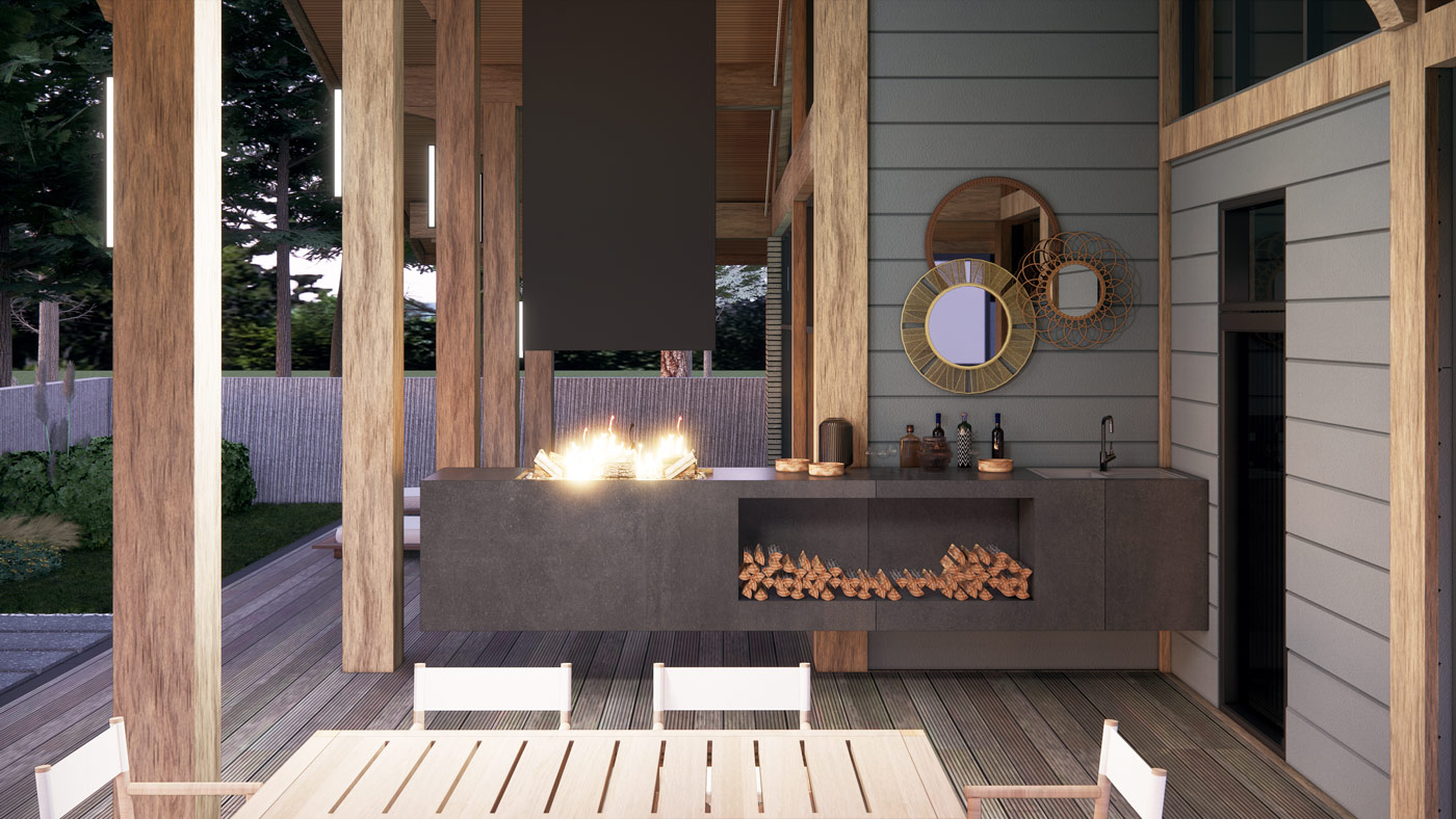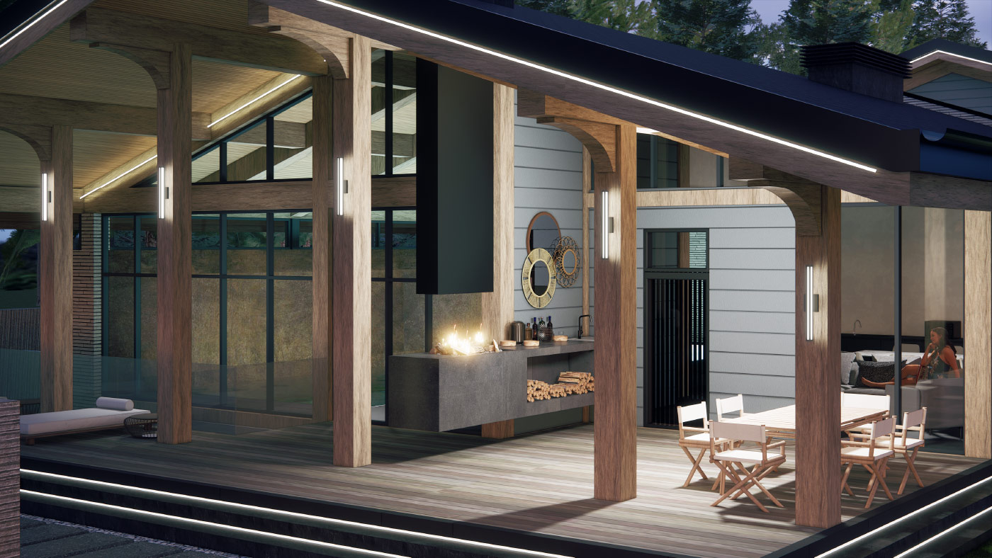 Каждая планировочная зона независима и стоит особняком от остальных зон, так мы достигаем нужного уровня приватности. Участок при зоне СПА – шумный и увеселительный, подразумевает, что можно летом раздвинуть панорамные окна, объединив зону спа с участком. Благодаря светодизайну, ландшафту и современным деталям экстерьера авторы освежили формы финской архитектуры. В проекте используется большое количество профильных светильников, подсвечены фронтоны, ступени, детали и арт-объекты. Используется современные модели бра и другой арх. подсветки. Таким образом, зона барбекю становится масштабным самостоятельным пространством для досуга.