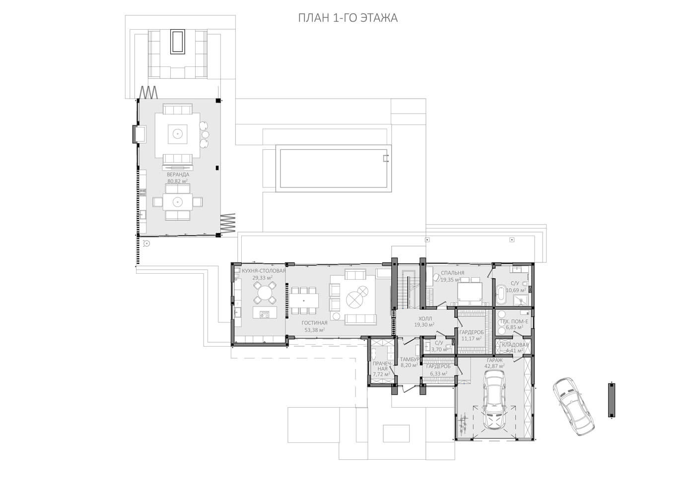 Дом по проекту «Биарриц» – идеальное решение для полноценного проживания и беззаботного отдыха. Помимо кухни-столовой, просторной гостиной, гаража, комплекс включает: