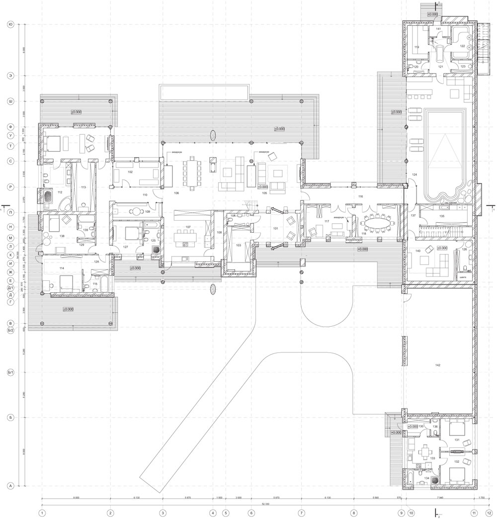 Центральное помещение первого этажа – просторная гостиная. Её акцентами стали два огромных аквариума: один овальной формы (между диванными группами) и второй - прямоугольной (расположенный вдоль стены у столовой группы).
