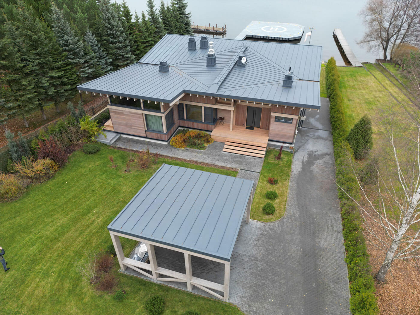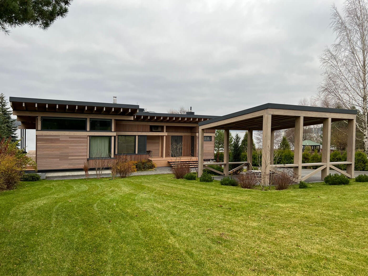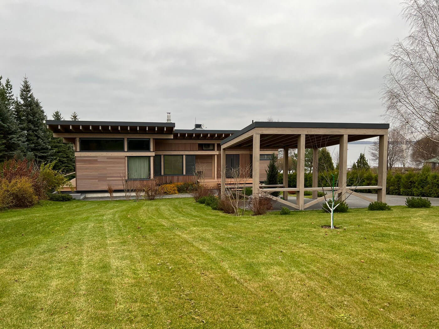 Современный деревянный дом построен в живописном месте на берегу реки. Он является местом отдыха семьи владельца и их друзей, любителей тихого отдыха и природы.
