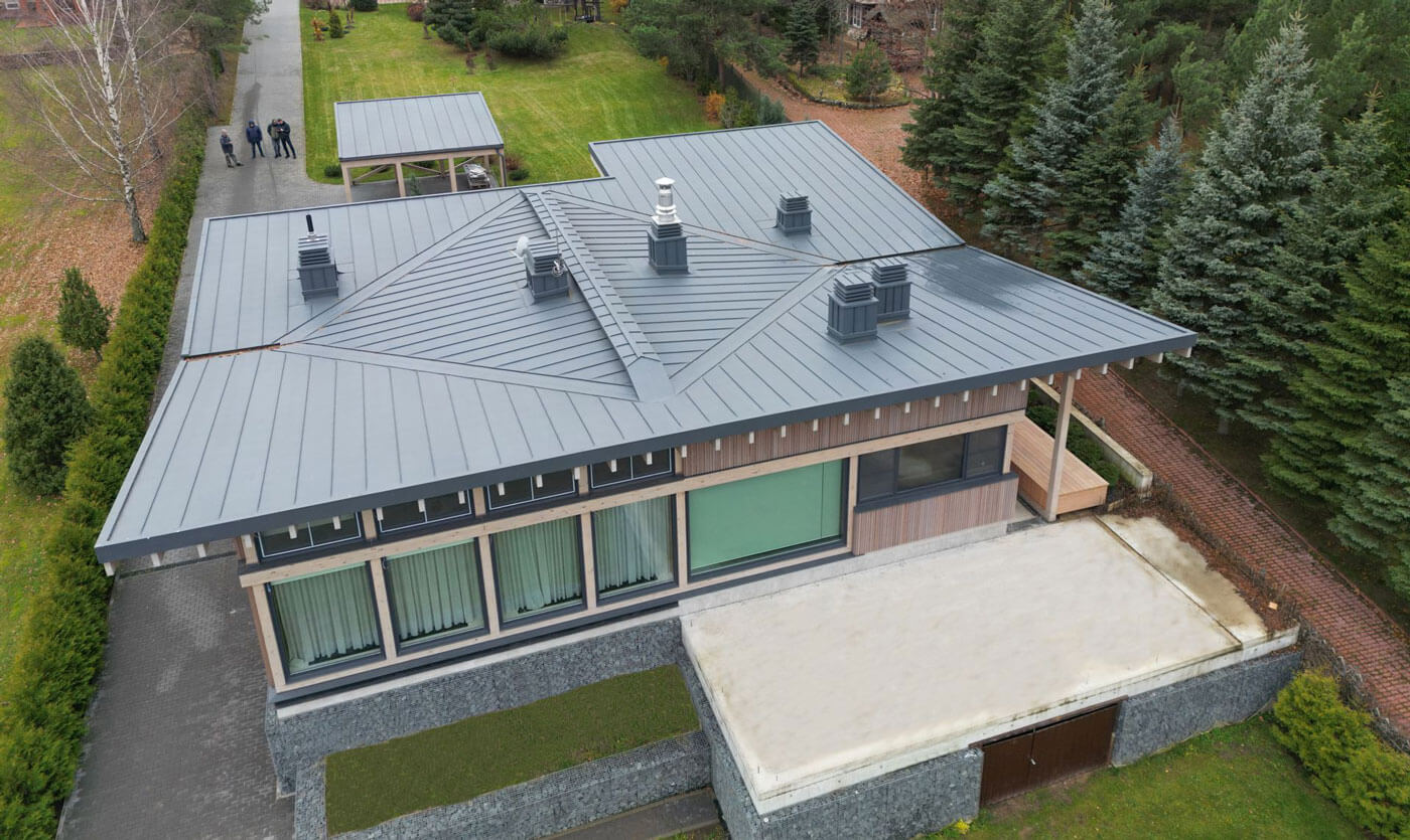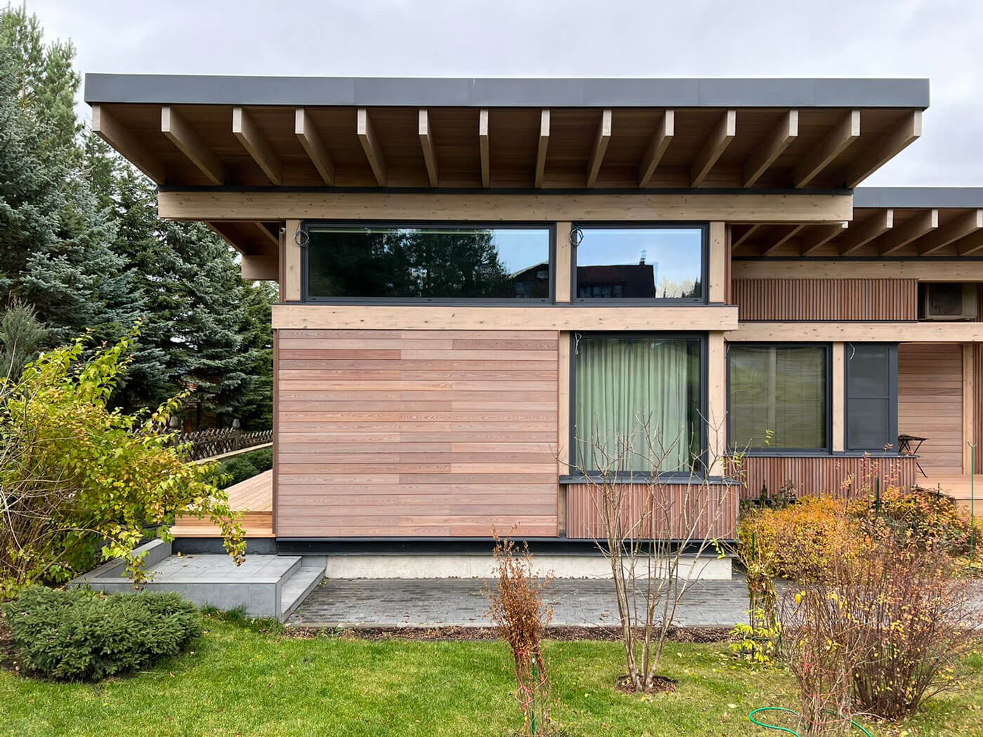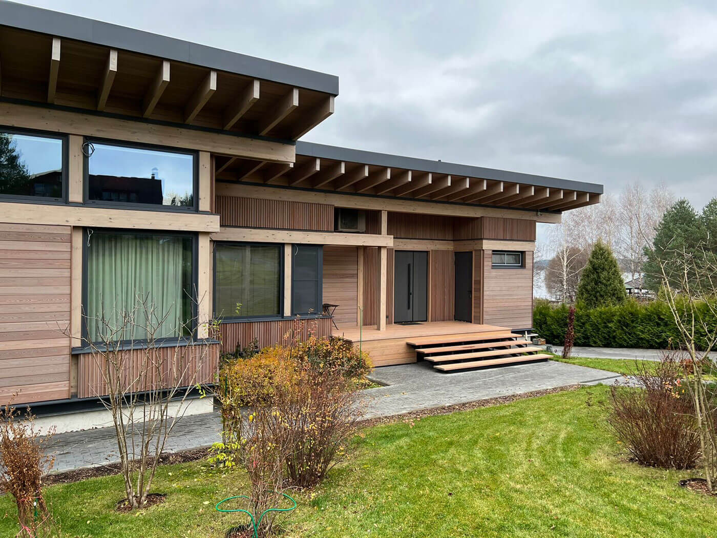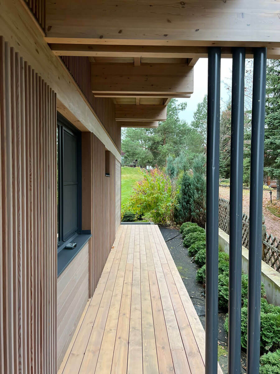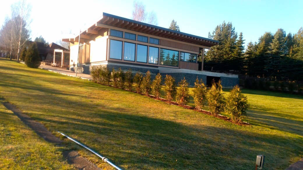 Используя чистые, экологические формы и материалы, фасад гармонично вписывается в окружающий пейзаж. Огромные окна наполняют внутреннее пространство дома светом и воздухом, открывают его обитателям бесконечно прекрасные картины природы, превращая его в предел мечтаний любителей тихого отдыха и природы.