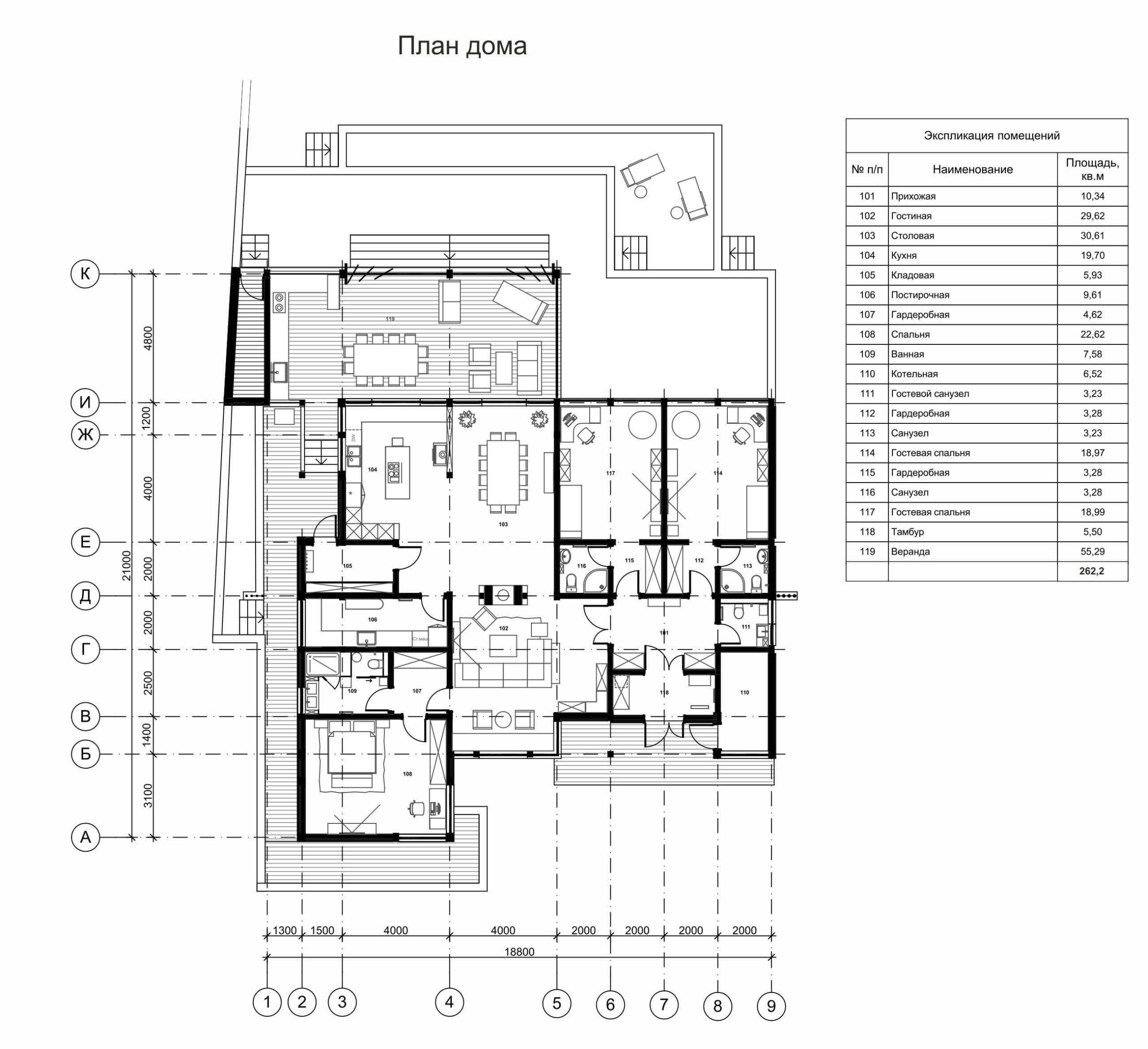 Дом одноэтажный, общей площадью — 260 м2. Каждое помещение в дома было разработано с акцентом на удобство и функциональность. Планировка дома включает в себя спальню хозяев, две обособленные гостевые комнаты, объединяющую их гостиную, кухню-столовую, остеклённую веранду с собственной кухней и зоной отдыха, ряд технических и вспомогательных помещений.