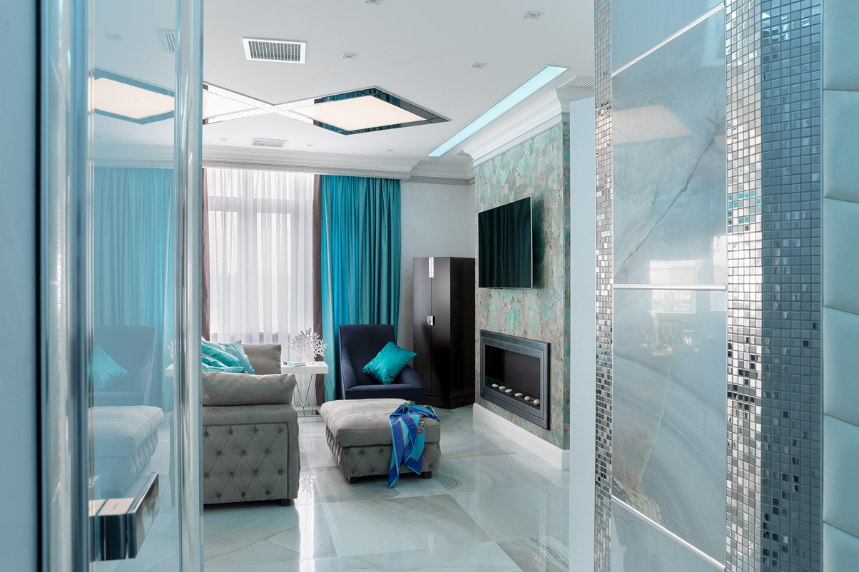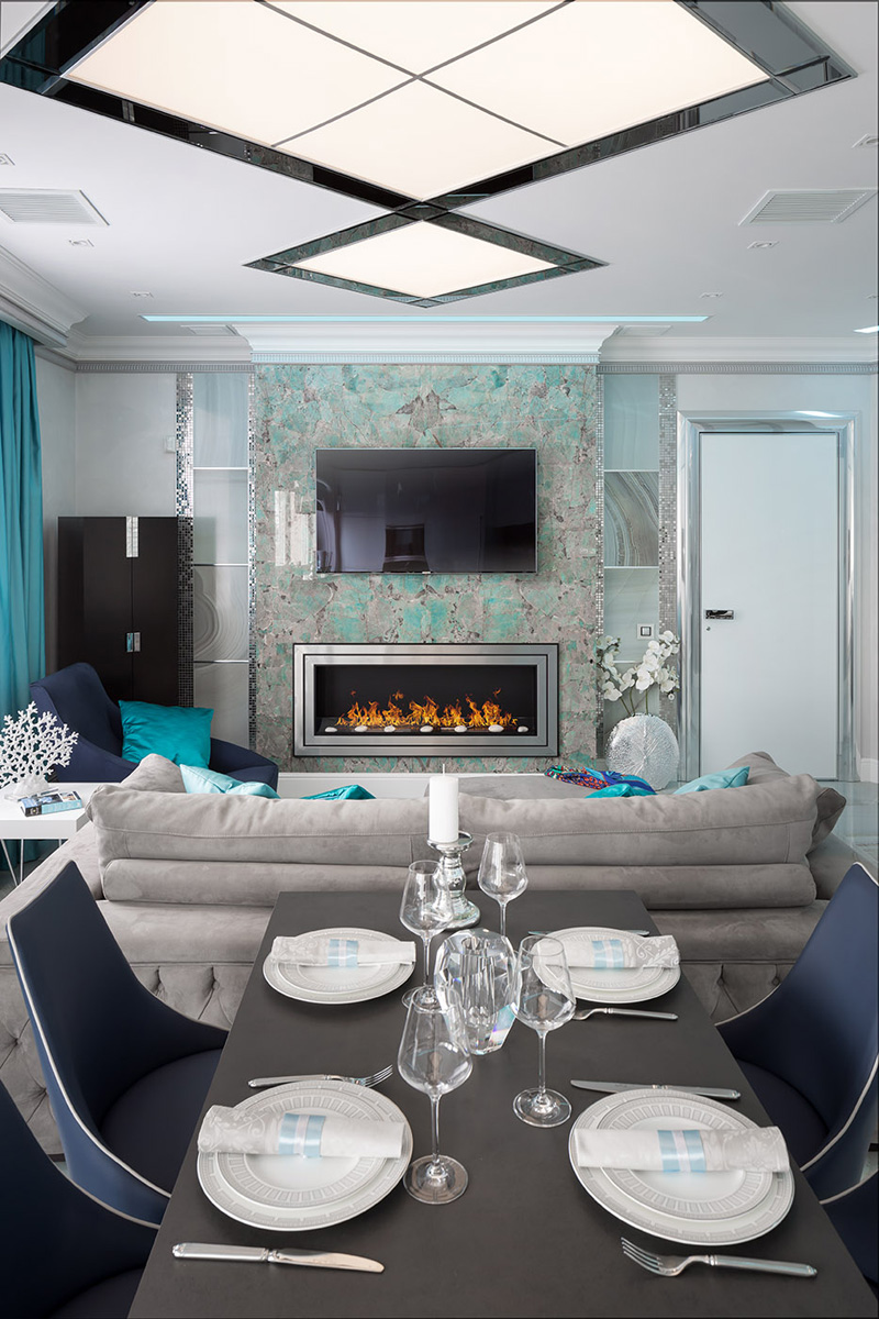 Элегантная гостиная разделена на функциональные зоны с помощью расстановки мебели. Зона отдыха сформирована диваном и креслом, обращенными к встроенному биокамину с широкой панорамной топкой и реалистичным эффектом живого огня. Камин и плазменная панель телевизора над ним закреплены на выступающей конструкции с отделкой из натурального полудрагоценного камня амазонита в редкой бирюзовой гамме. В отделке также присутствуют элементы декора из керамогранита небесного оттенка как и пол, с обрамлением вертикальных линий серебряной мозаикой.