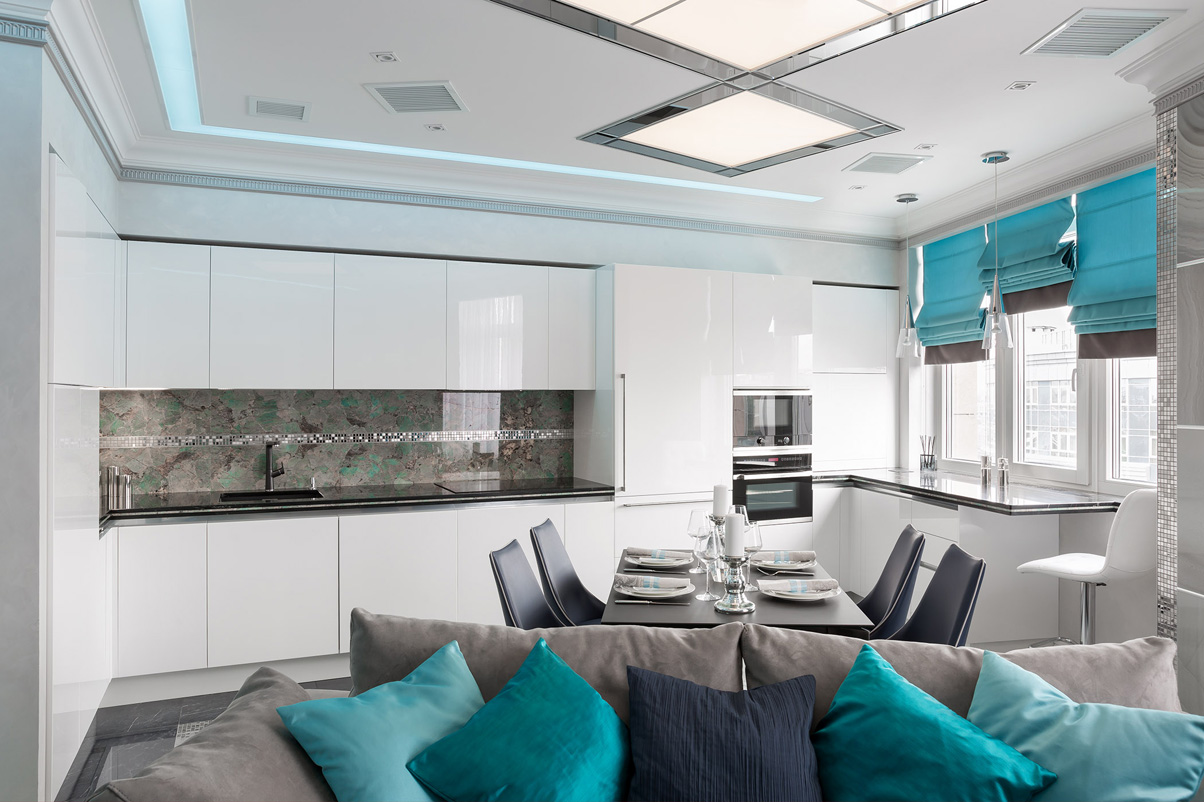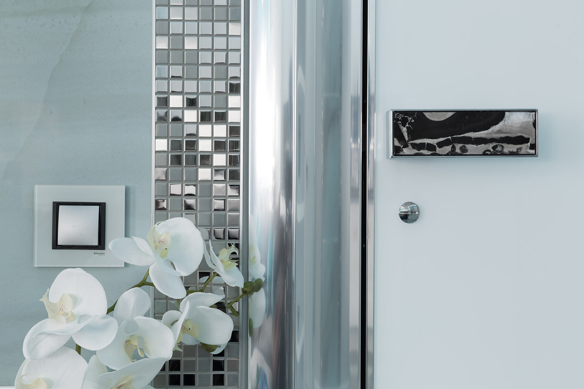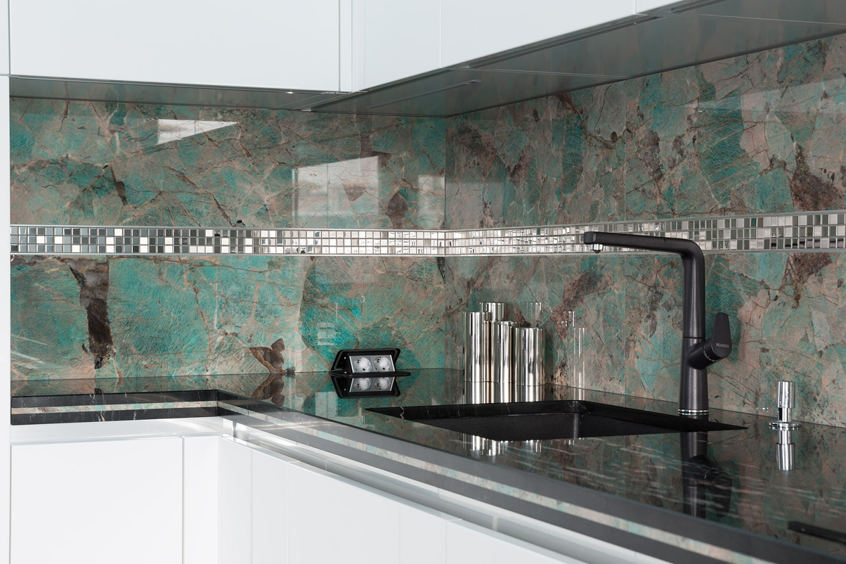 За диваном размещена обеденная группа, рассчитанная как на прием гостей, так и на ужин в кругу семьи. Кухня в нише с минималистской мебелью плавно перетекает в барную стойку у окна с возможностью для быстрых завтраков — отсюда открывается прекрасный вид на Неву с высоты. Кухонный фартук также выполнен из амазонита с вставкой из серебряной мозаики: великолепный графичный рисунок прожилок натурального камня контрастирует со строгими лаконичными кухонными фасадами, покрытыми белым глянцевым лаком. Этот же черный графичный мрамор отразился вставкой в ручках для межкомнатых дверей.