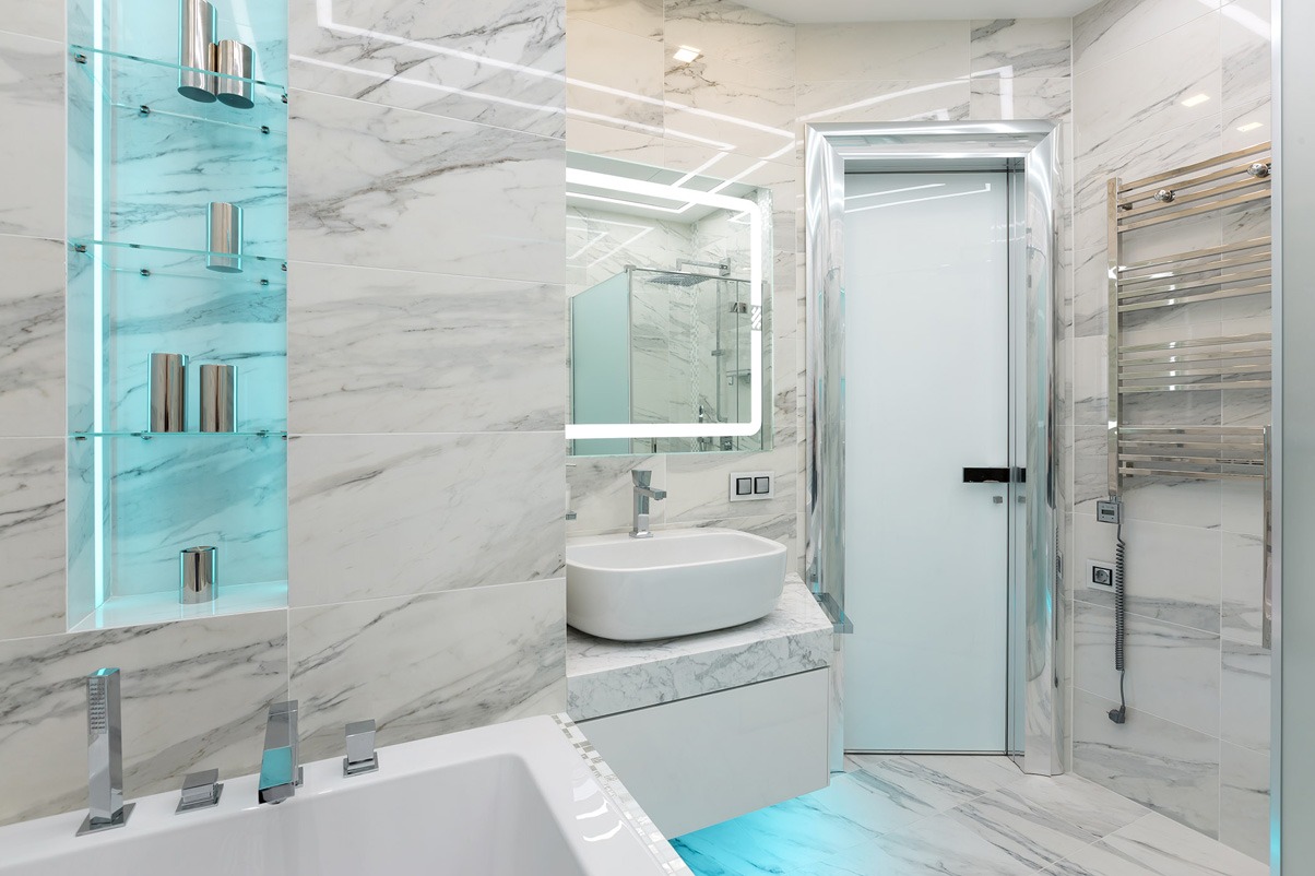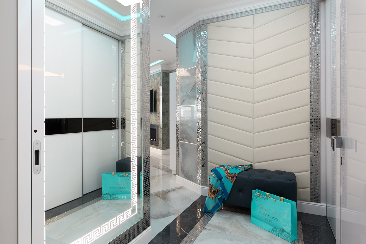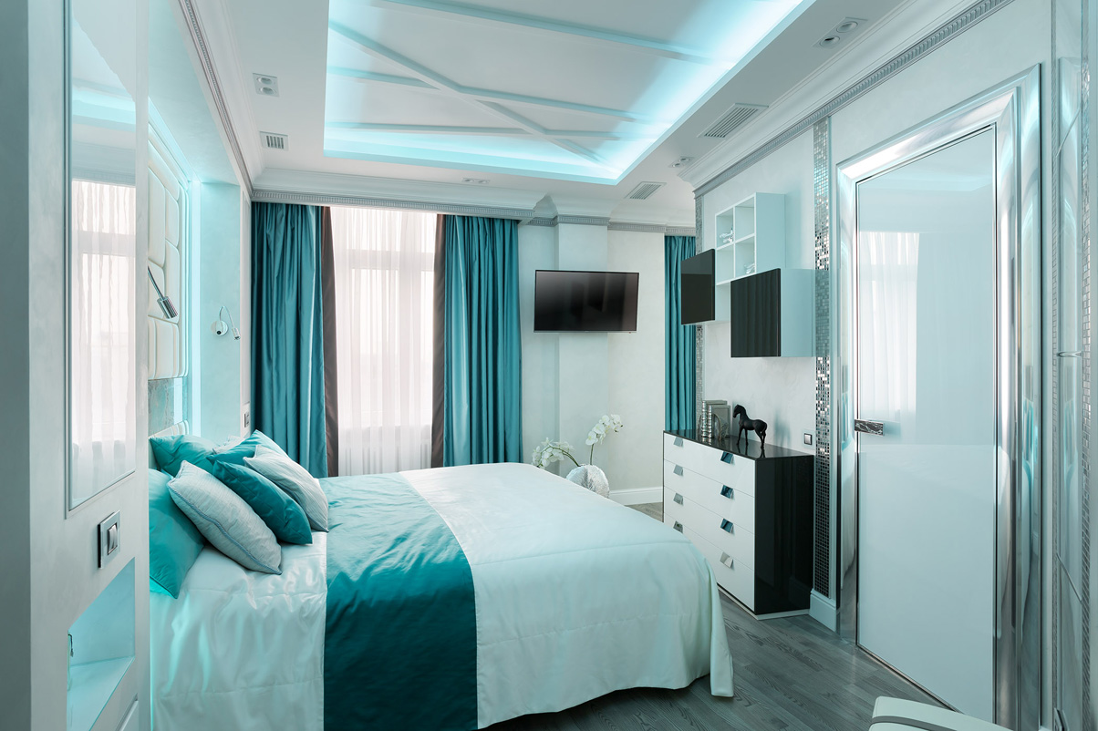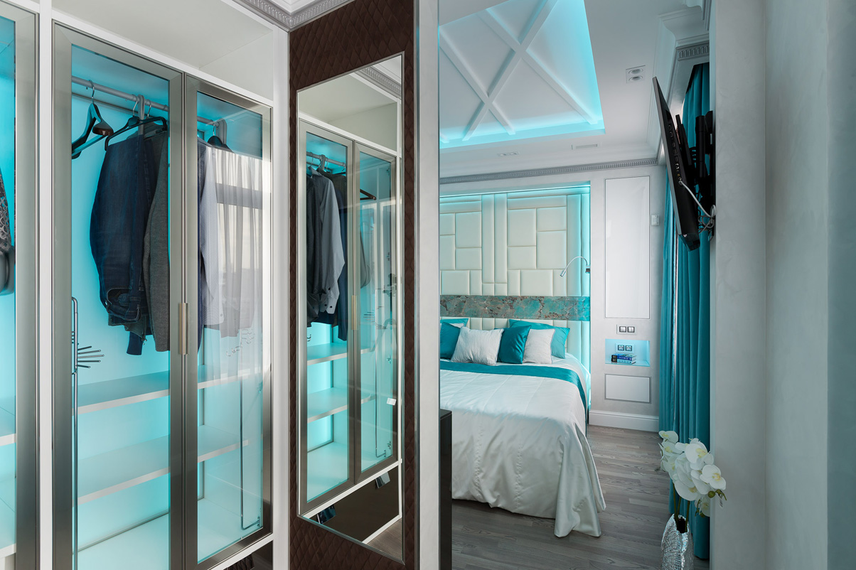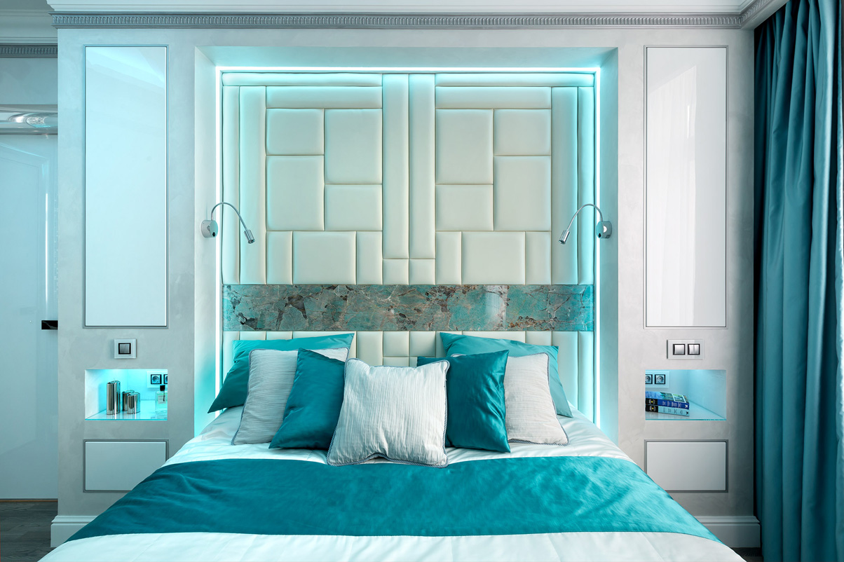 При оформлении спальни были использовагы оригинальные дизайнерские приемы. Ниша в потолке с декоративной неоновой подсветкой создает атмосферное освещение. Стена за изголовьем кровати декорирована мягкими панелями с обивкой из кожи и вставкой из камня амазонита. Как и в гостиной, в интерьере спальни присутствуют полосы из серебристой мозаики. В отделке ванной комнаты мрамор скомбинирован со вставками из мозаики, зеркальными поверхностями и светодиодной неоновой подсветкой.