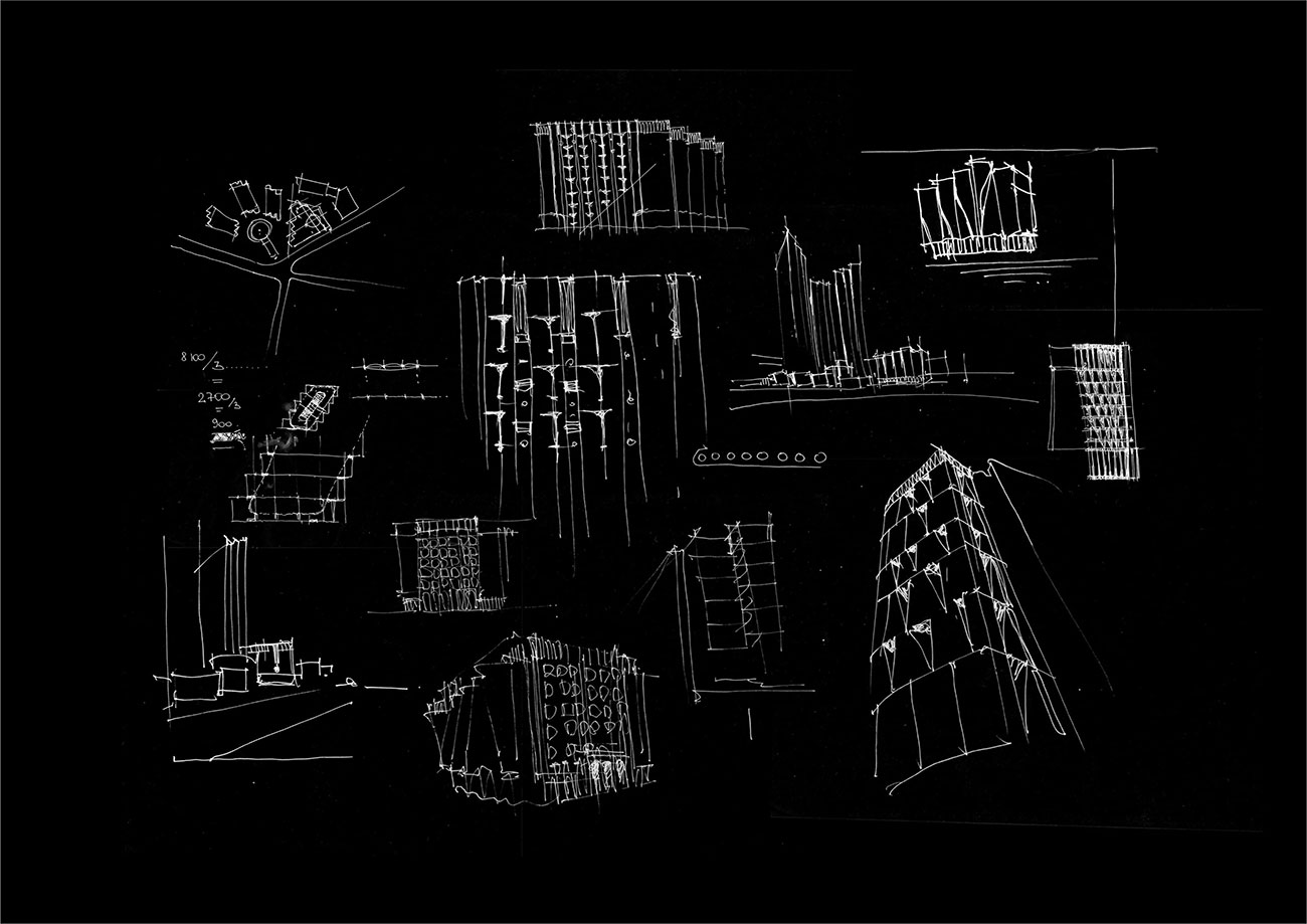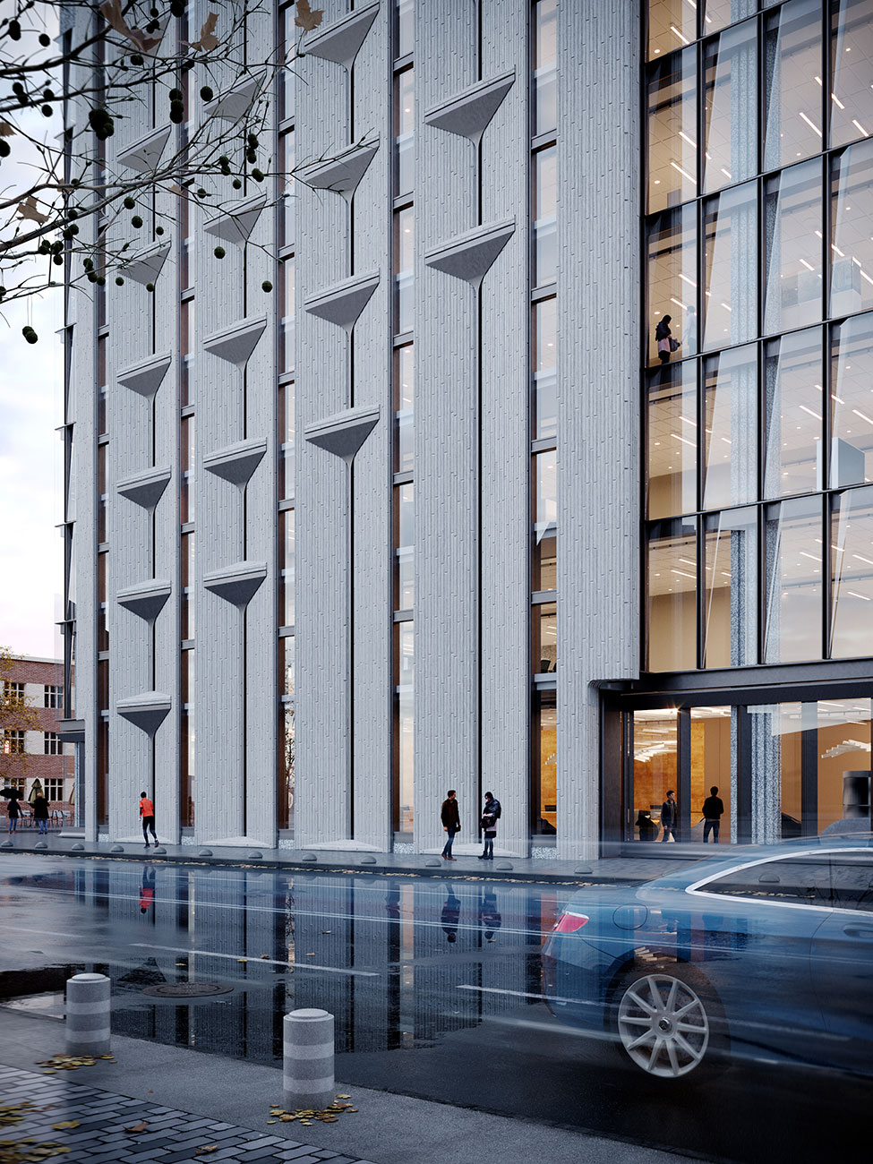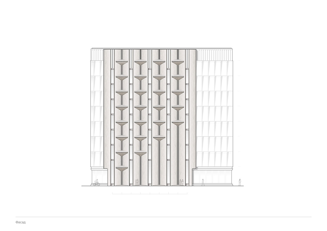 Фасадные решения реализованы посредством сочетания стекла, камня, металла и современных форм использования обозначенных материалов. Основной акцент сделан на части фасада, ориентированной на основную видовую точку со стороны главной улицы. Решение основано на использовании вертикальных простенков с узкими оконными проемами. Простенки облицованы декоративными каменными плитами и композитными металлическими панелями, для того чтобы избежать монотонности и посредством сочетания выразить эстетическую сторону каждого материала.